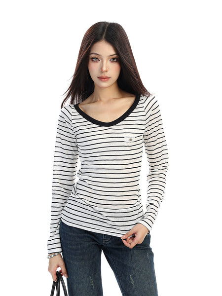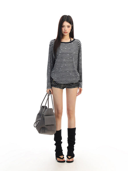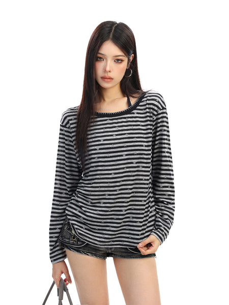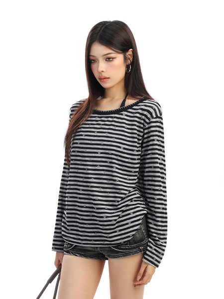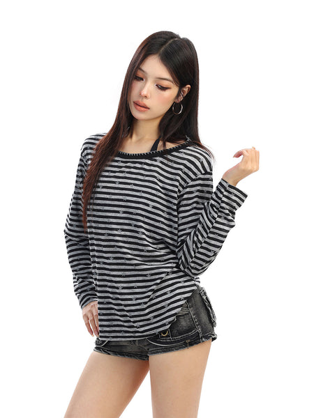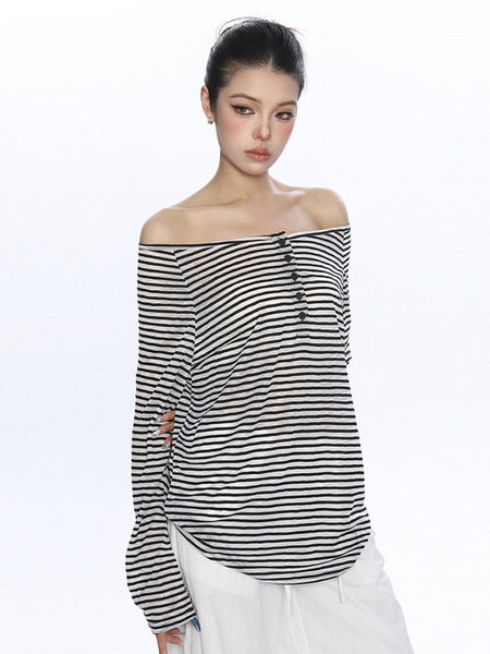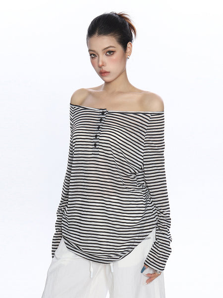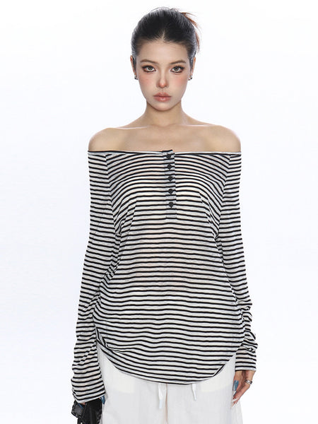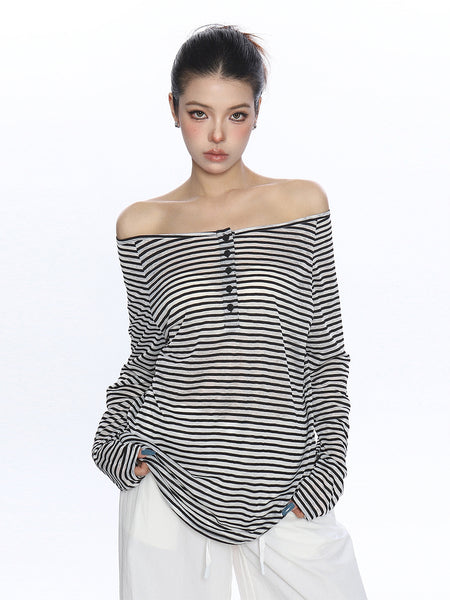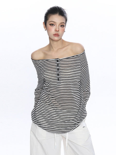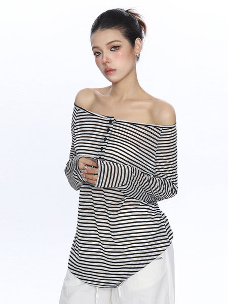 BIGGOLD | Off-Shoulder Striped Long-Sleeved T-S...