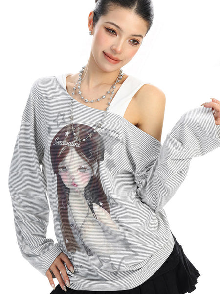 BIGGOLD | Printed Off-Shoulder Long-Sleeved T-S...