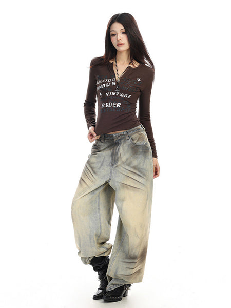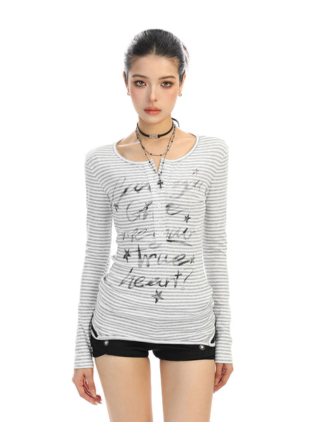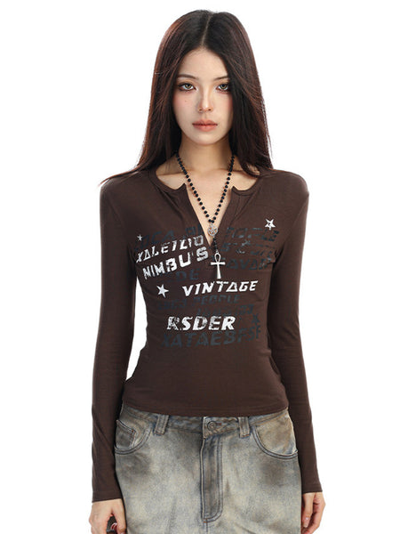 BIGGOLD | Graffiti Letter V-neck Long-sleeved T...