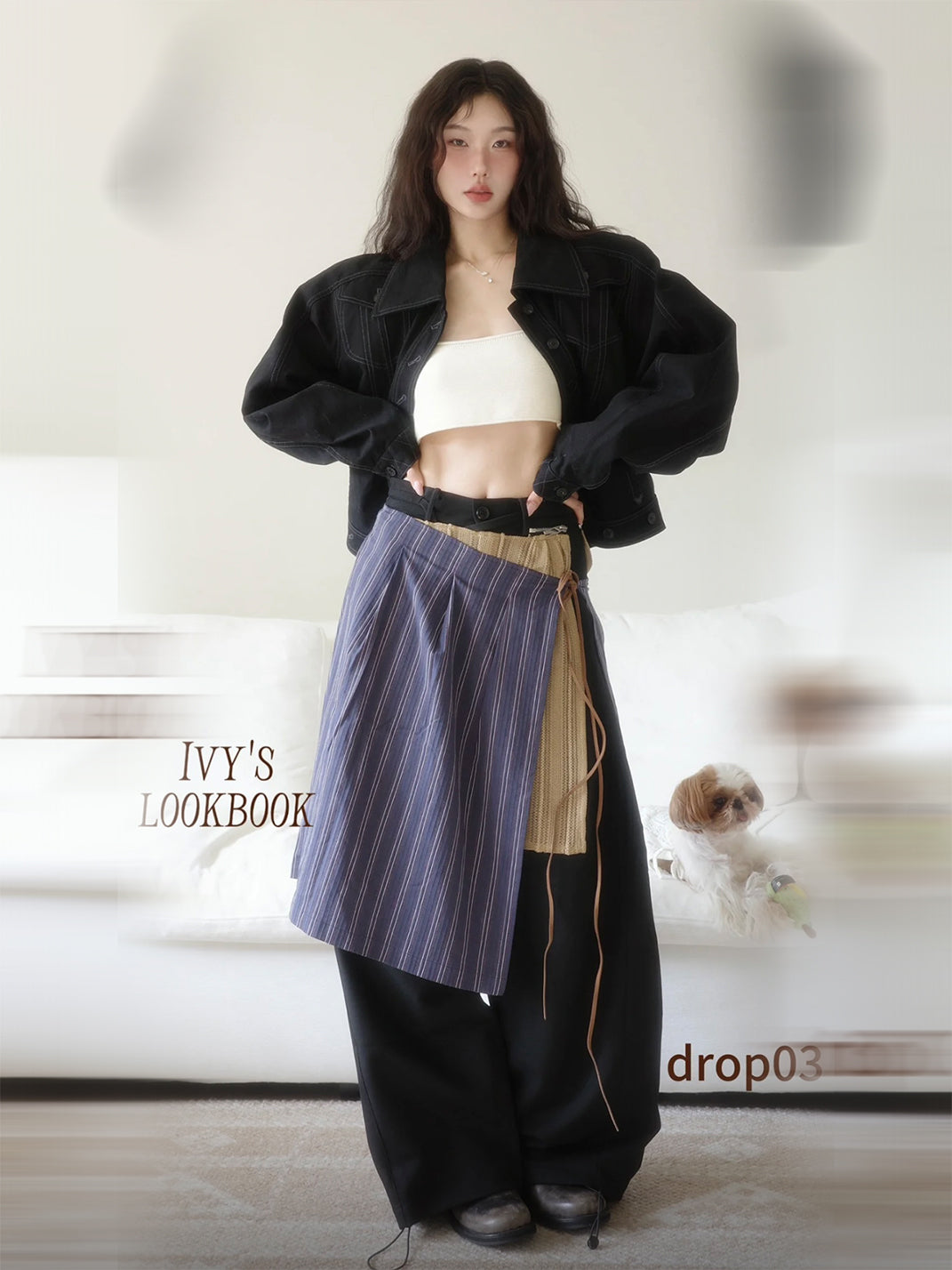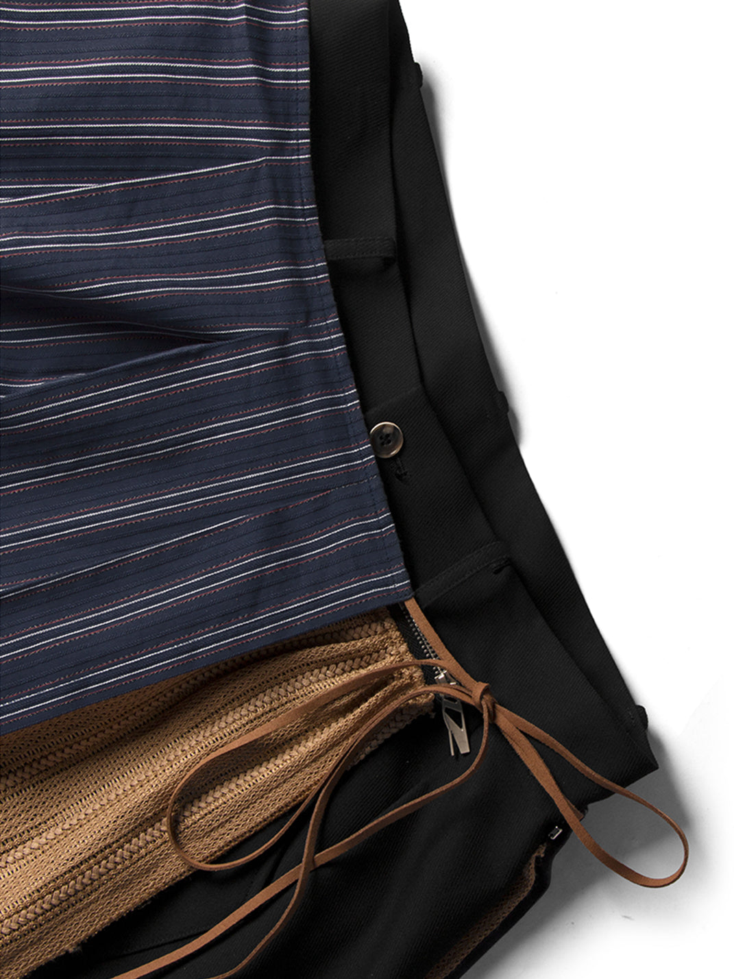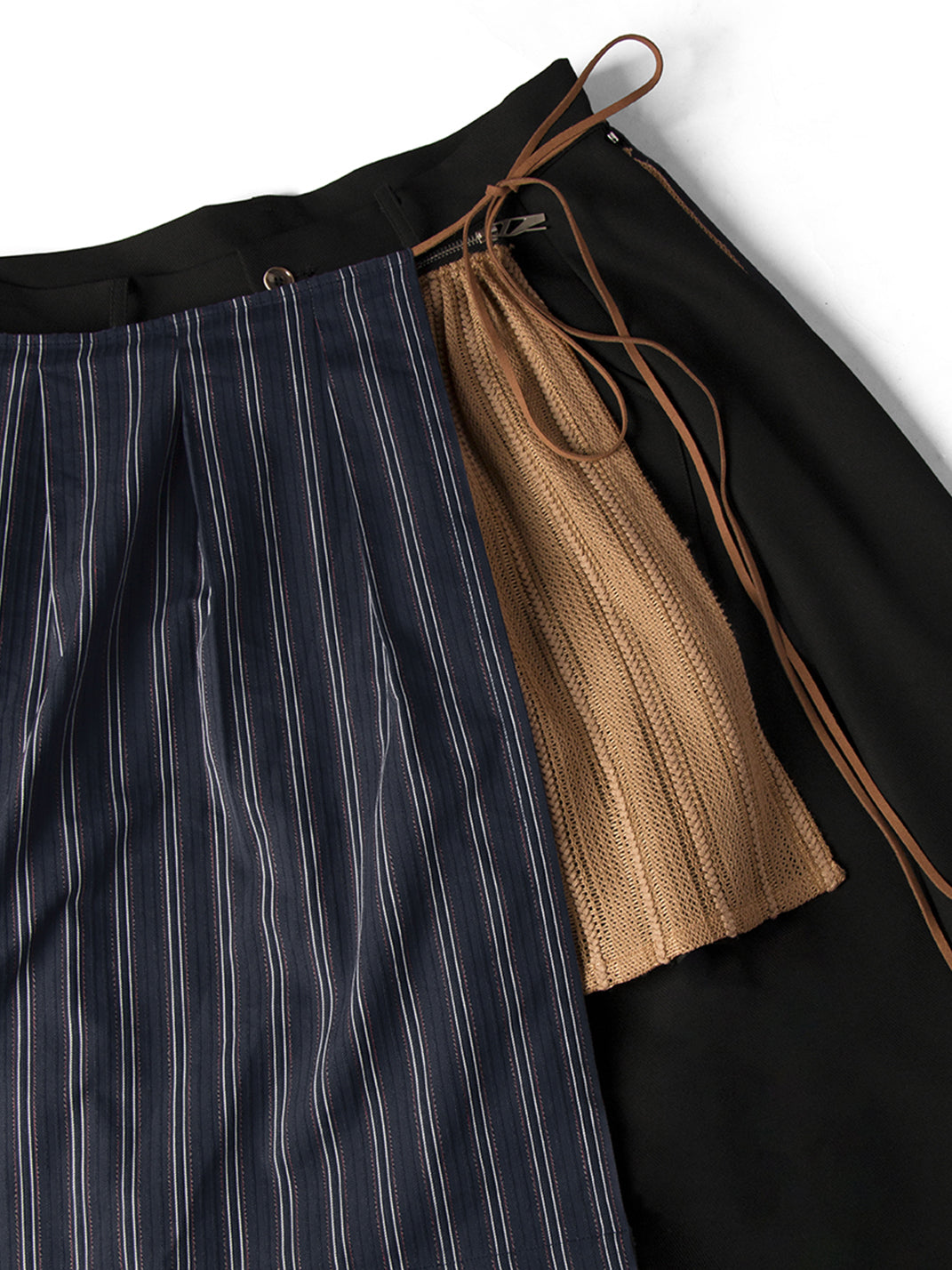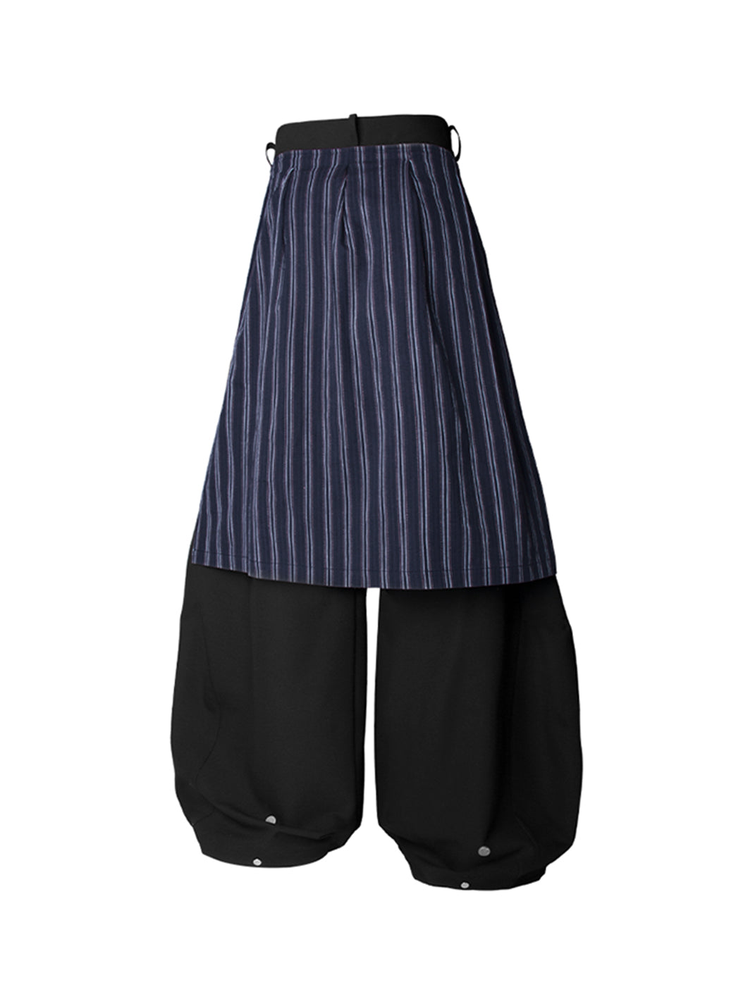 The Layered Striped Apron Wide-Leg Pants reimagine traditional silhouettes through an experimental lens, merging tailored, folkloric, and utilitarian cues. Built from premium fabric, the construction features a sharply pleated apron layer over exaggerated balloon-cut trousers. A contrasting knit panel adds texture and asymmetry, while leather cord ties enhance the layered composition. The wide, rounded legs finish with snap button closures, reinforcing a sculptural, oversized form.