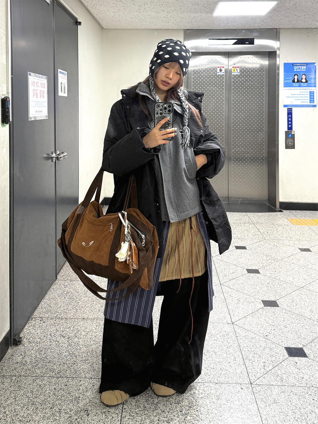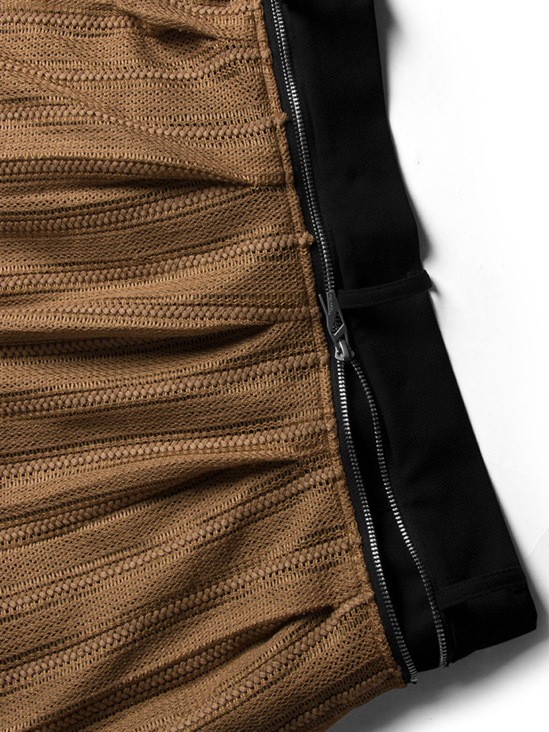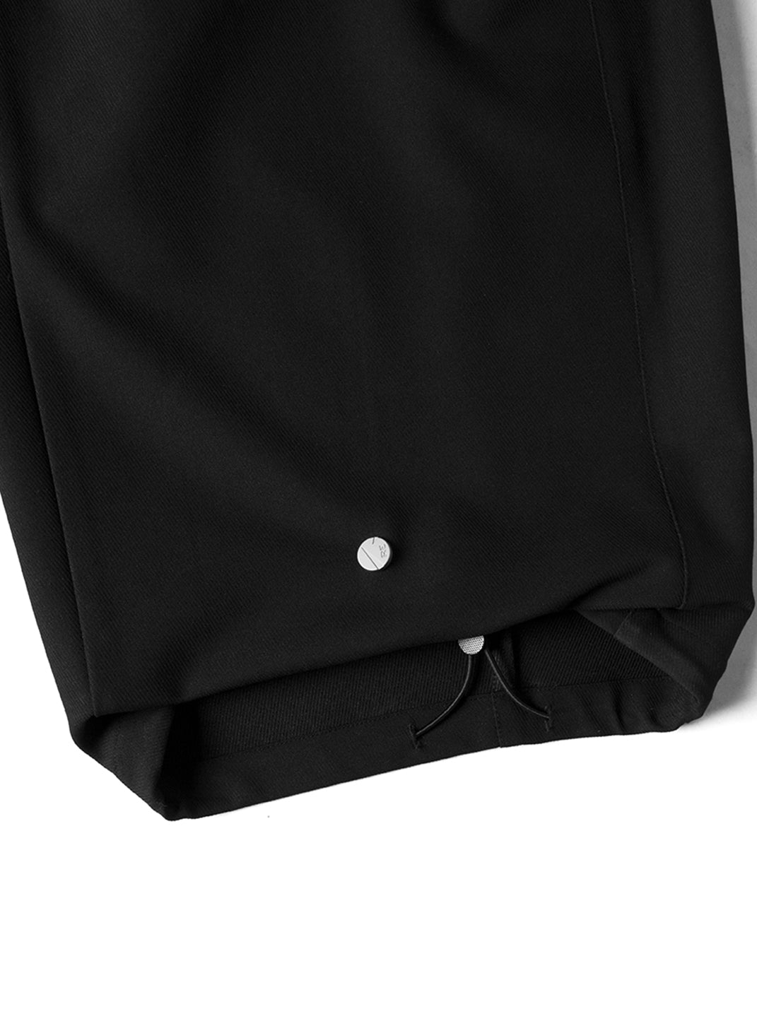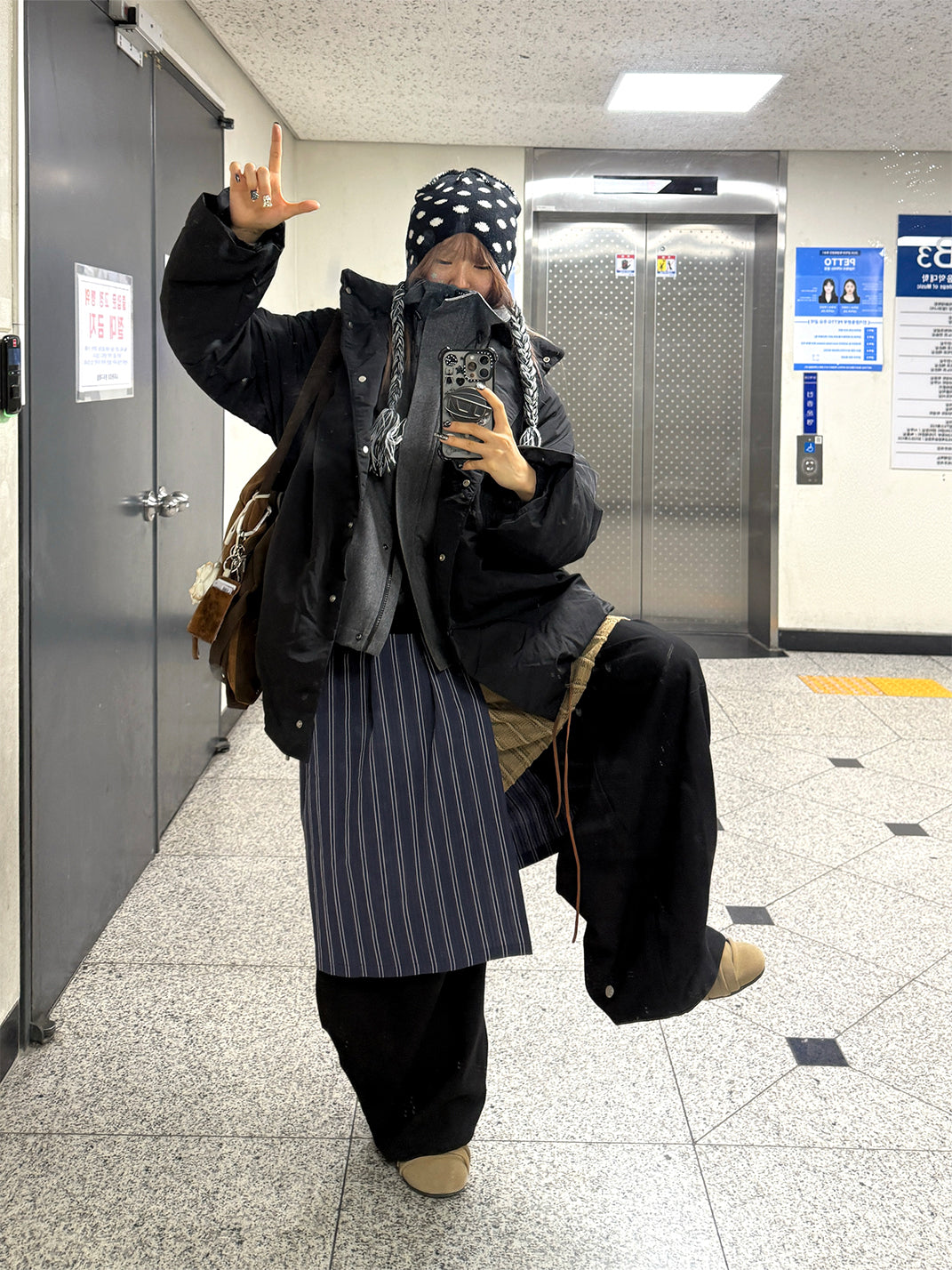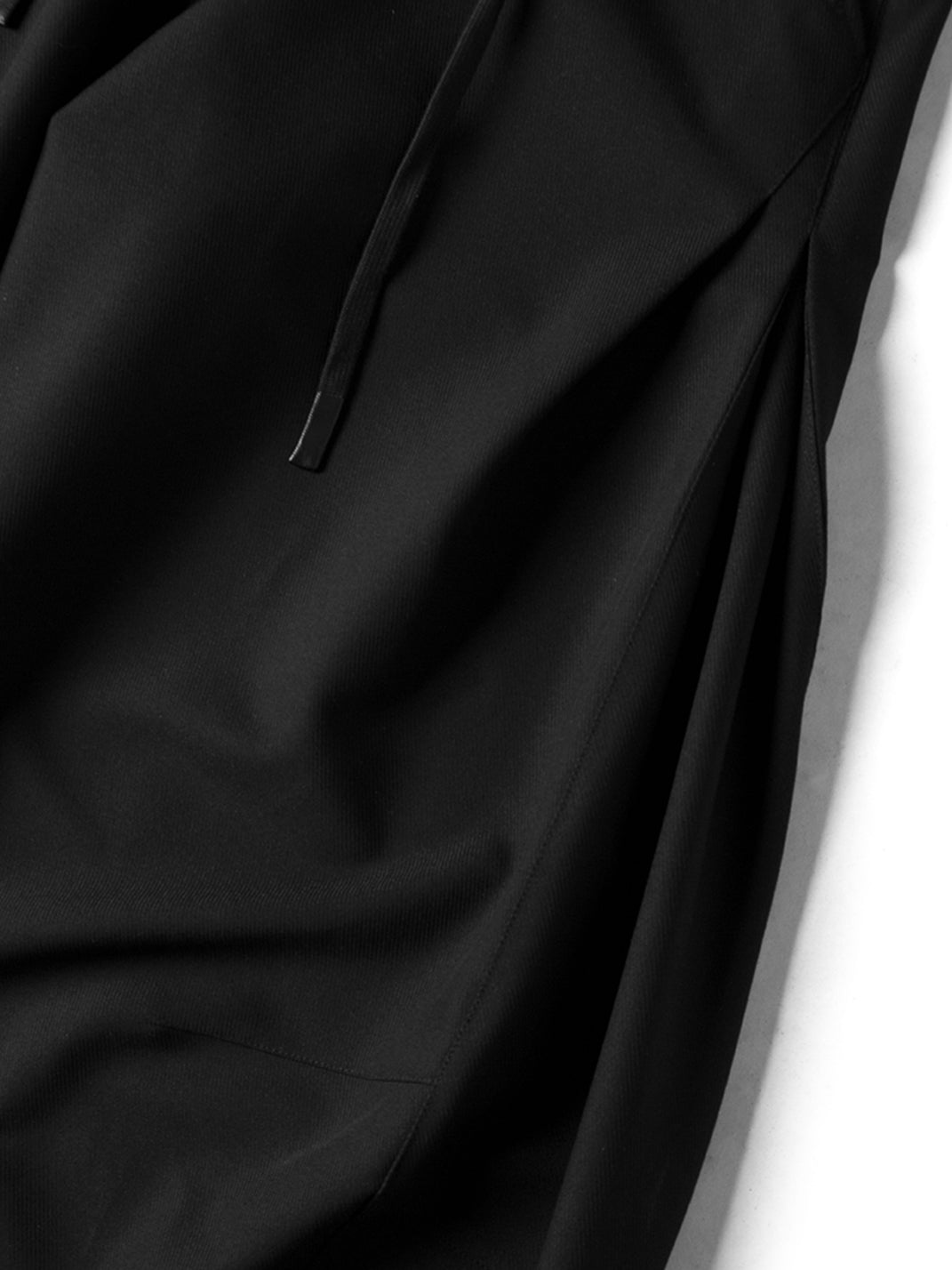 The Layered Striped Apron Wide-Leg Pants reimagine traditional silhouettes through an experimental lens, merging tailored, folkloric, and utilitarian cues. Built from premium fabric, the construction features a sharply pleated apron layer over exaggerated balloon-cut trousers. A contrasting knit panel adds texture and asymmetry, while leather cord ties enhance the layered composition. The wide, rounded legs finish with snap button closures, reinforcing a sculptural, oversized form.