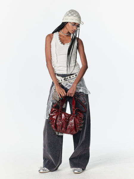 2th Desire | Faded Leather Hardware Printed Denim Patchwork Mini Skirt