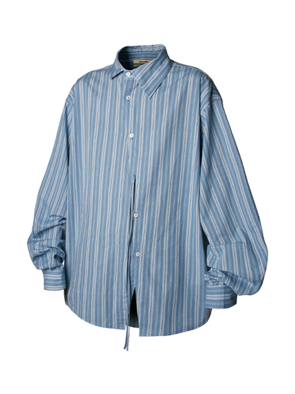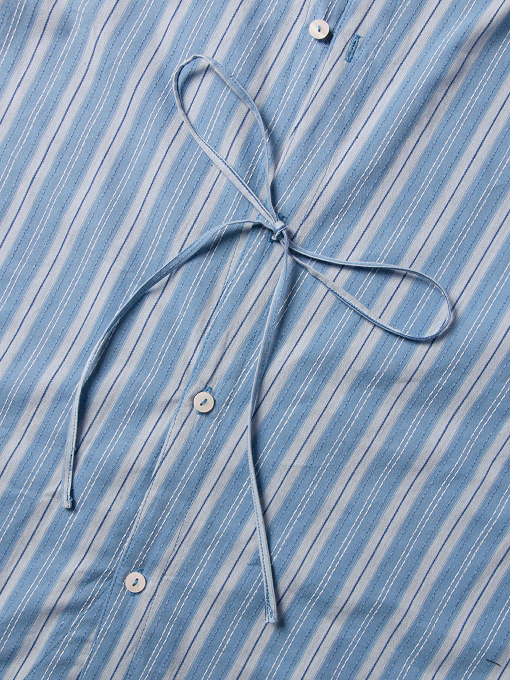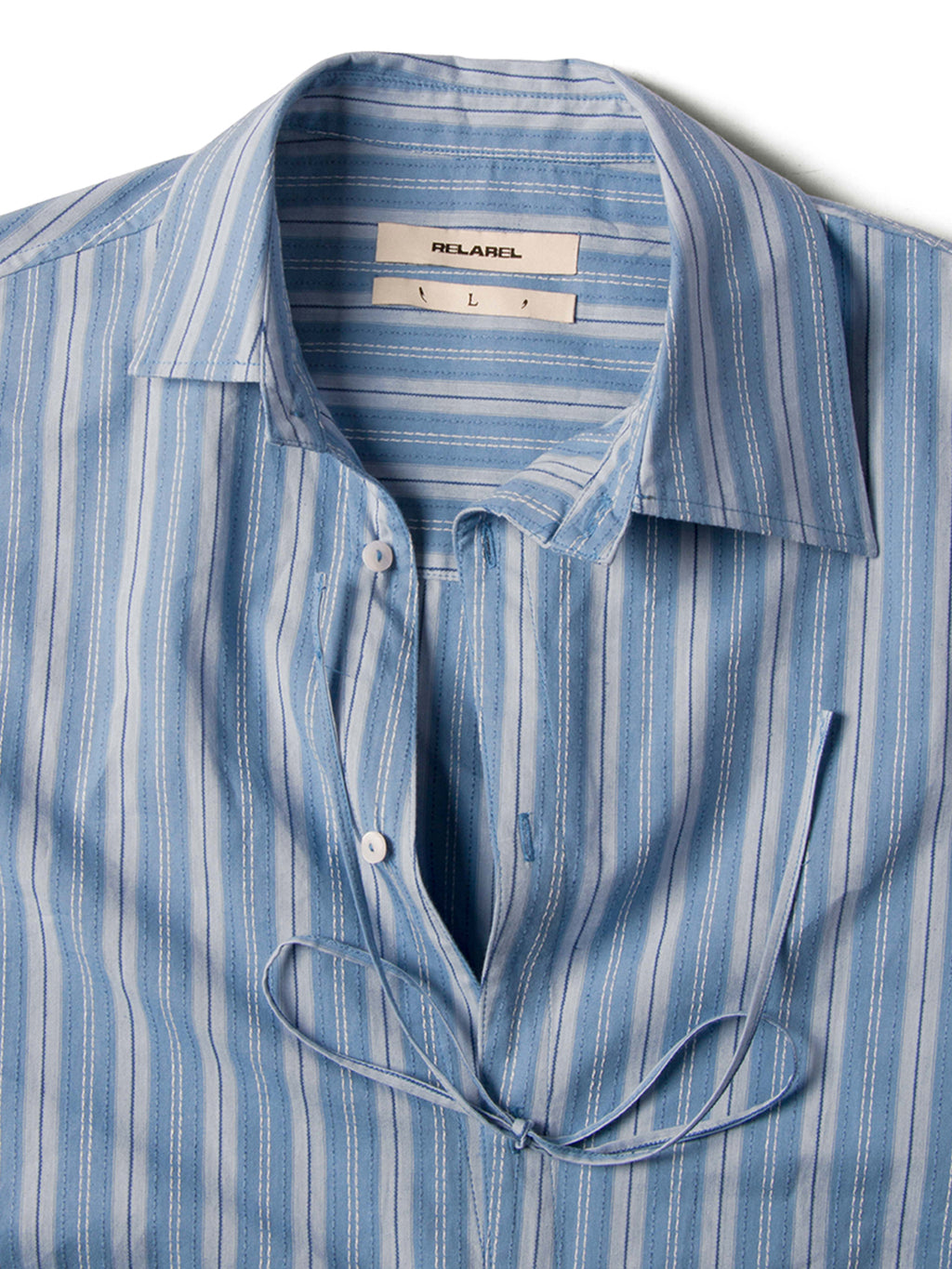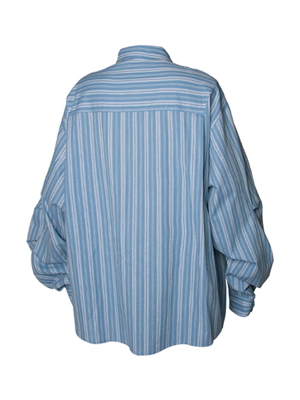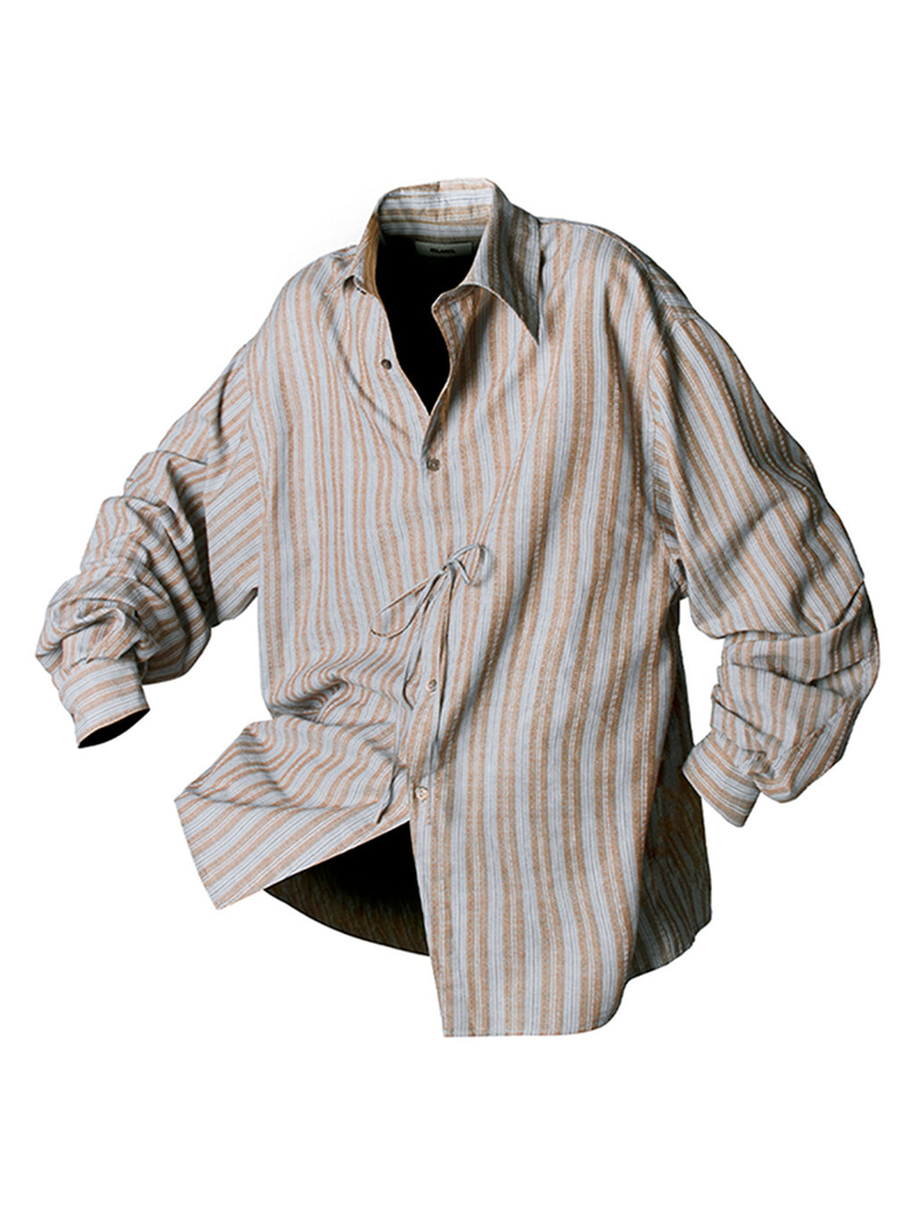 The Stripe Button-Up Oversized Shirt offers a loose, structured silhouette with subtly reworked tailoring. Cut from premium 100% cotton fabric, the design features a crisp vertical stripe pattern and elongated proportions throughout. A tonal front tie detail adds a discreet point of interest, while voluminous sleeves with deep cuffs emphasize the shirt’s sculptural profile. Classic shirting codes reinterpreted through a contemporary lens.