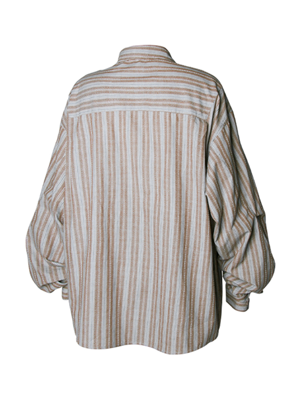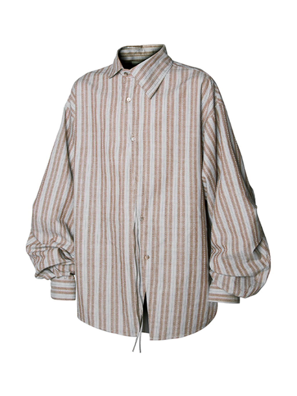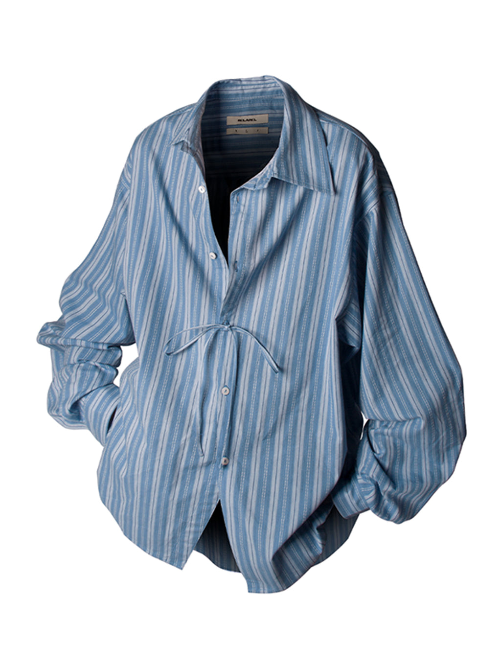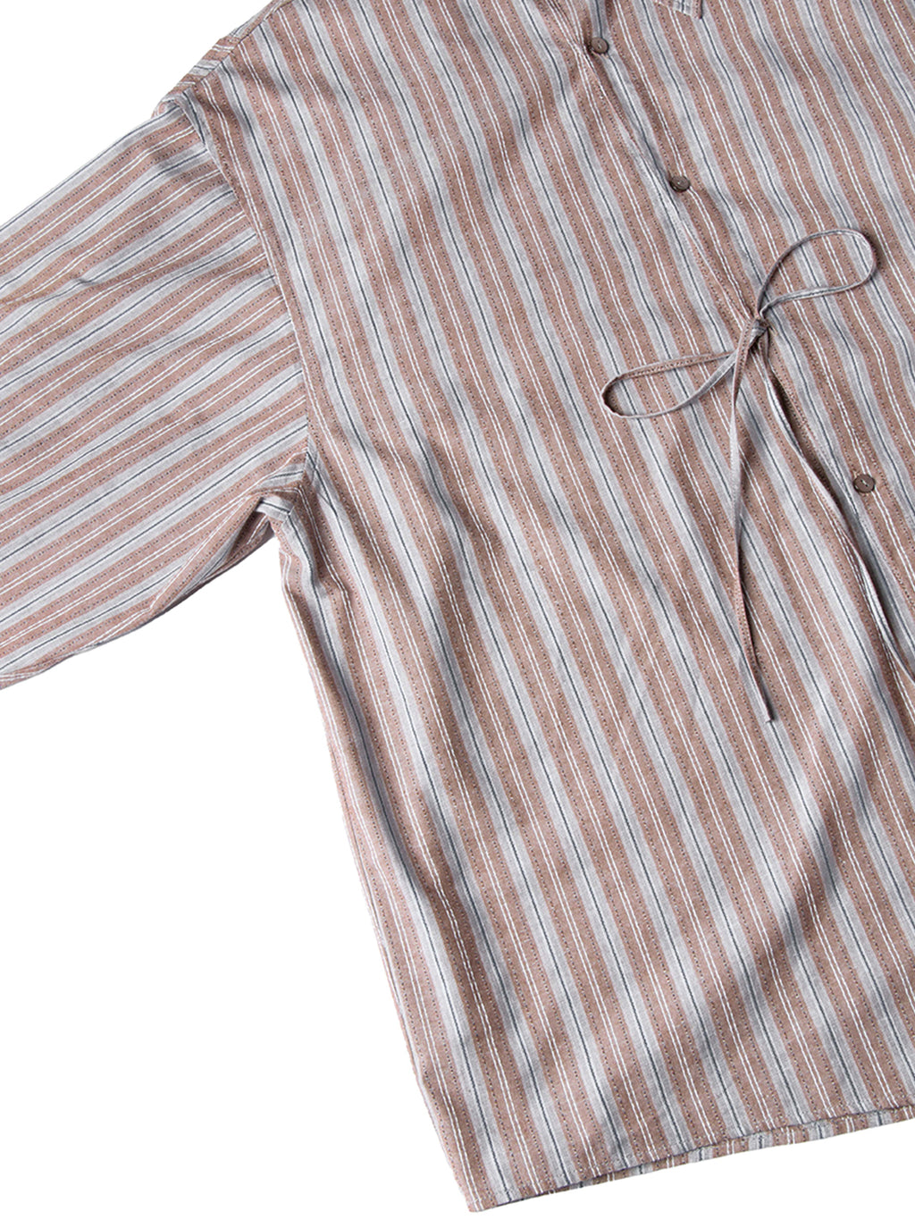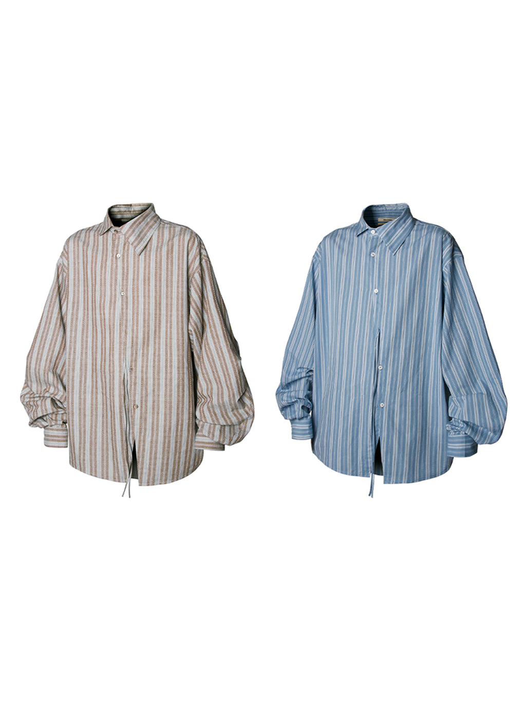 The Stripe Button-Up Oversized Shirt offers a loose, structured silhouette with subtly reworked tailoring. Cut from premium 100% cotton fabric, the design features a crisp vertical stripe pattern and elongated proportions throughout. A tonal front tie detail adds a discreet point of interest, while voluminous sleeves with deep cuffs emphasize the shirt’s sculptural profile. Classic shirting codes reinterpreted through a contemporary lens.