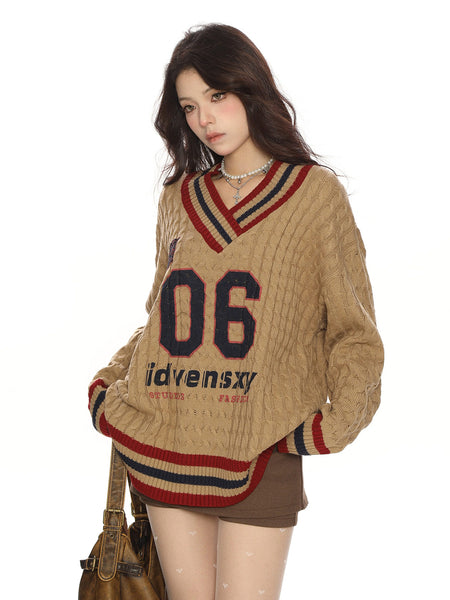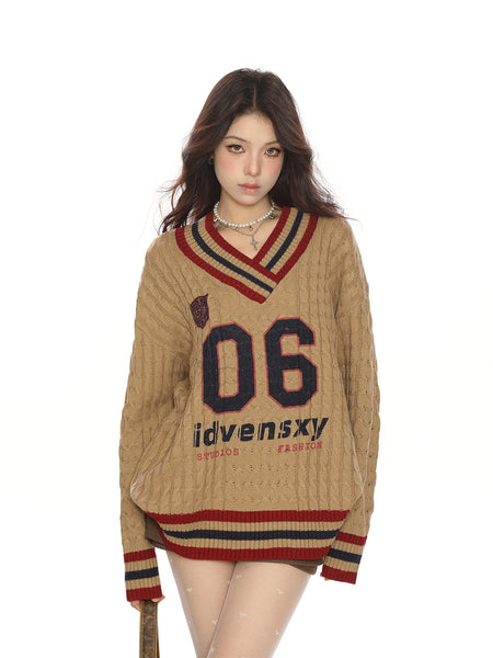 BIGGOLD | Color-Blocked V-Neck Cable Knit Sweater
