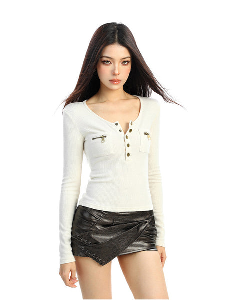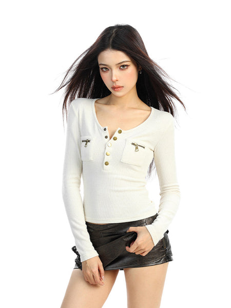 BIGGOLD | Zippered Pocket V-Neck Long Sleeve
