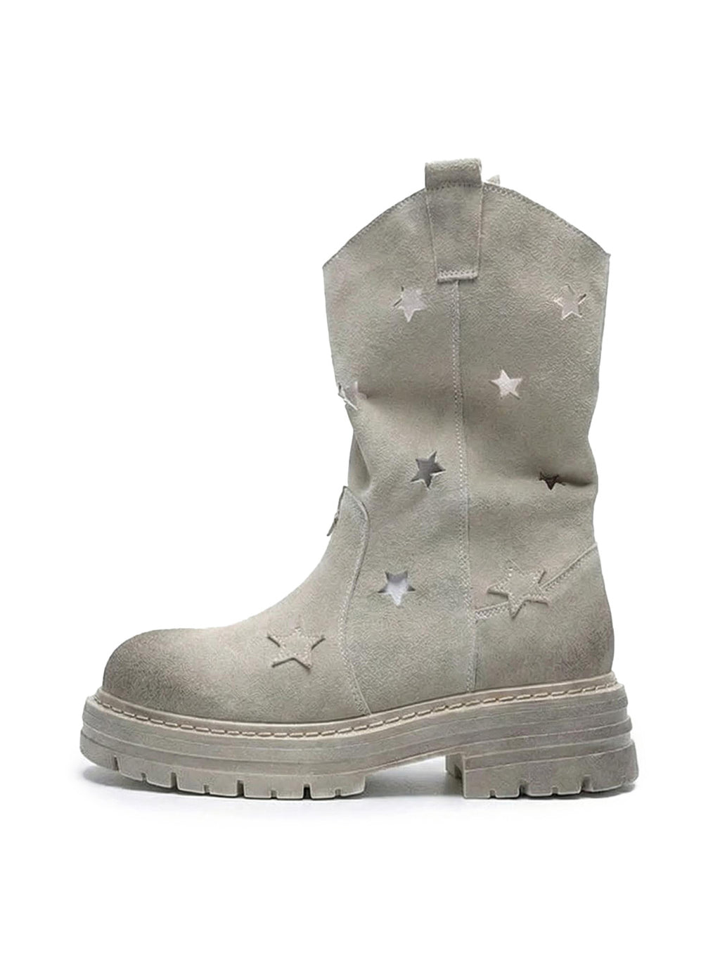 Step up your style game with these statement boots featuring a playful all-over star cutout design. Crafted with a soft suede-like finish, these mid-calf boots offer both comfort and edge. The chunky sole provides durability and height without compromising on stability, making them perfect for everyday wear or adding flair to a bold outfit. Pull tabs at the top allow for easy slip-on access, while the intricate stitching adds a touch of craftsmanship to the modern silhouette. Ideal for trendsetters looking to combine fun details with practical design.