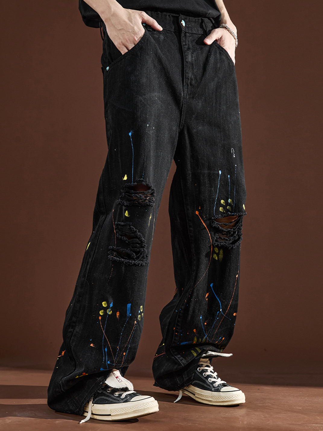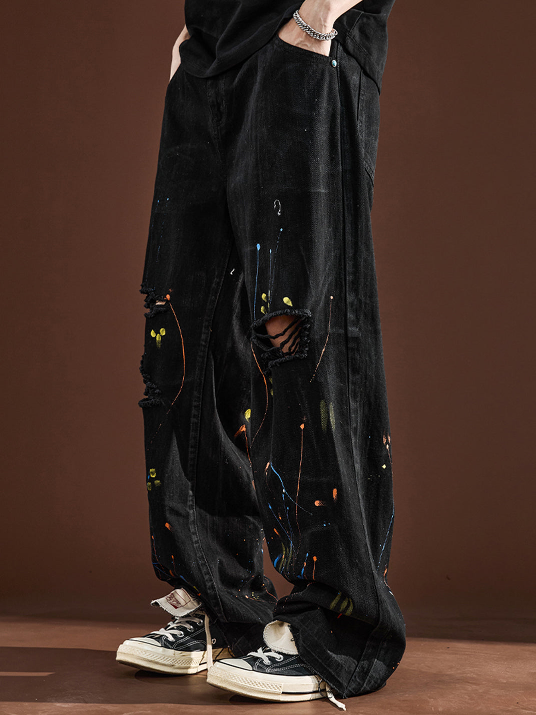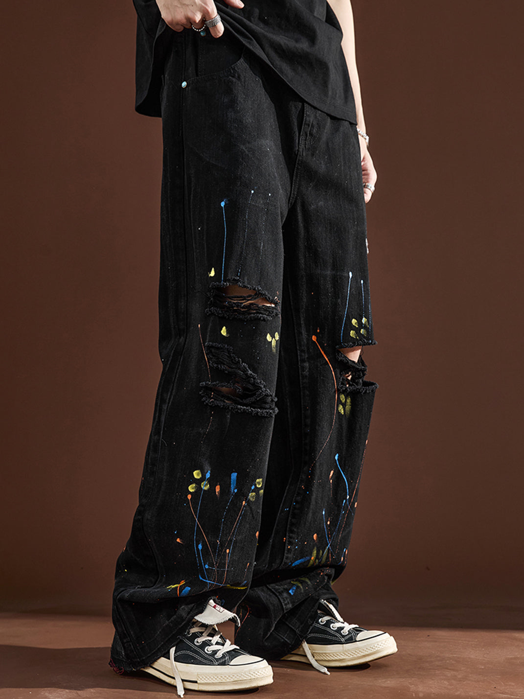 GURBAKS | Street Style Paint Splatter Ripped Wide-Leg Jeans Skip to content