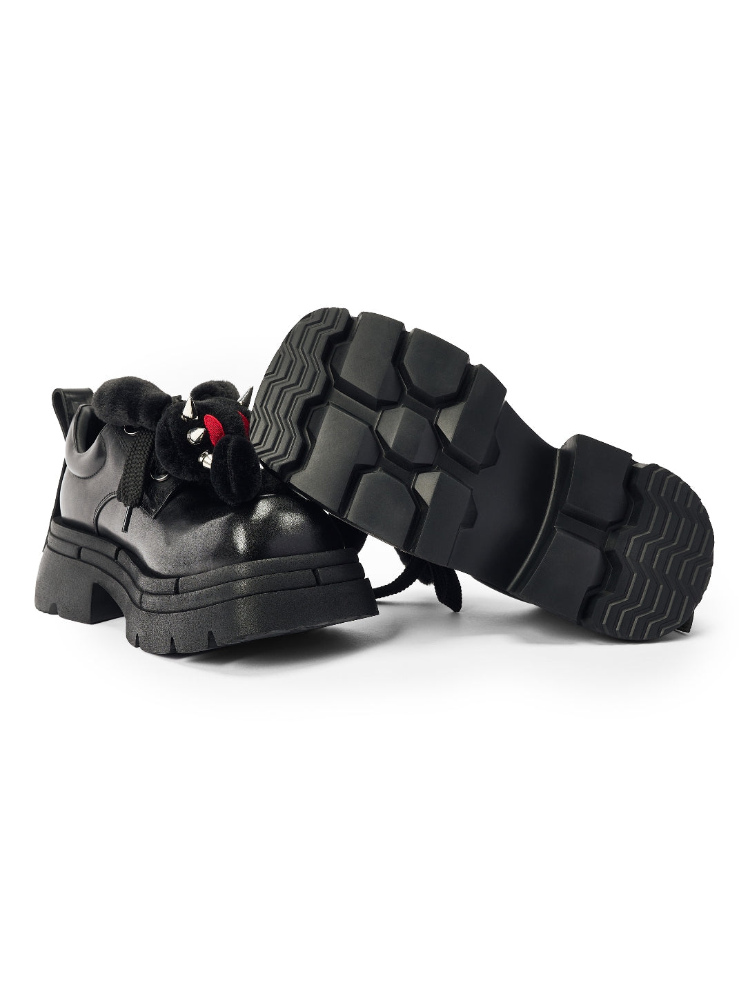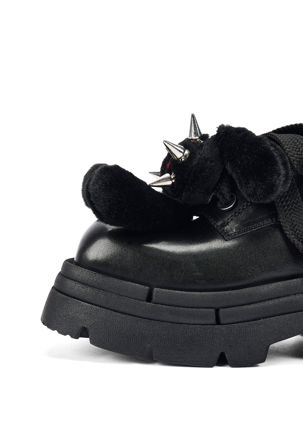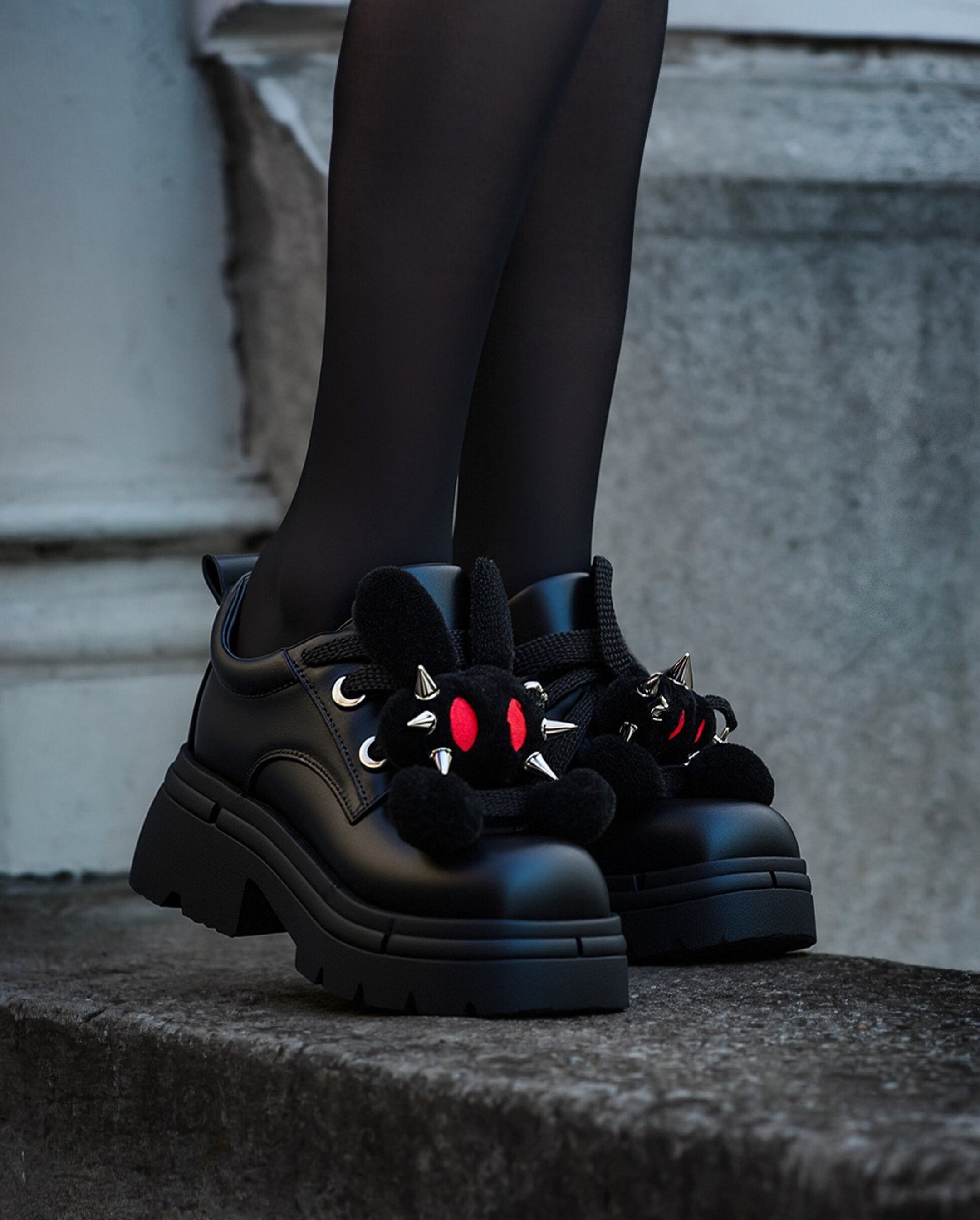 Design Concept: Nocturne . Oraculum. A uniquely lustrous horsehide upper, a rugged plush toy, and cool metal rivets embody theavant-garde aesthetic of "contradictory symbiosis." A thick, multi-layered composite sole with an aggressive serrated patterncreates a visually heightened silhouette while projecting a boundary-breaking presence that defies convention.