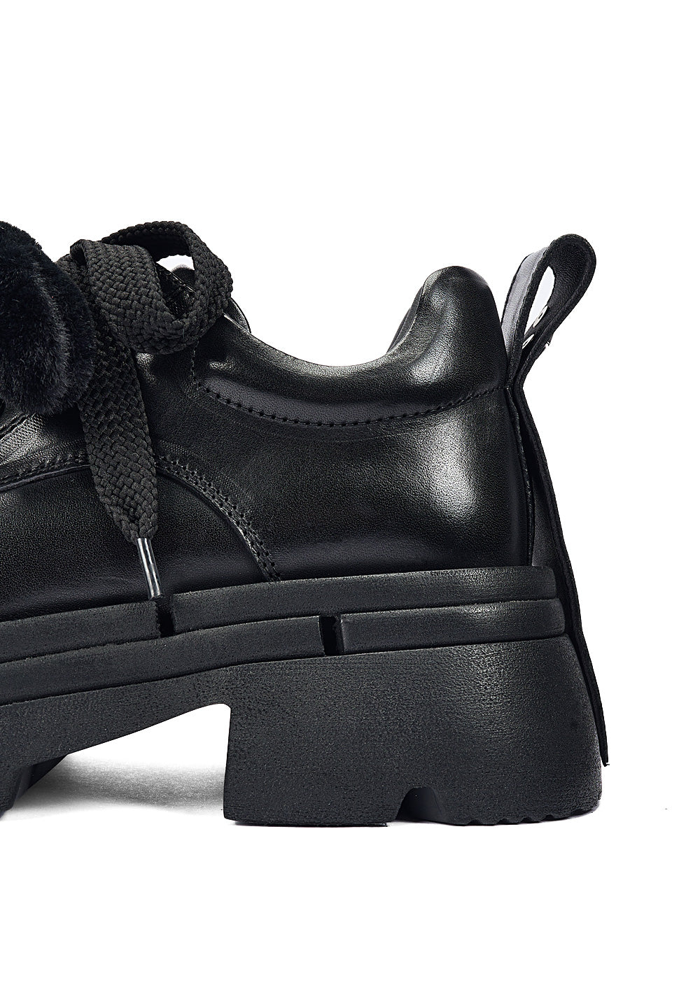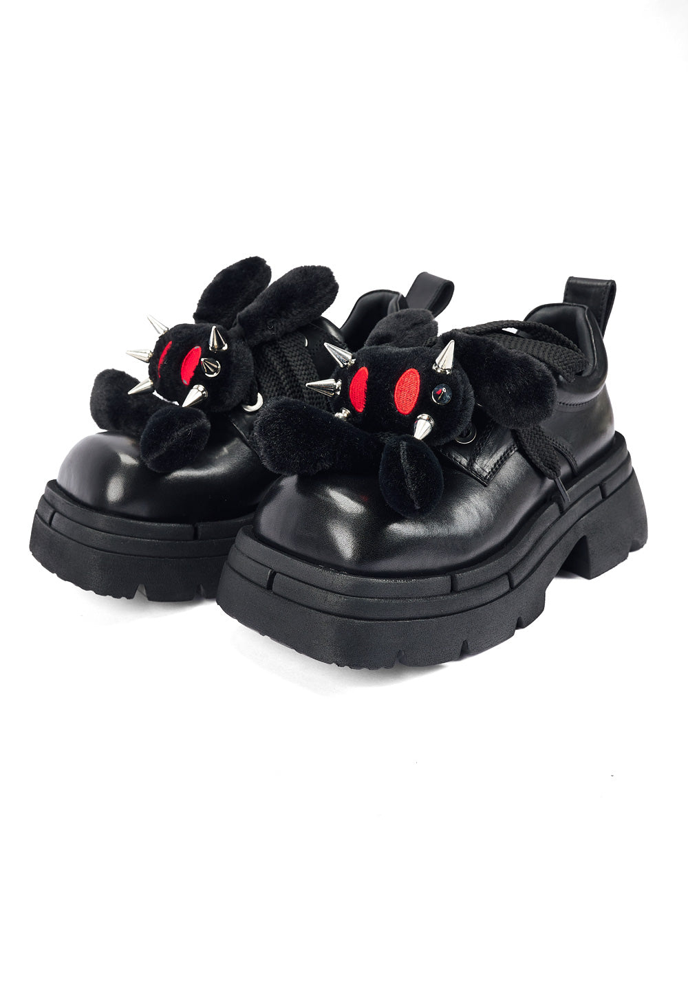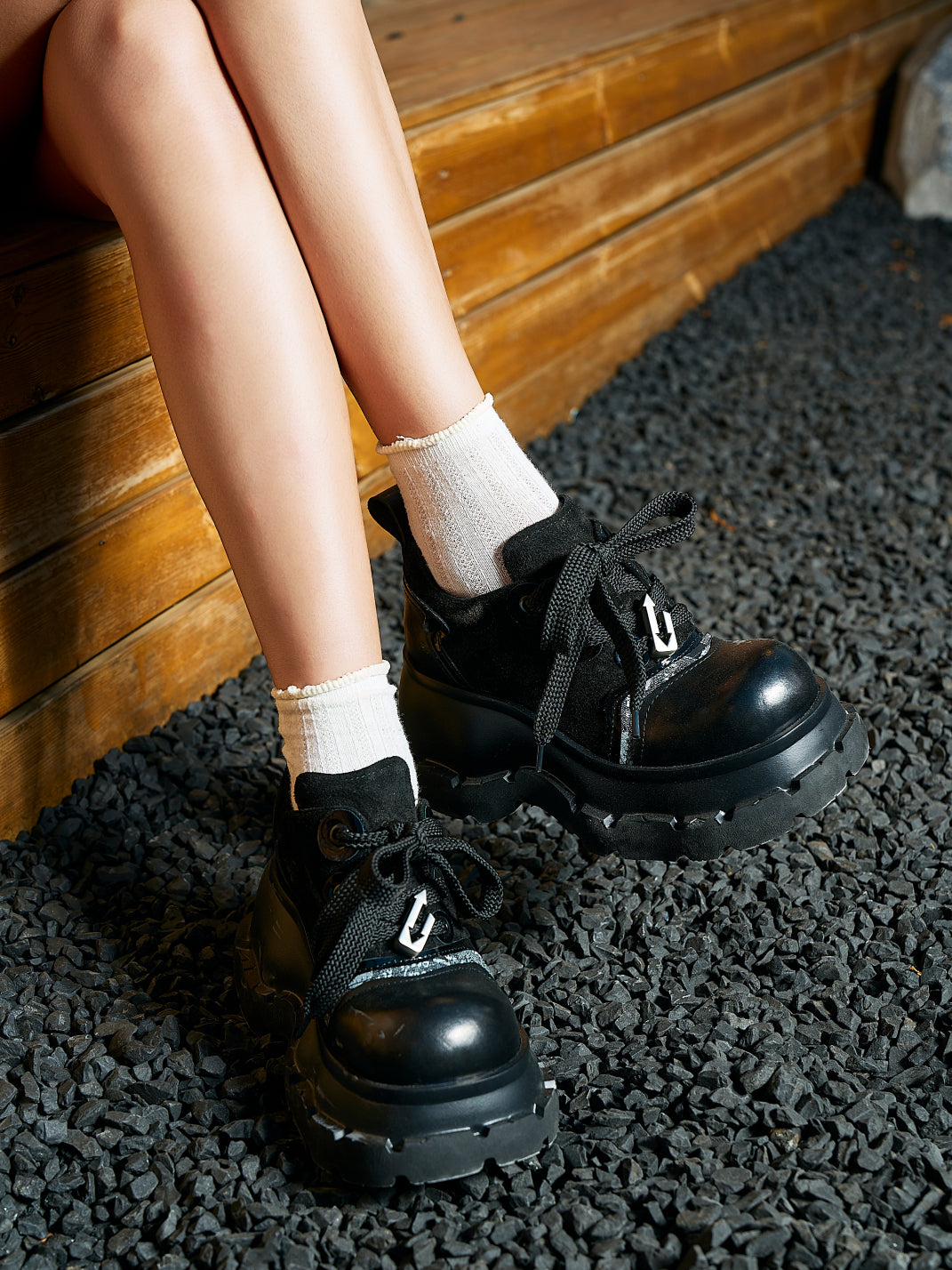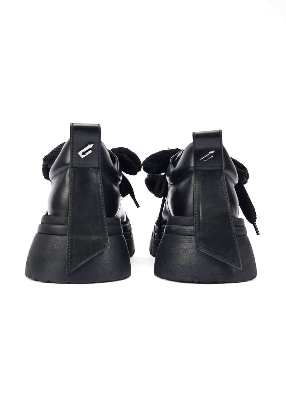 Design Concept: Nocturne . Oraculum. A uniquely lustrous horsehide upper, a rugged plush toy, and cool metal rivets embody theavant-garde aesthetic of "contradictory symbiosis." A thick, multi-layered composite sole with an aggressive serrated patterncreates a visually heightened silhouette while projecting a boundary-breaking presence that defies convention.