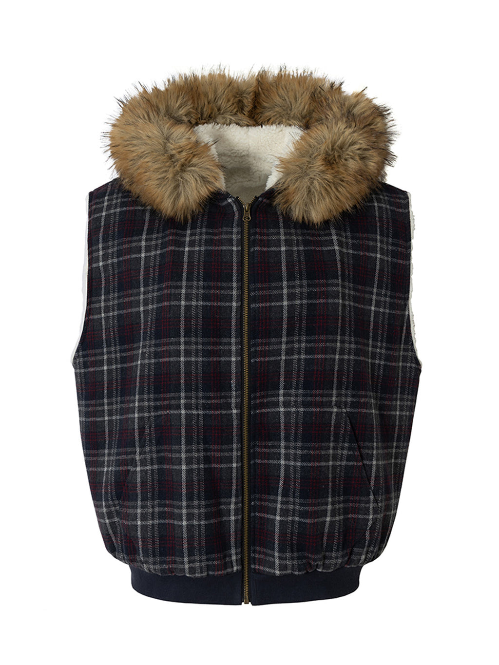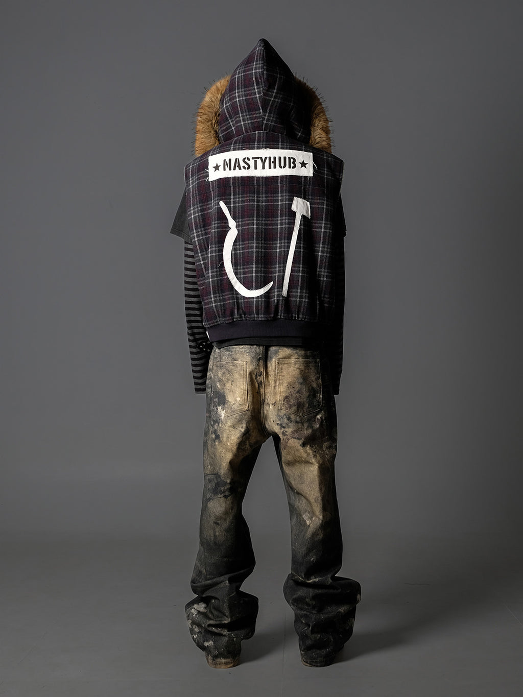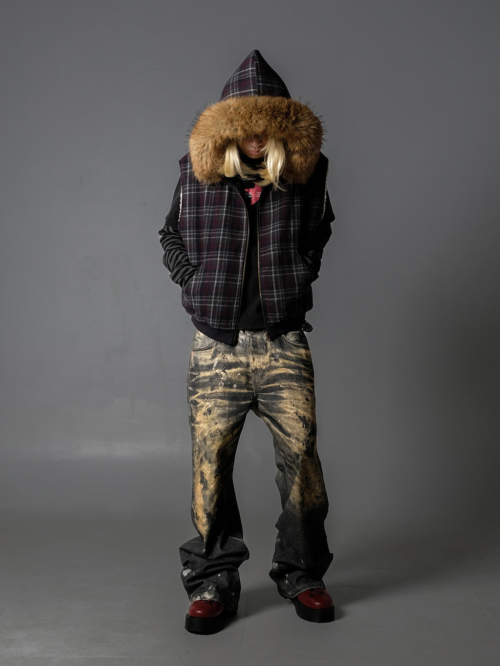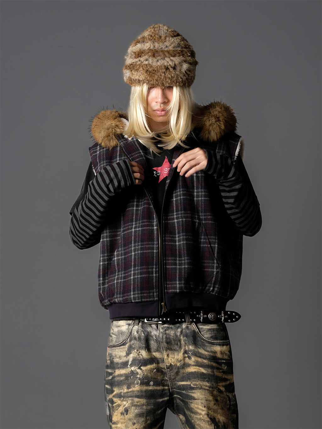Made with high-quality felt plaid fabric for the outer layer and 950g high-quality lamb's wool for the inner layer, this garment offers a structured and warm fit. The wide silhouette is flattering for all body types, from tall to short and slim, and enhances proportions. The patch print design on the back adds a unique touch, while the large fur collar adds a trendy element. It's the perfect choice for both stylish outfits and everyday commutes.