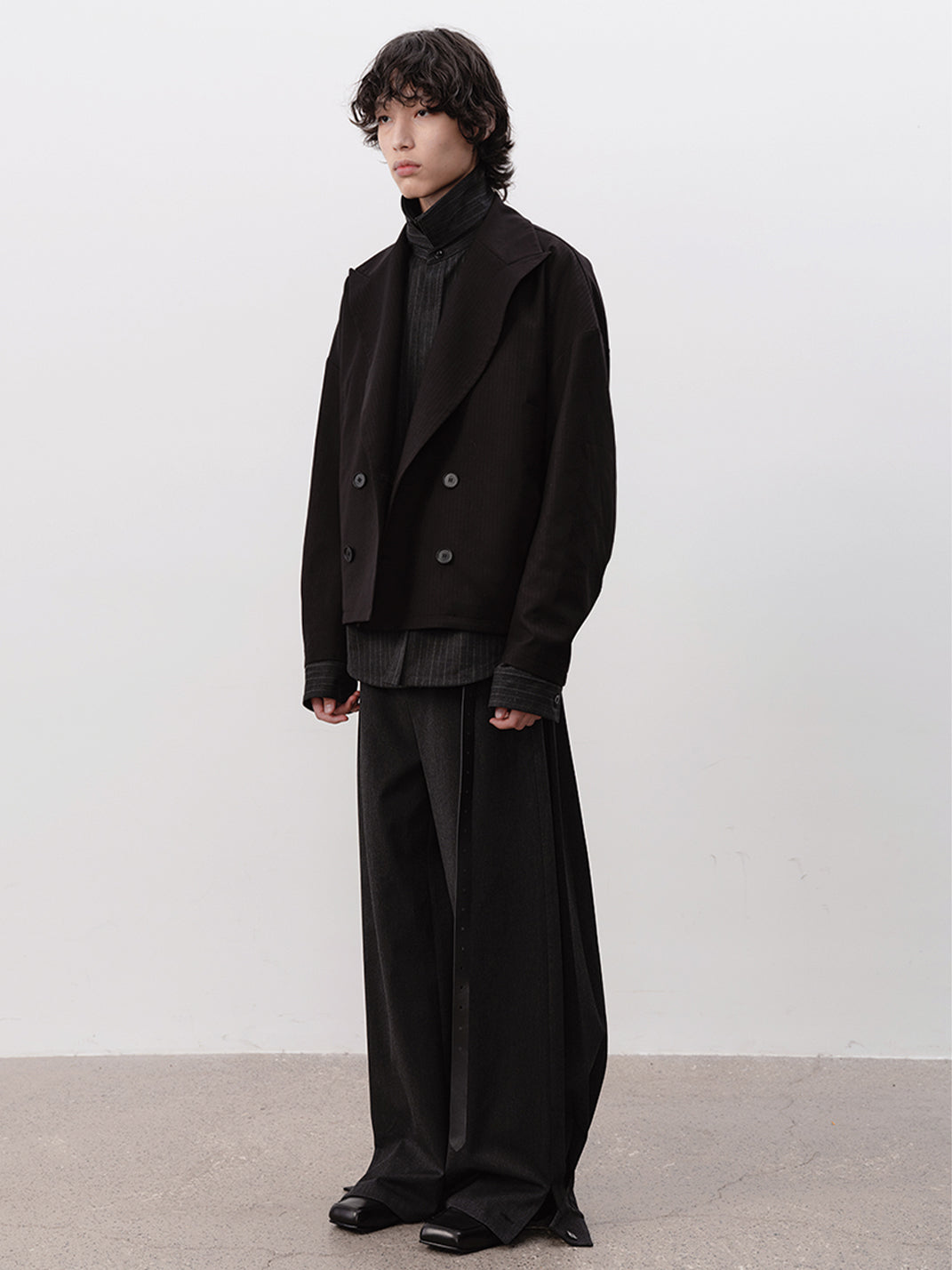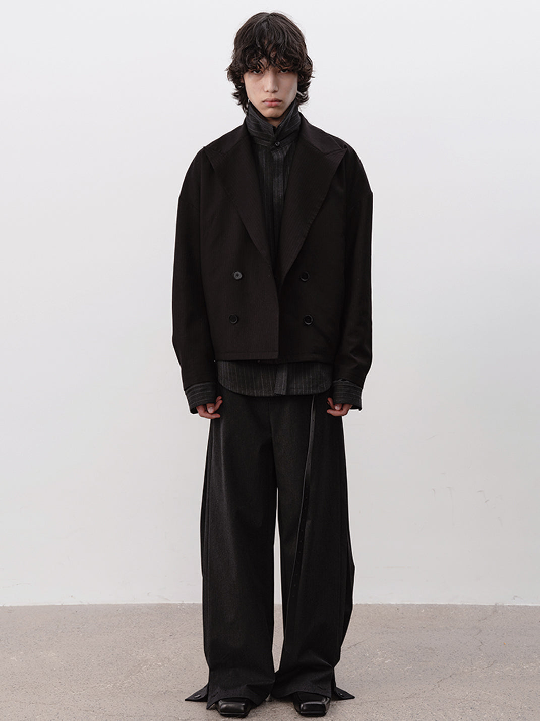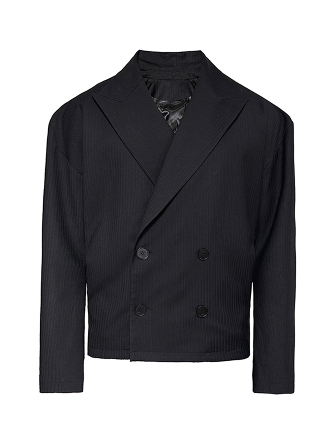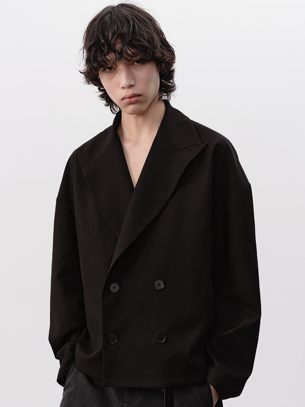 Designed with an oversized silhouette, a double-breasted front, and a wide peak lapel for a bold statement look.