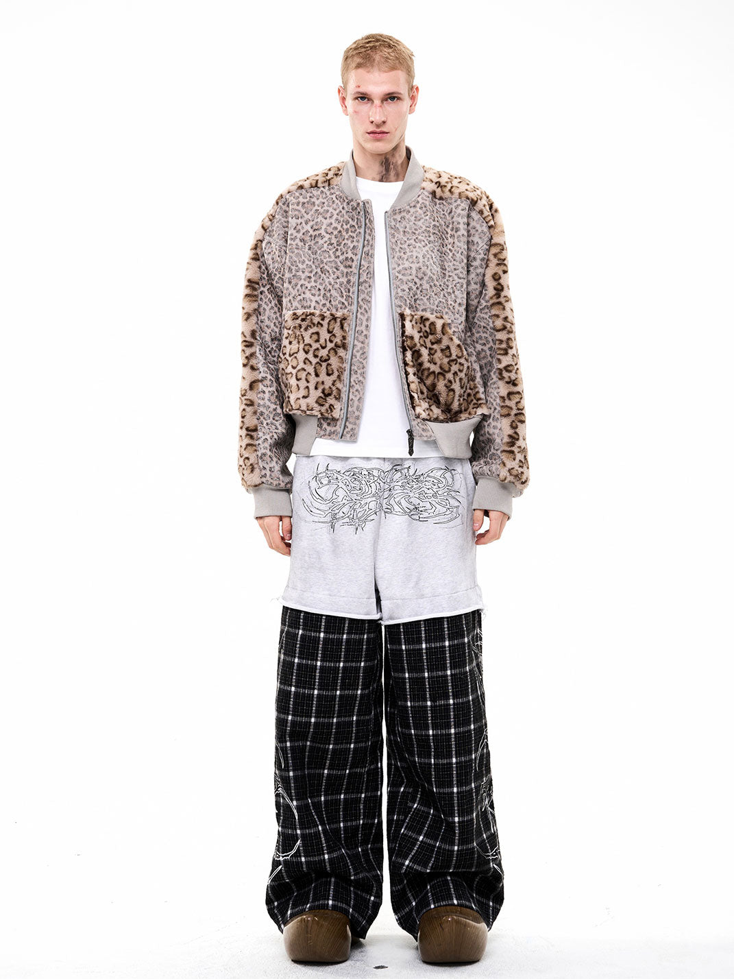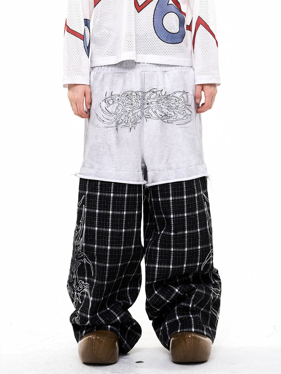 Fourth3ex | Rhinestone Print Splicing Plaid Wide-Leg Pants