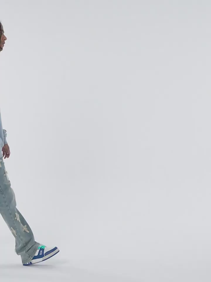 - High-quality denim fabrics are selected, with a crisp silhouette that creates a three-dimensional silhouette for the upper body. The slightly flared trousers have a clean and smooth silhouette with a classic retro feel. The raw edges of the trousers are embellished with cross patch details, highlighting the sense of layering and street style.