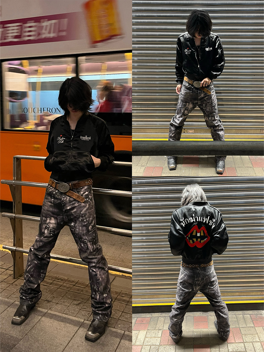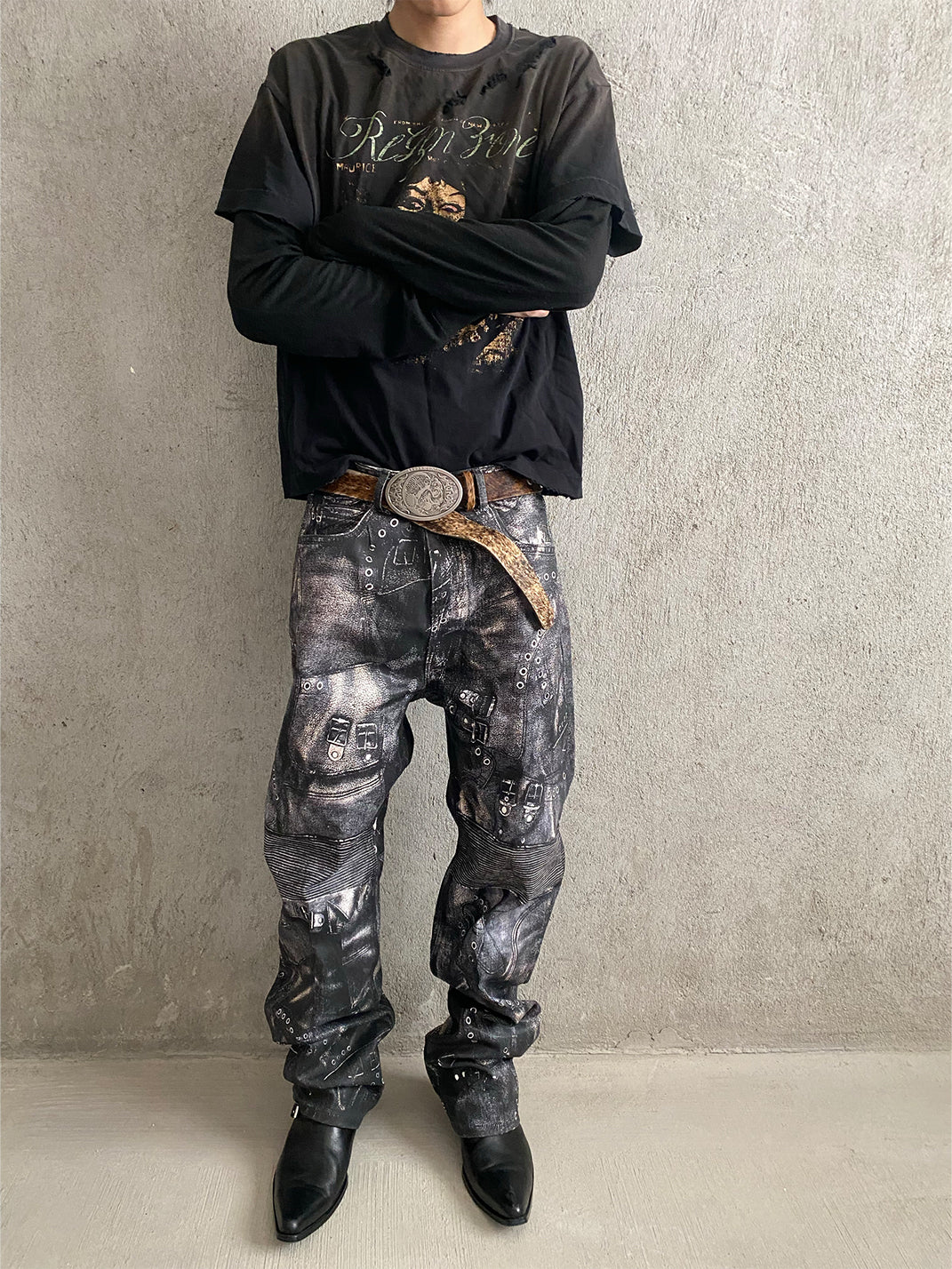 Using custom high-weight premium pure cotton fabric, stiff and structured, imported hand-spotted waxing and brushing techniques are selected. Over 50 sets of leather military boots are staggered and reorganized, reconstructing the structure.