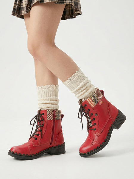 TMA EYES | Hand-Stitched Woven Lace-Up Boots-Red