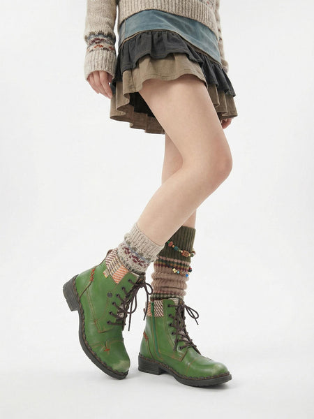 TMA EYES | Hand-Stitched Woven Lace-Up Boots-Green