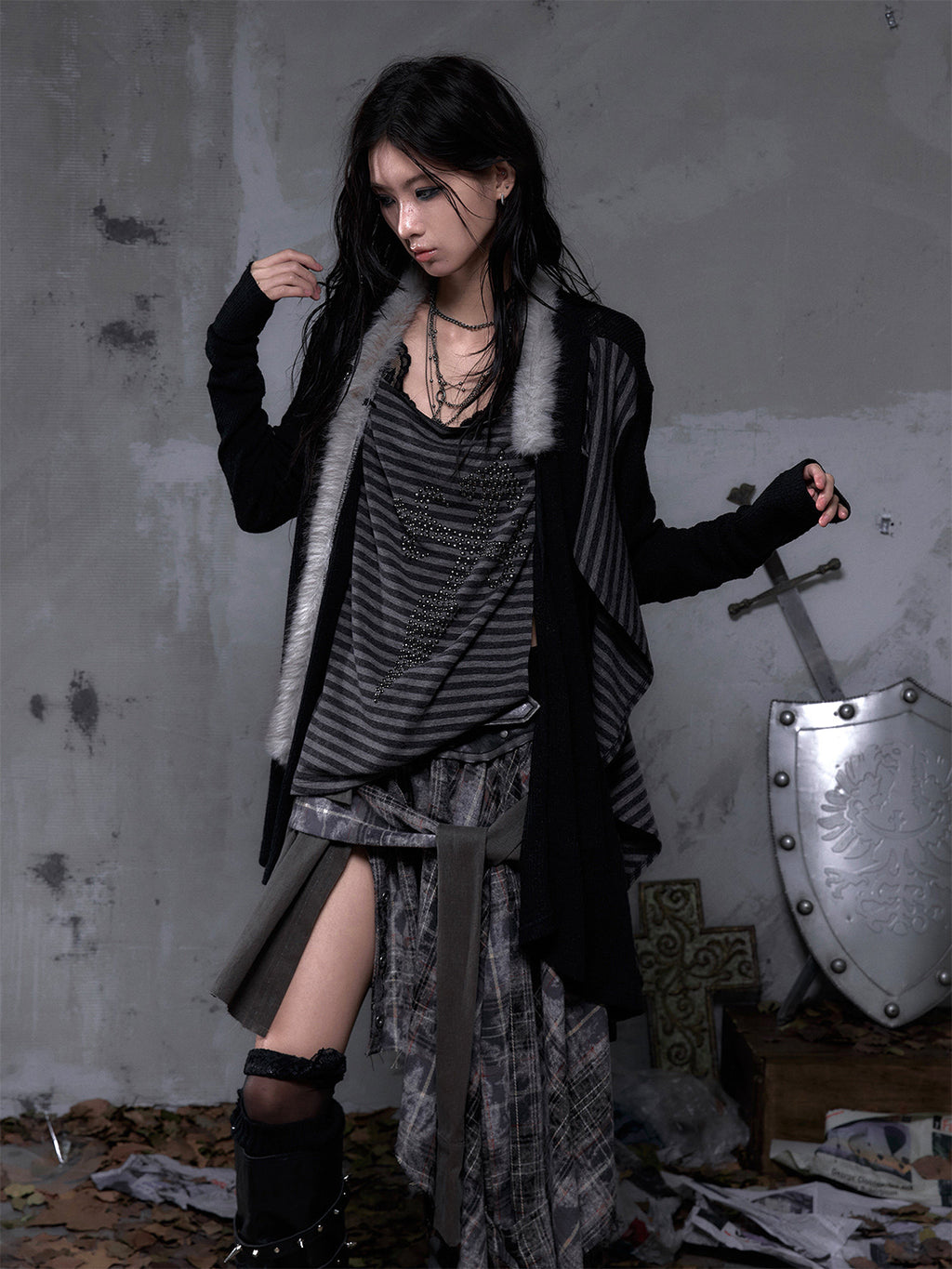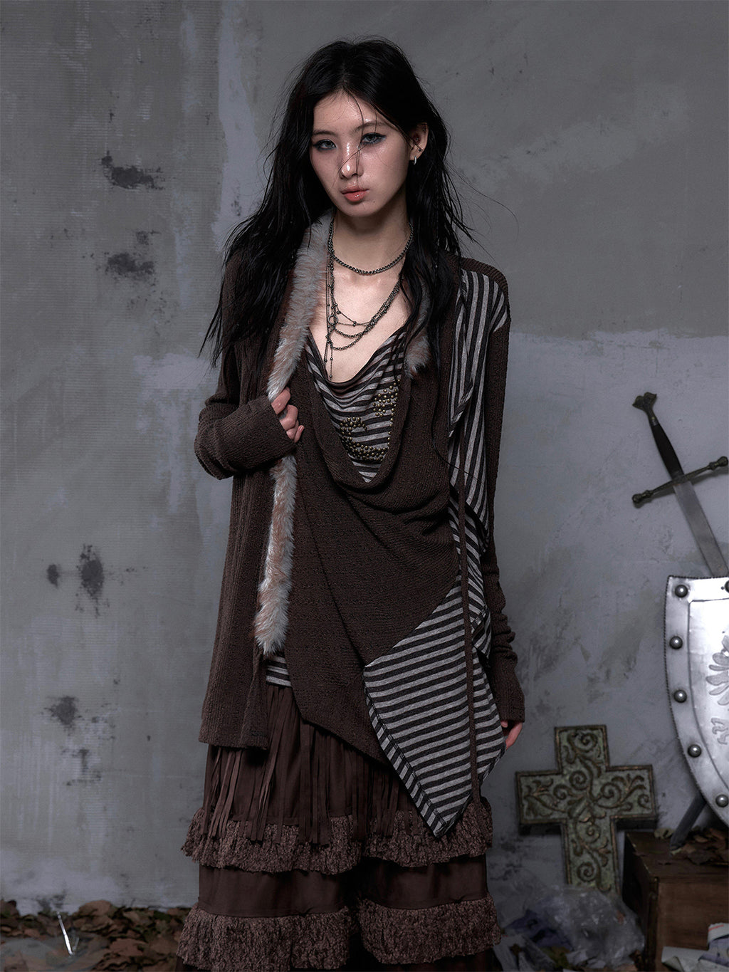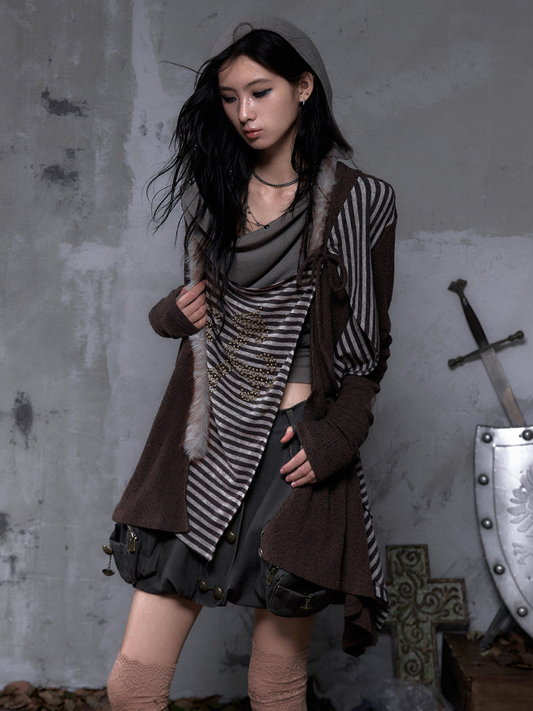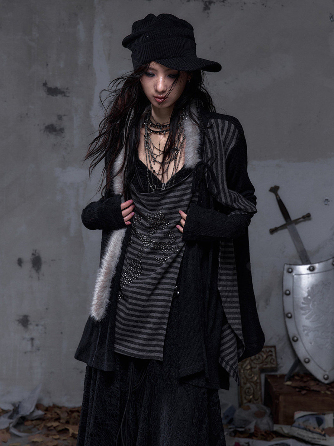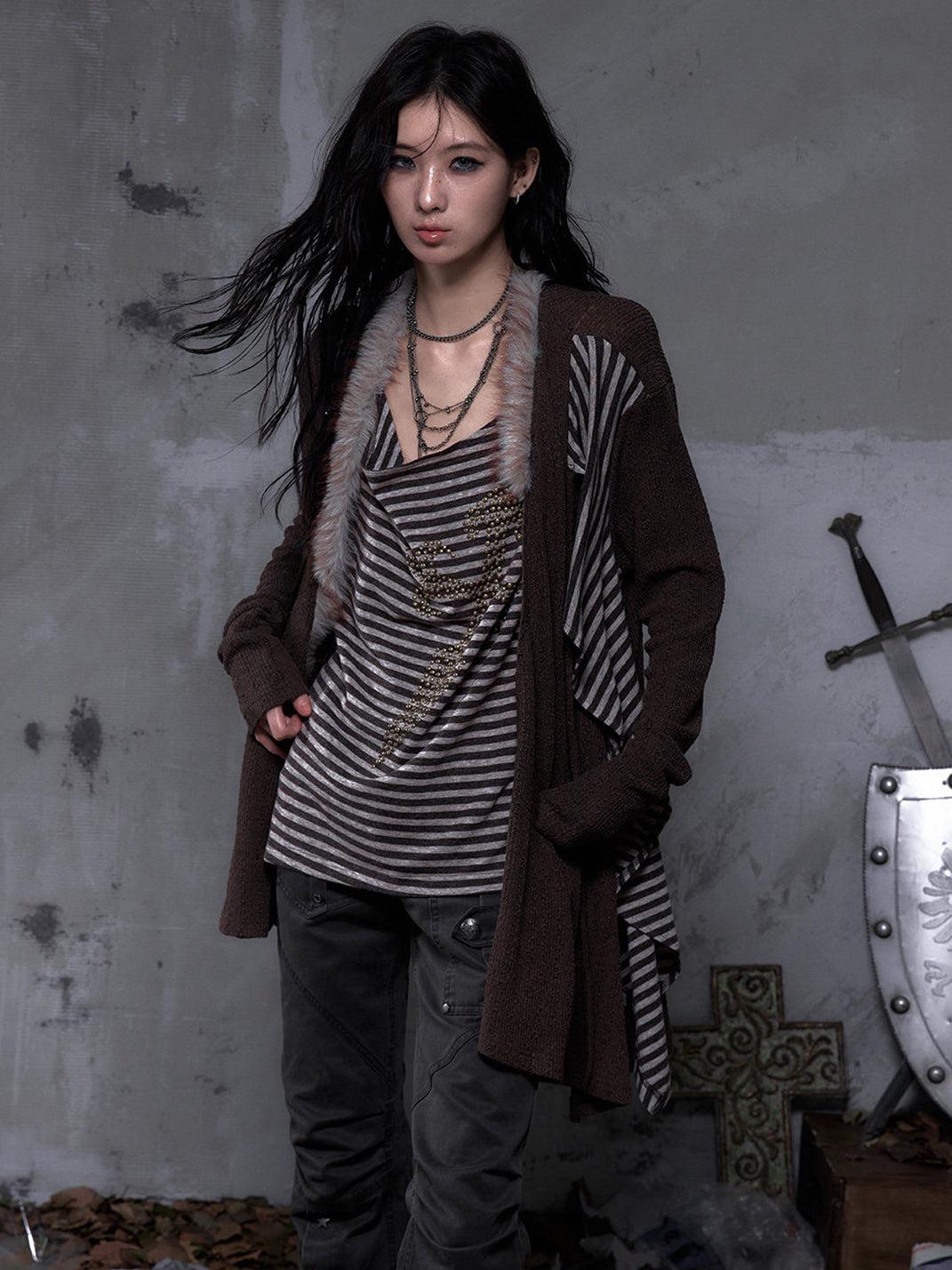 NO ROMANCE | Faux Two-Piece Rhinestone Striped Knit Cardigan Skip to content
