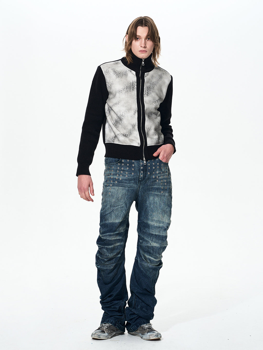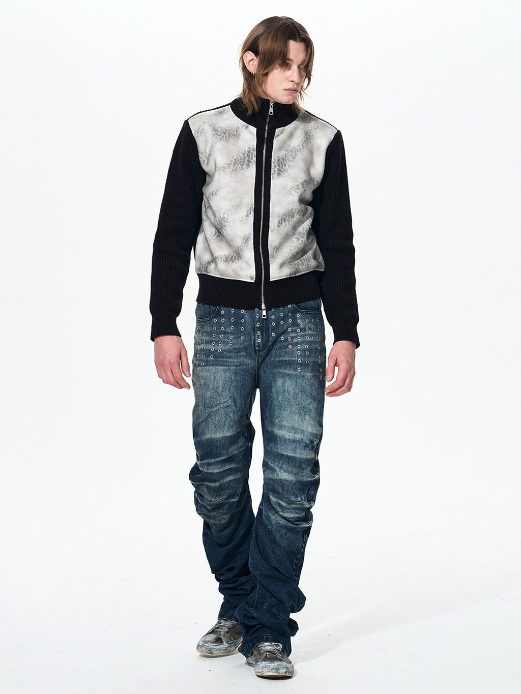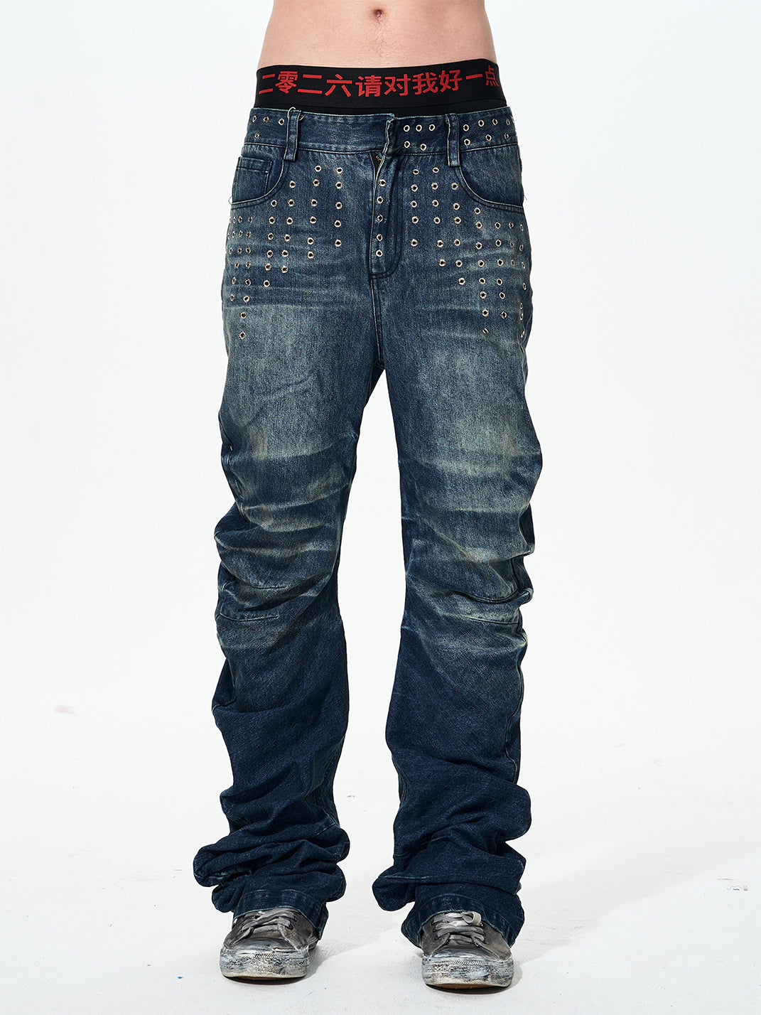 Fourth3ex | Studded Whiskering Curved Blade Jeans Skip to content