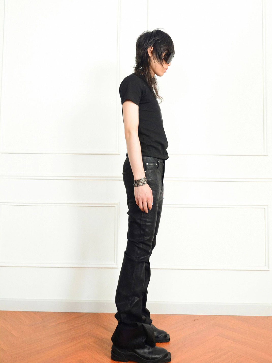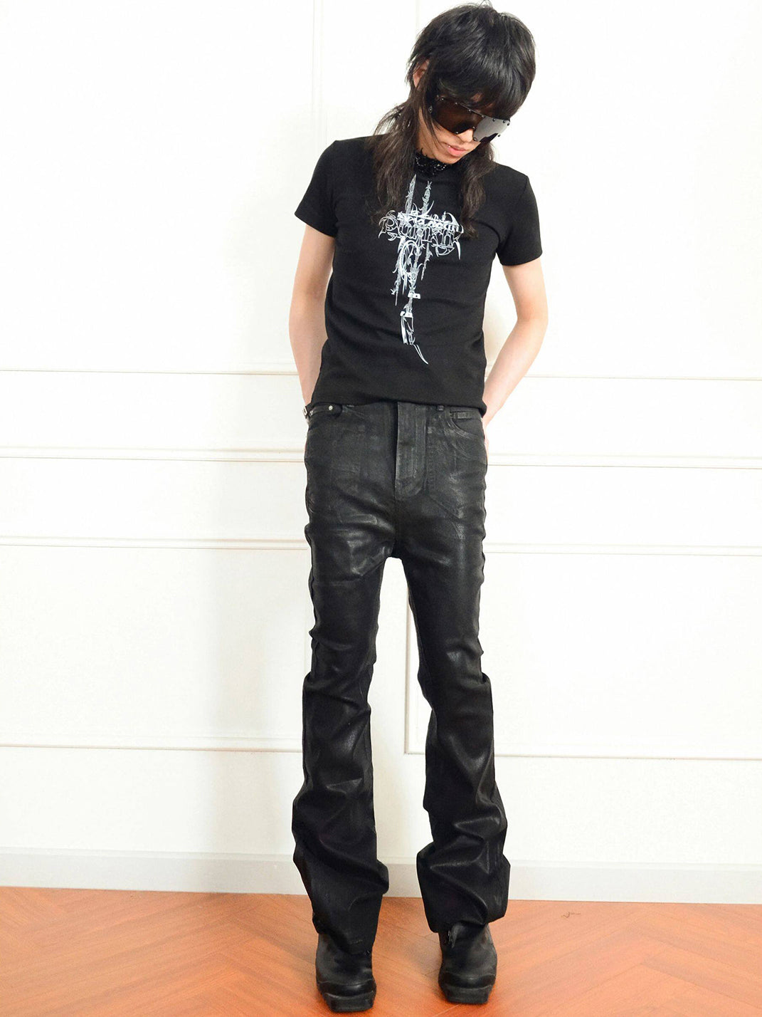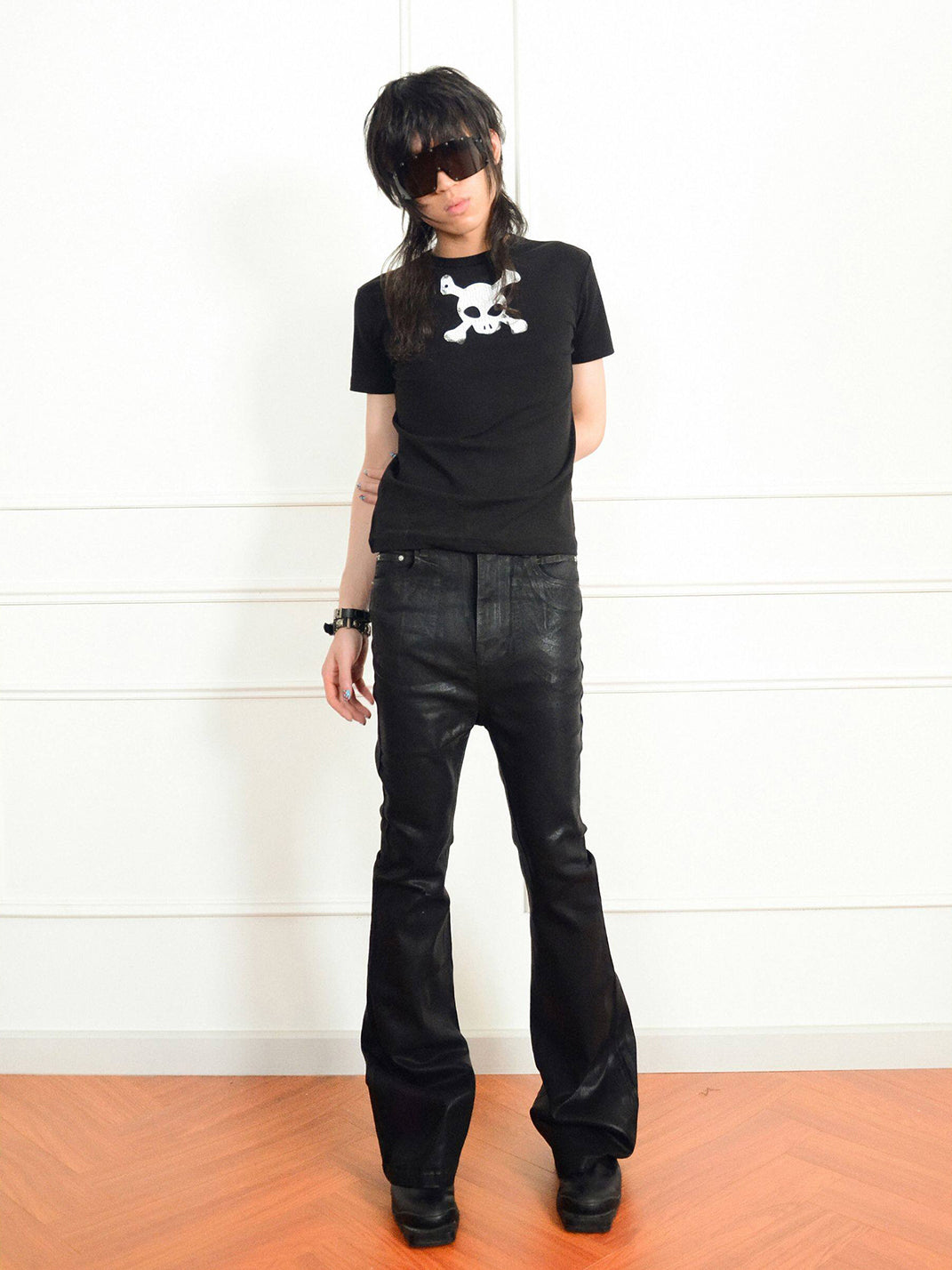 PunkFK | Shiny Wax Coated Micro Flare Zip Jeans Skip to content