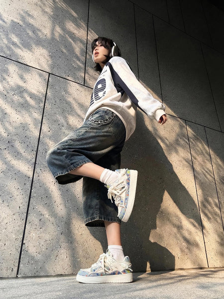 KREATE | Floral Jacquard Color-blocked Denim Jeans