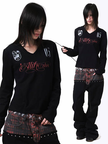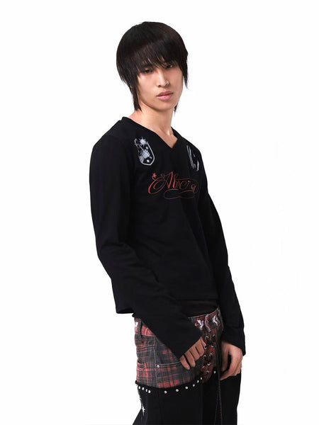 DETW | Striped V-Neck Skull Rhinestone Long-Sle...