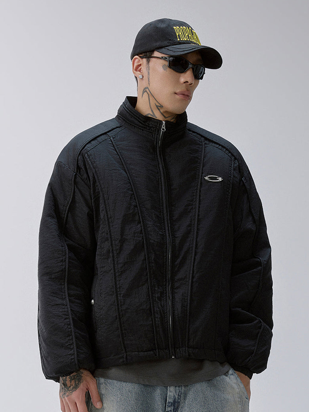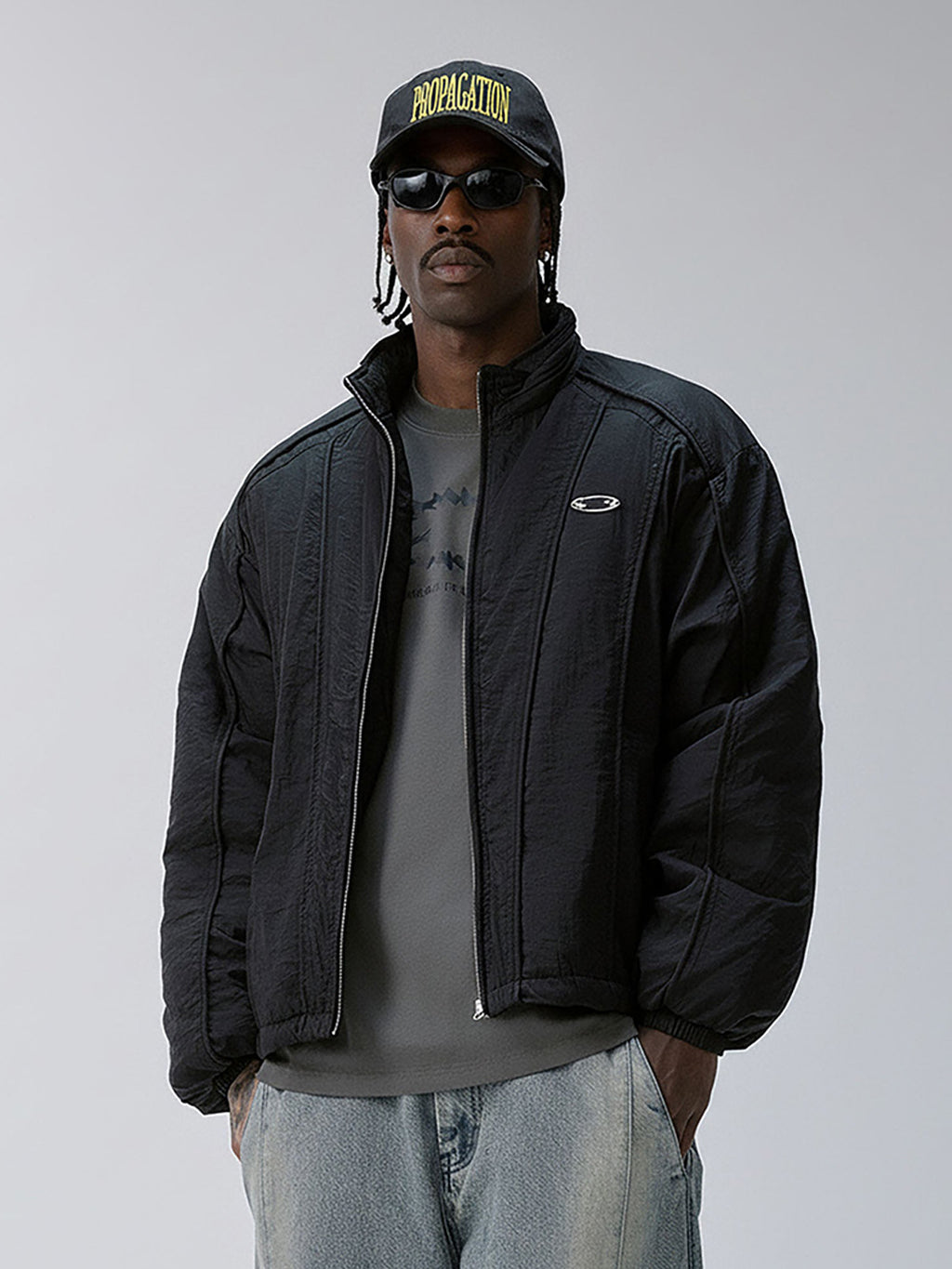 This Structured Panel Stand-Collar Puffer channels a bold retro-sport energy through its sculpted silhouette and tonal panel construction. Crafted in a subtly crinkled technical fabric, the jacket offers volume and texture without unnecessary bulk. Vertical seamlines and a high stand collar emphasize its tailored structure, while the dual-direction zipper and elastic cuffs keep it grounded in functionality. Finished with a discreet embroidered chest logo, it blends early-2000s athletic aesthetics with contemporary streetwear language.
