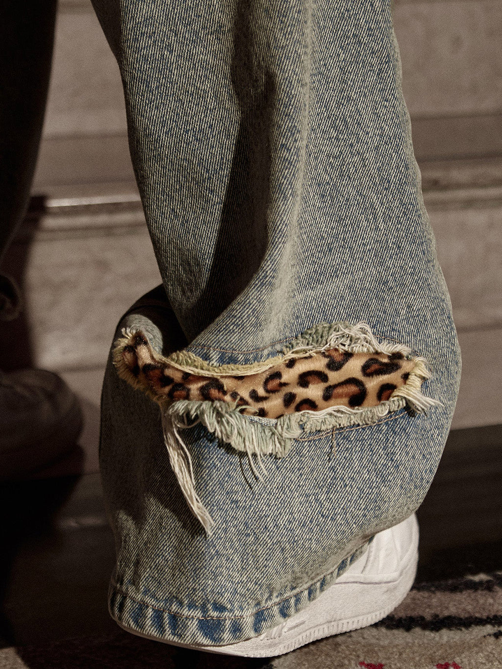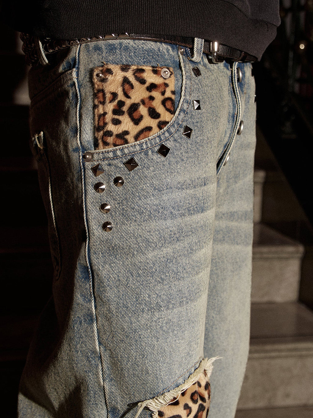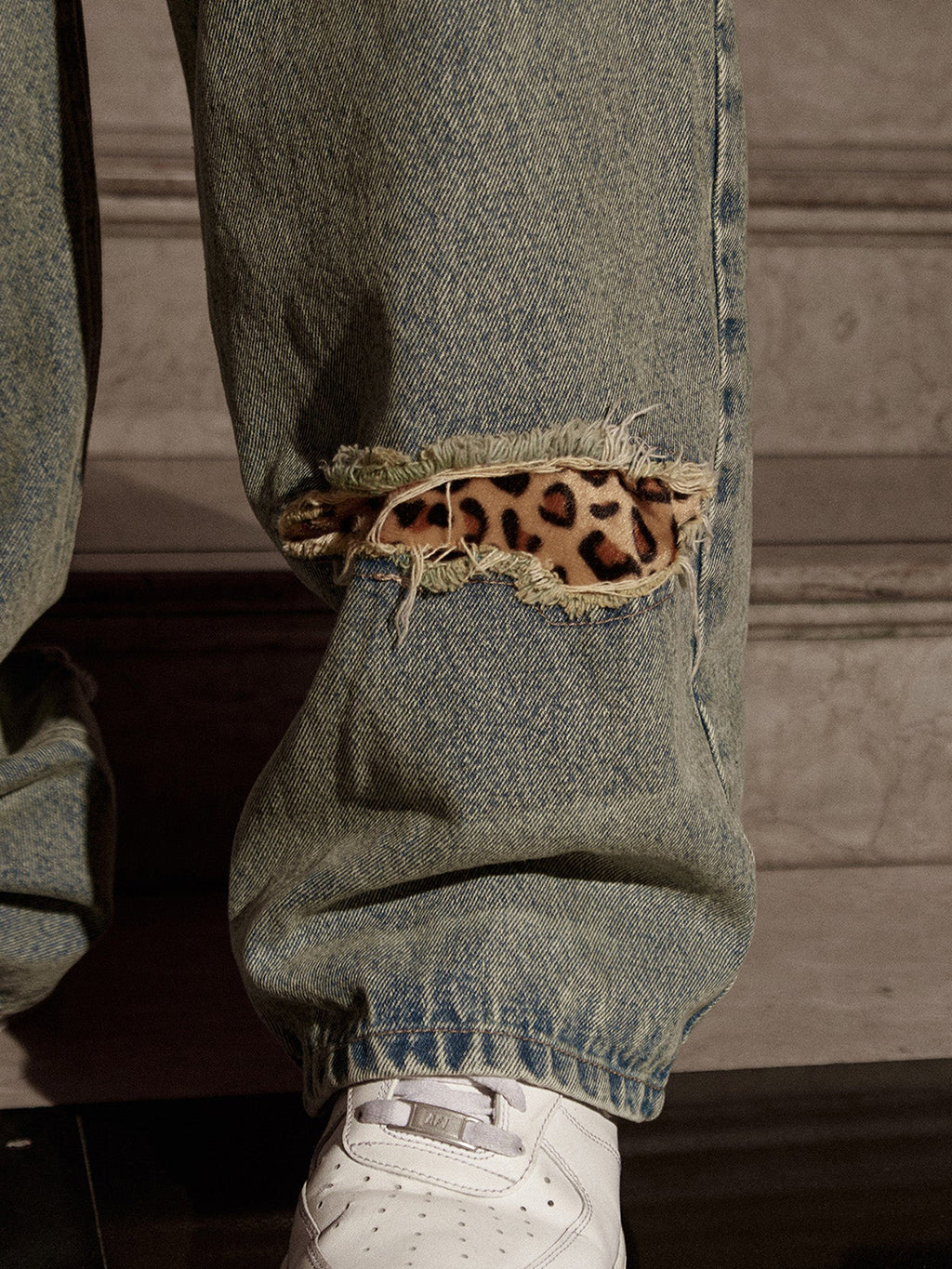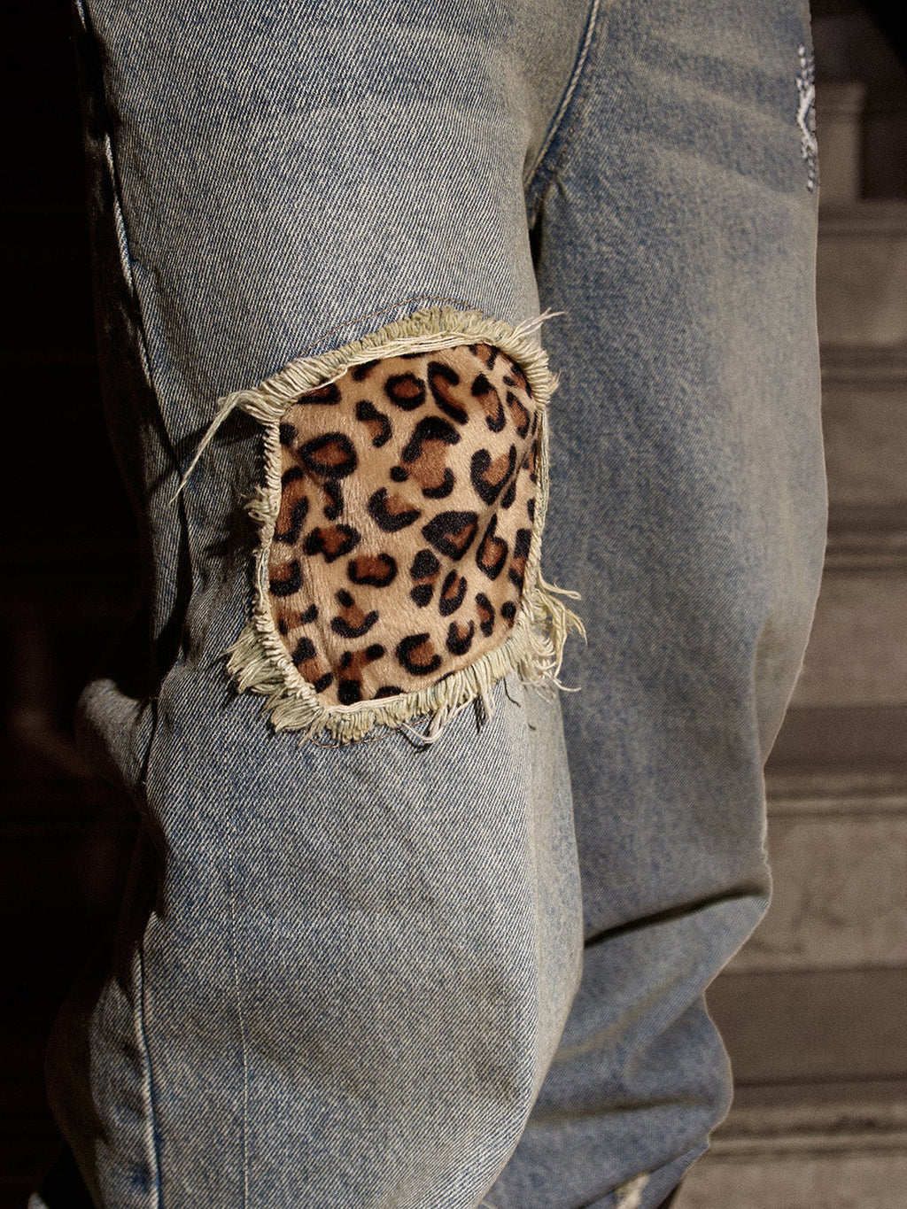 PHANTOMHUNTER | Washed Leopard Patch Baggy Jeans Skip to content