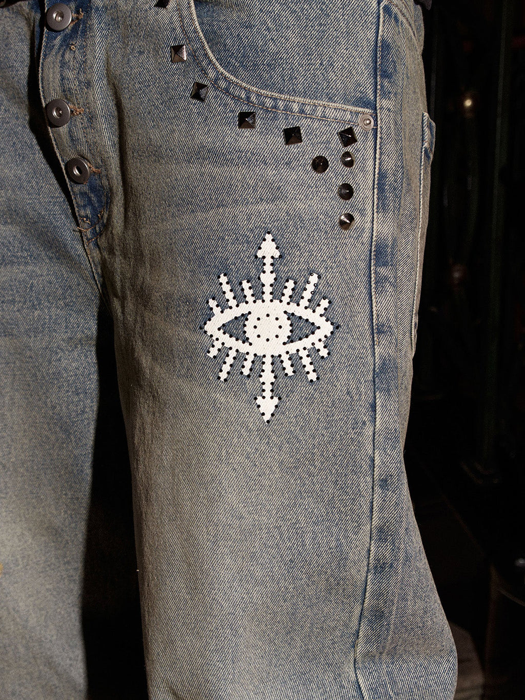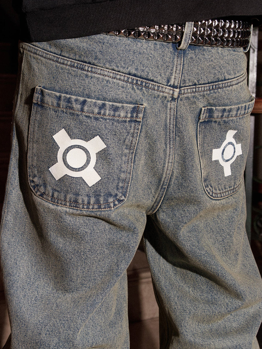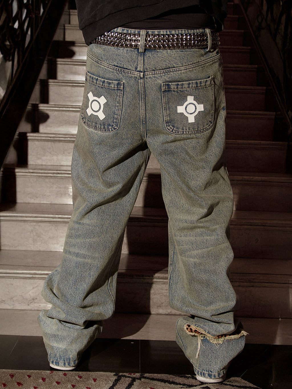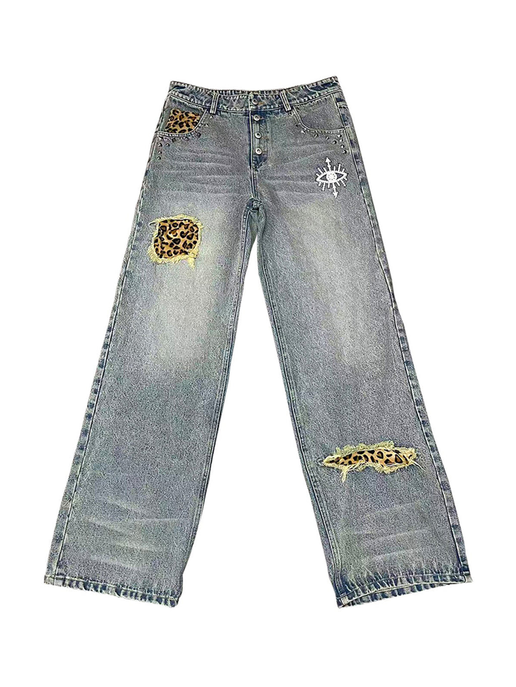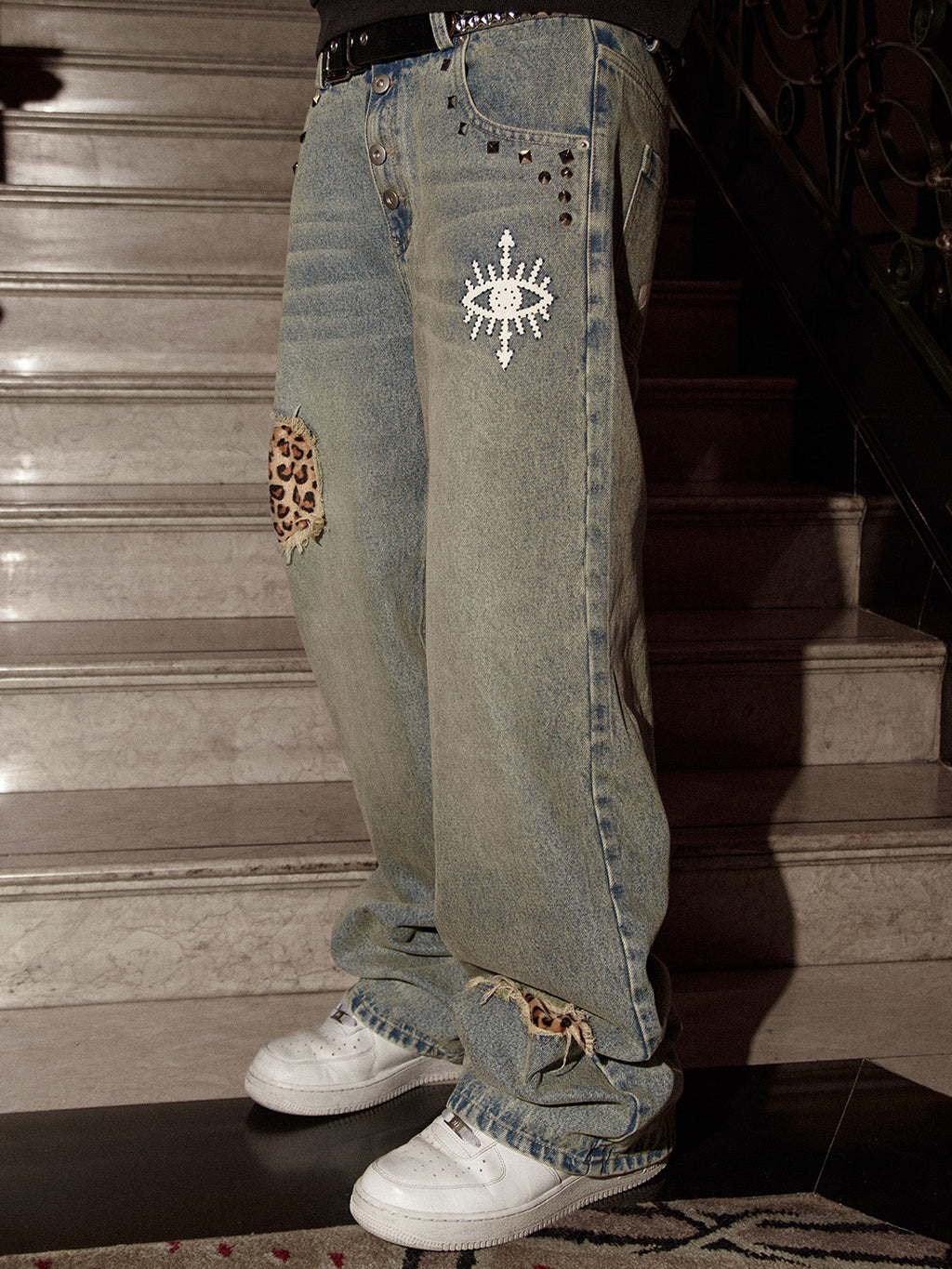 PHANTOMHUNTER | Washed Leopard Patch Baggy Jeans Skip to content