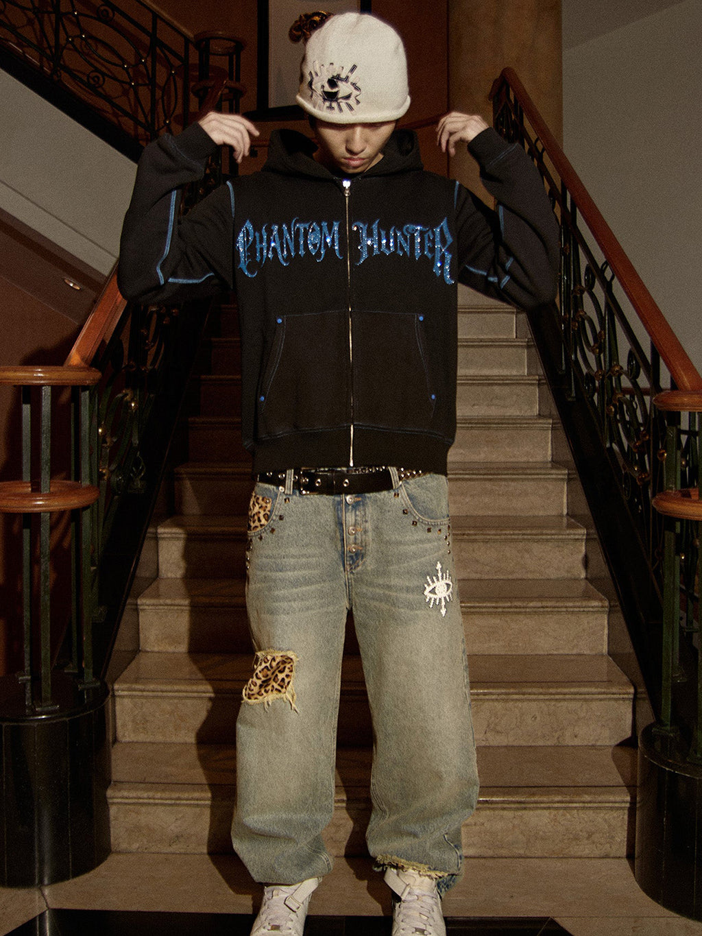 PHANTOMHUNTER | Washed Leopard Patch Baggy Jeans