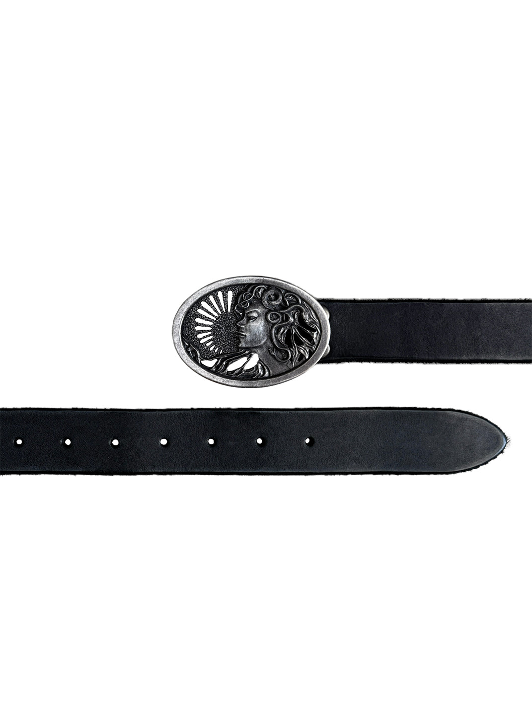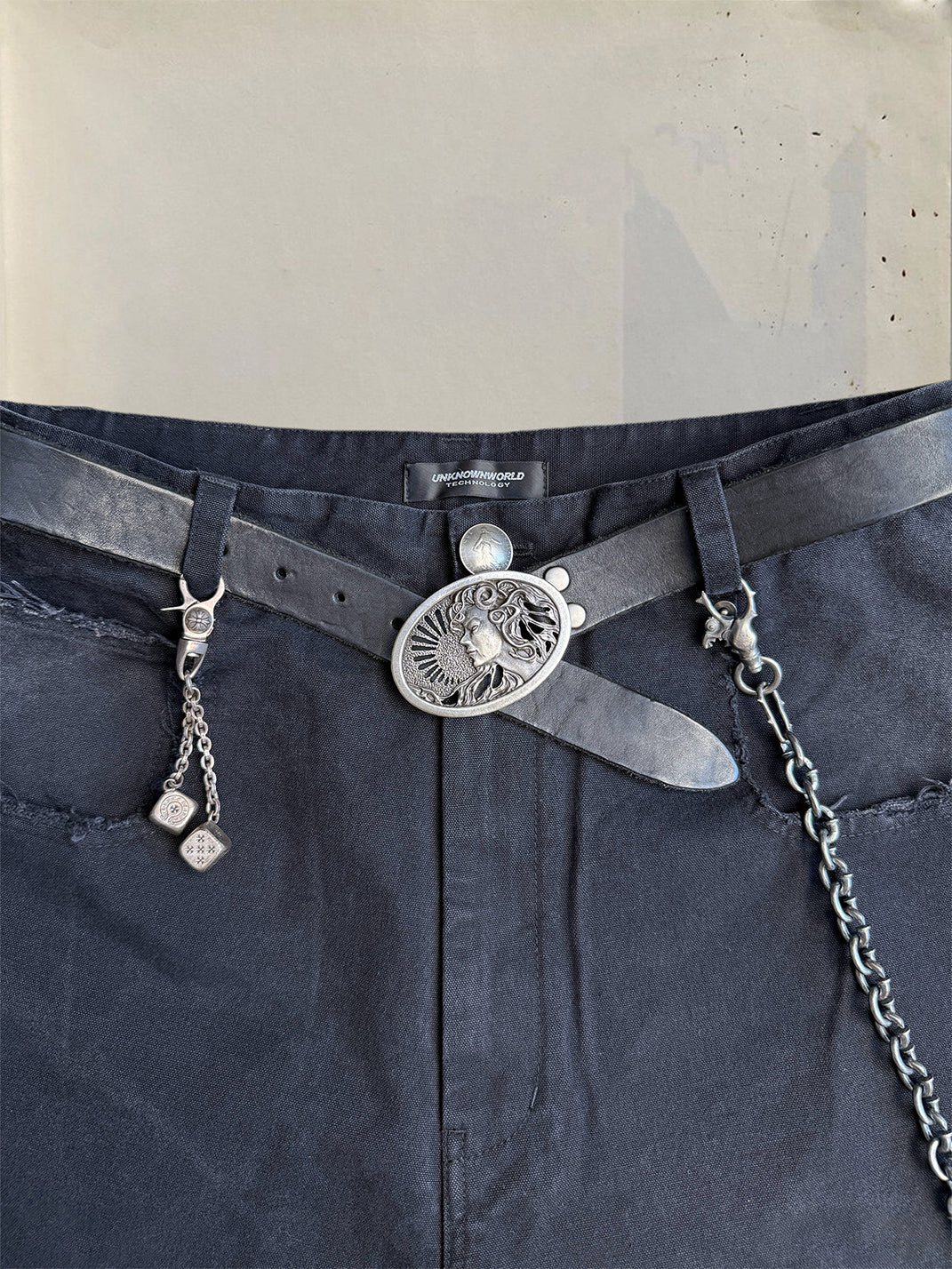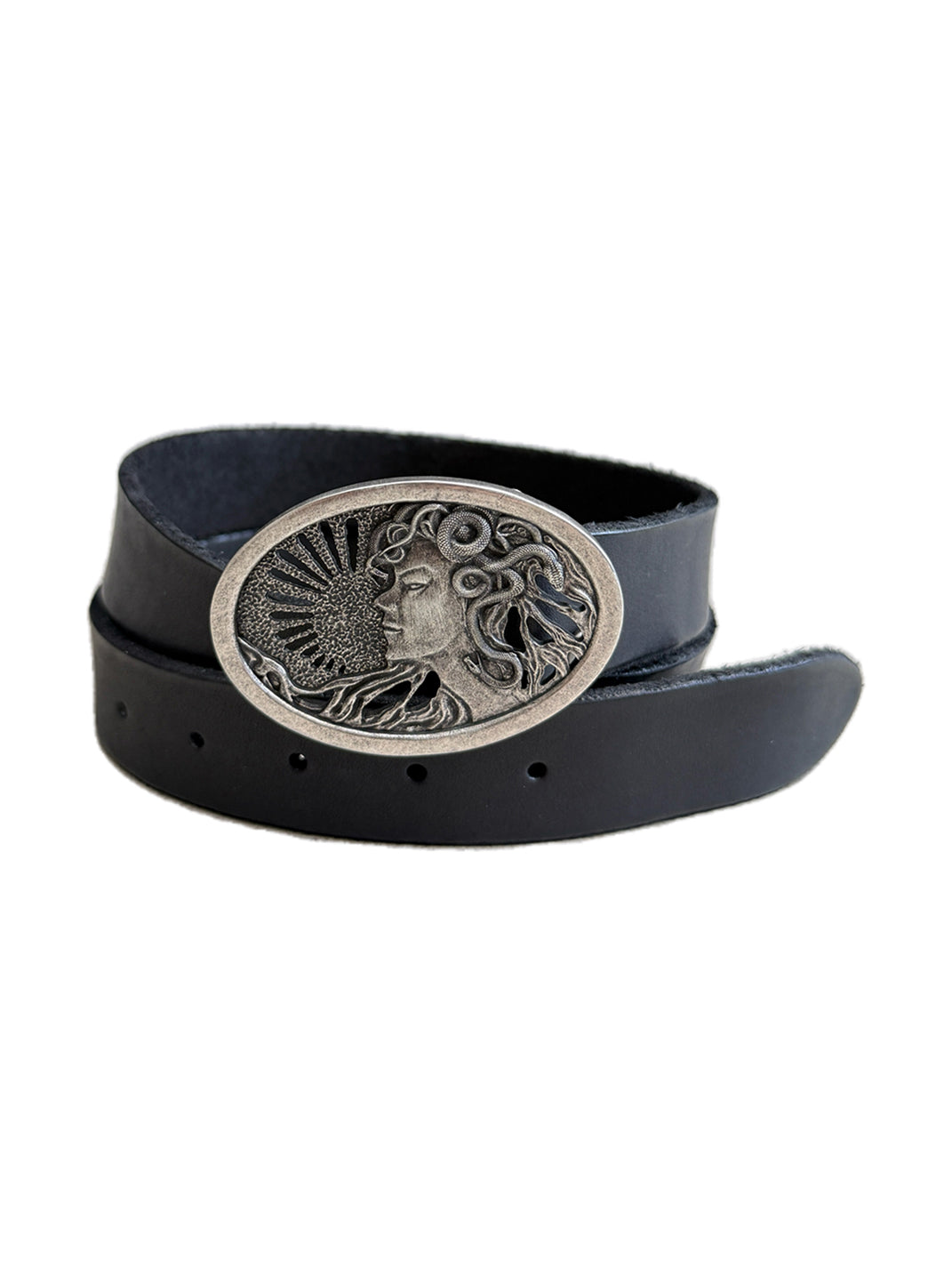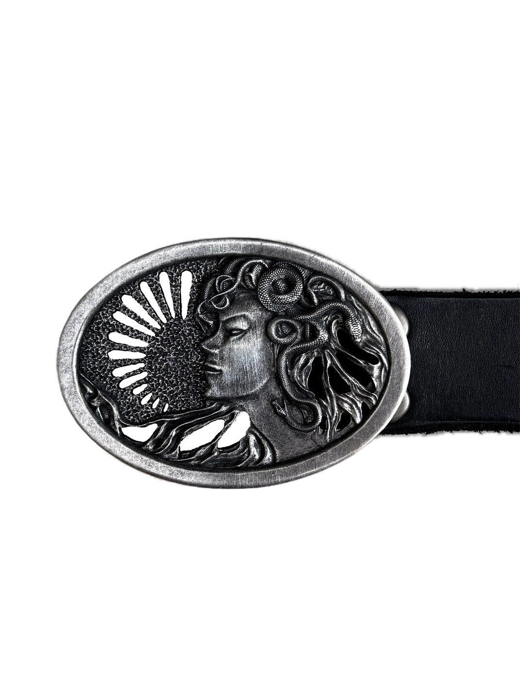 Buckle: Crafted from copper with thick silver plating, featuring a Medusa-inspired demon-season design. The snake-scale and hair details are sharply defined, presenting a bold blend of artistry and avant-garde aesthetics. Each buckle undergoes hand-aged finishing, achieving a texture close to solid silver.