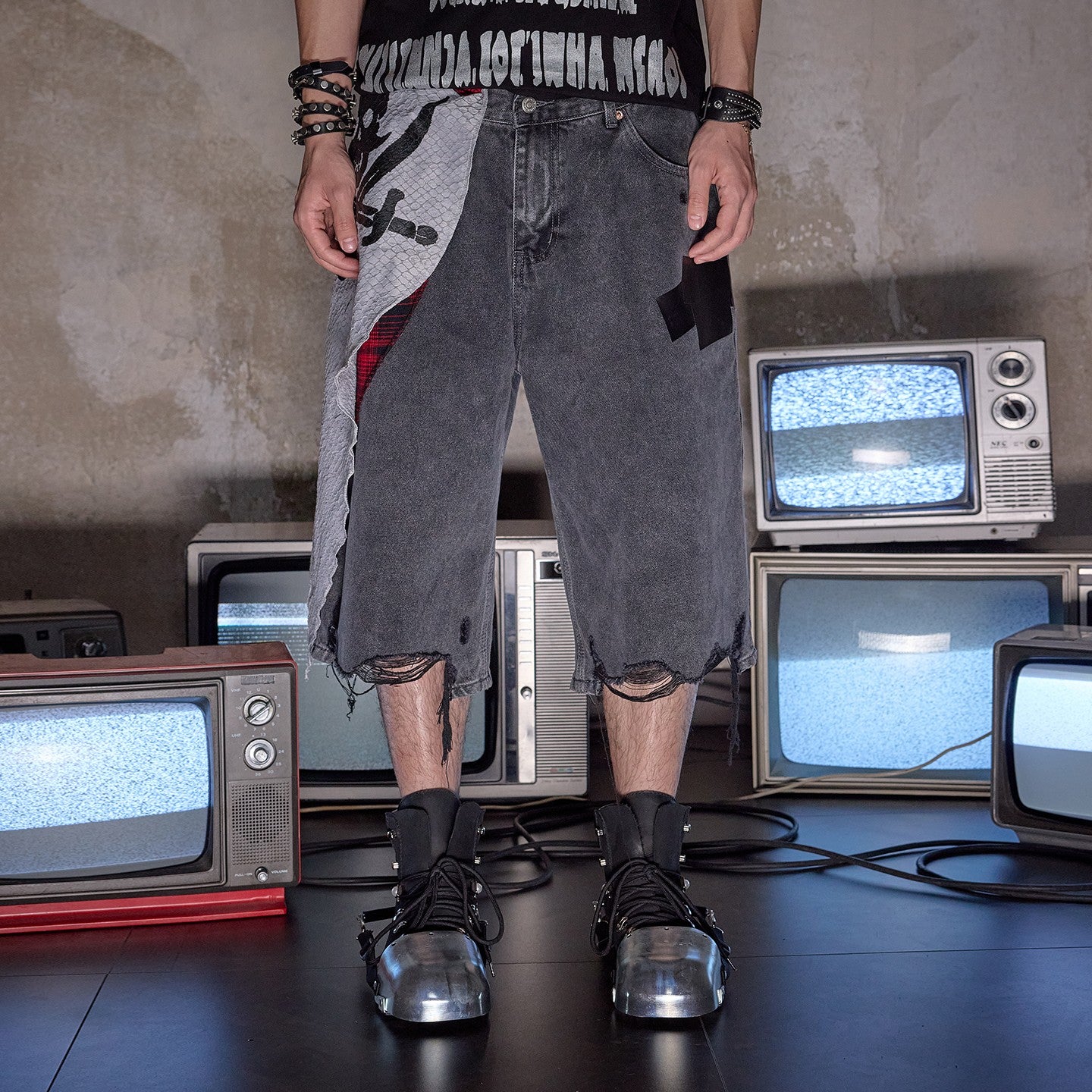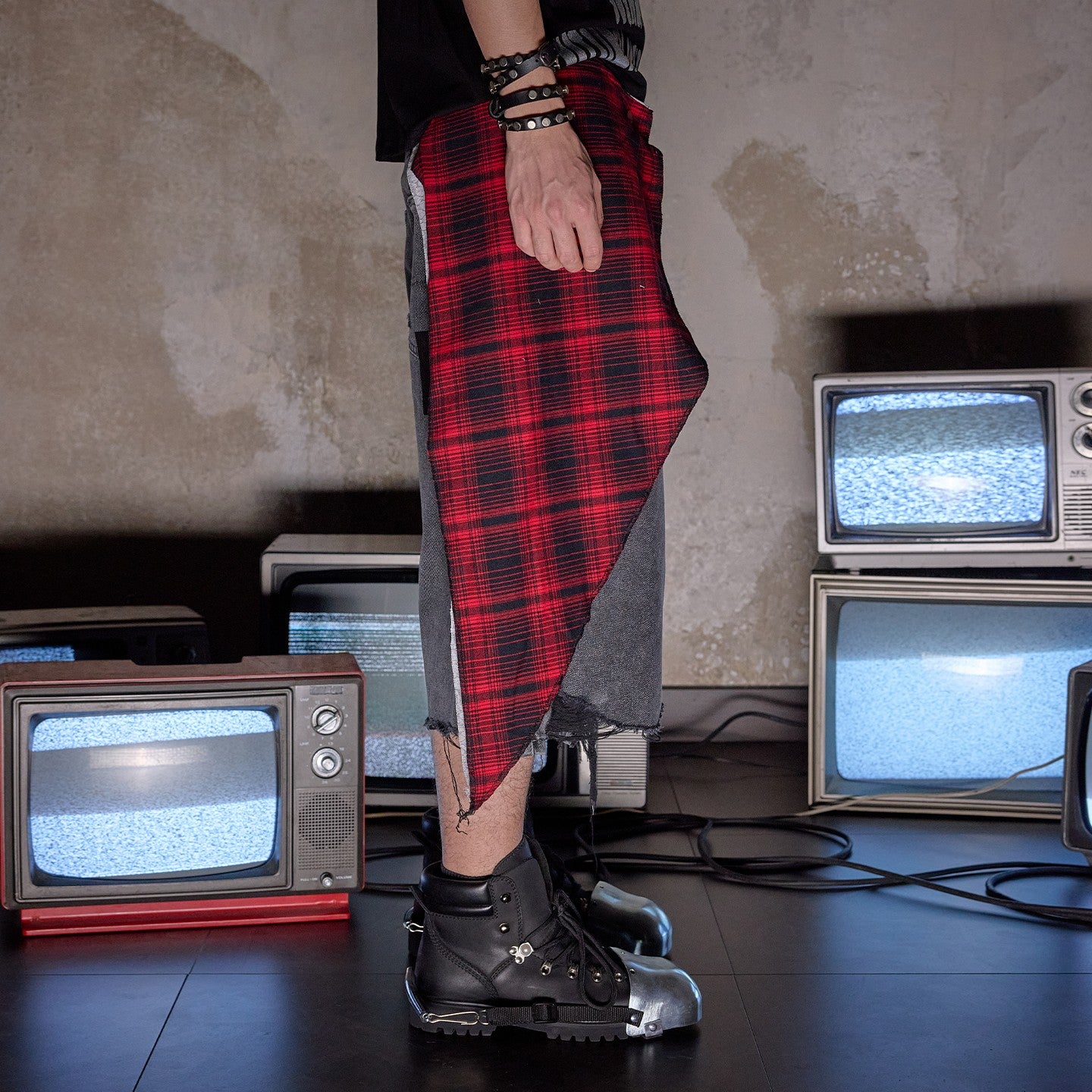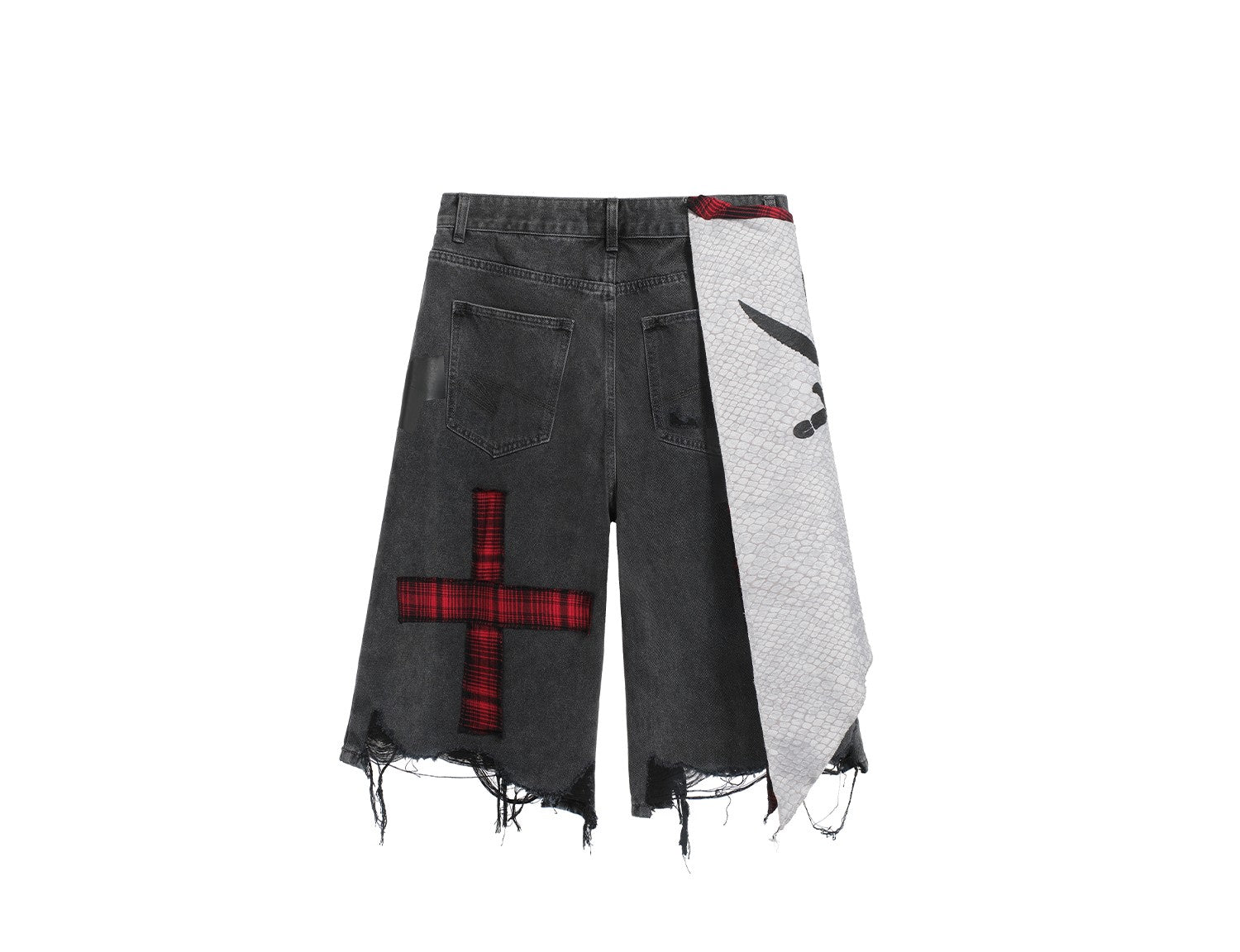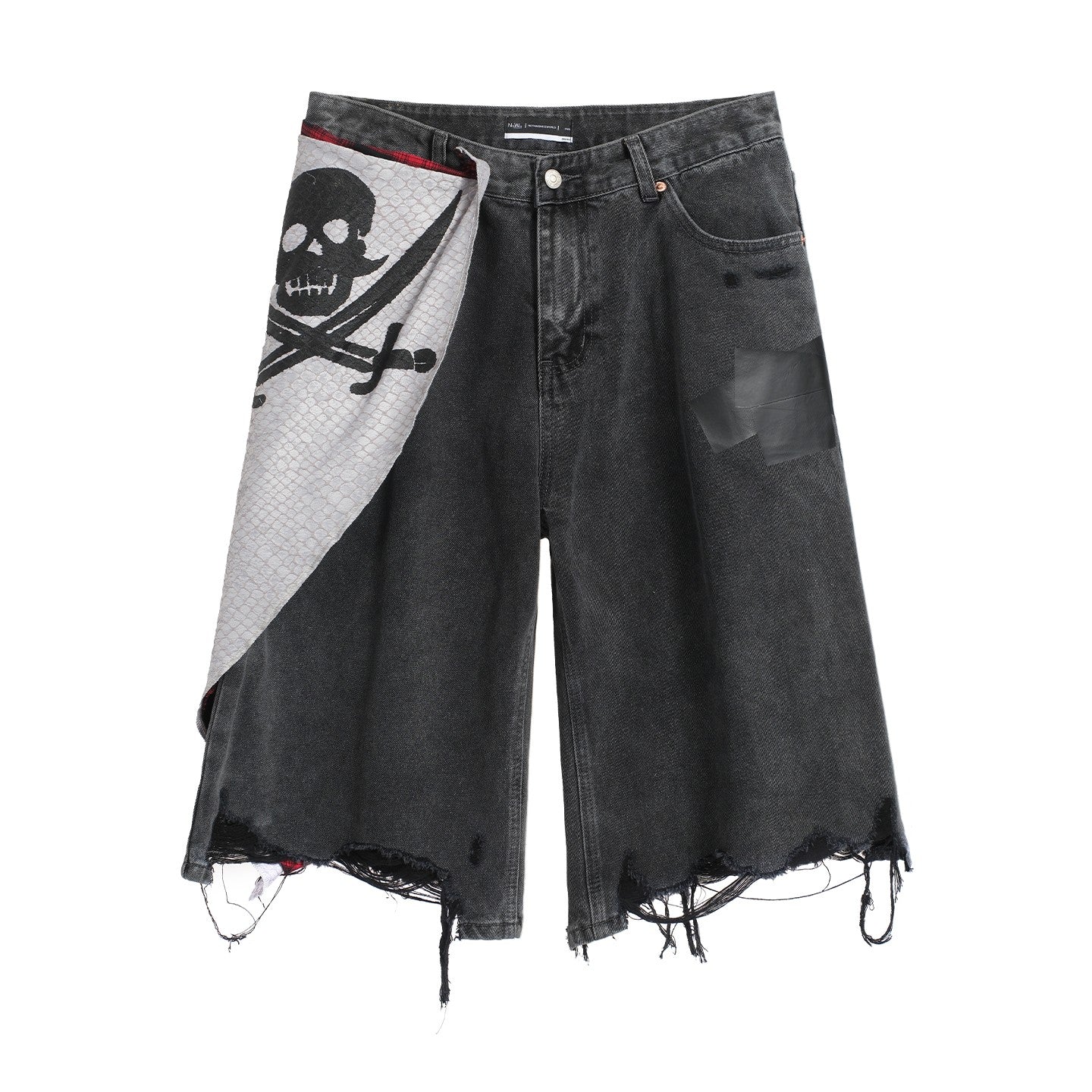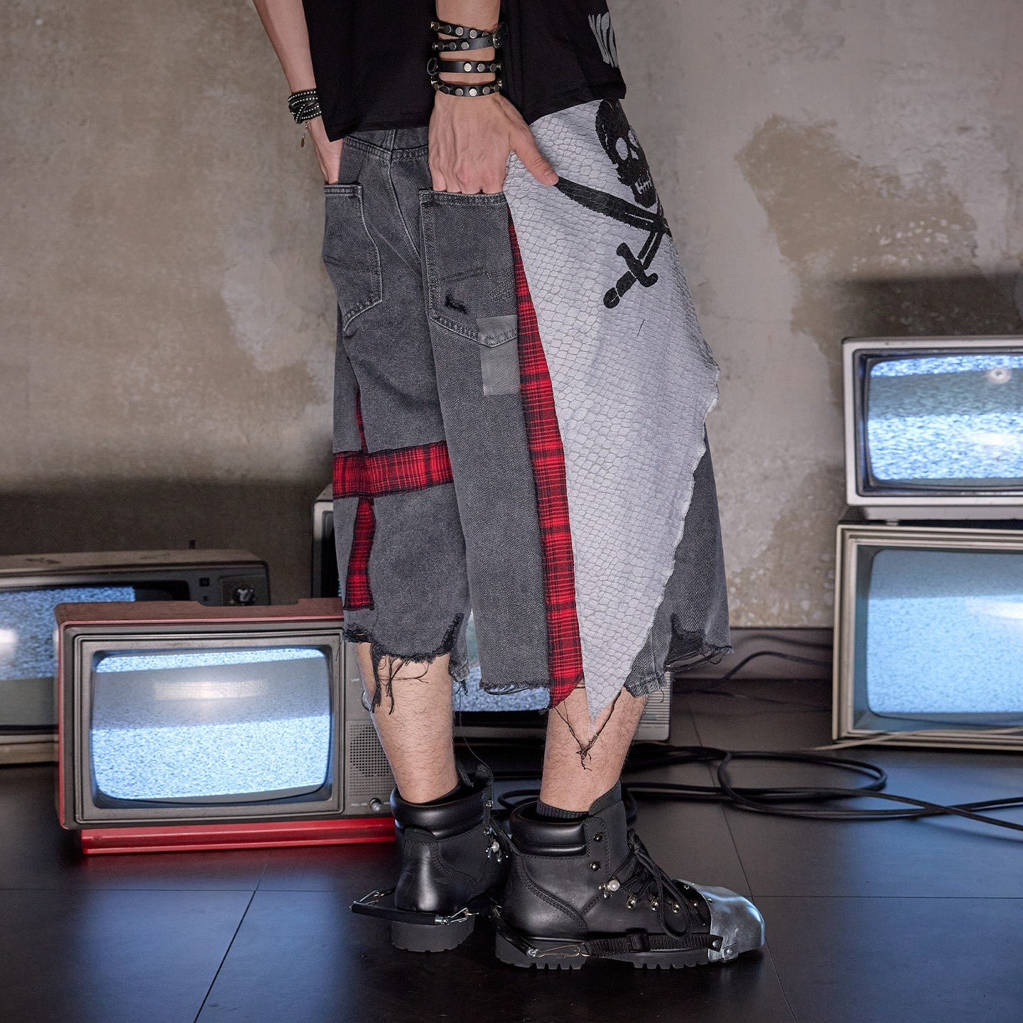 NOTHINGNESS WORLD | Pirate Skull Plaid Patchwork Capri Jeans Skip to content