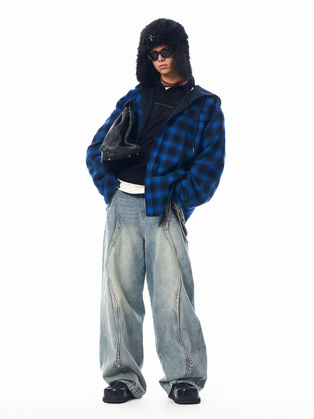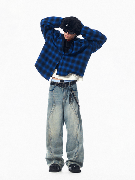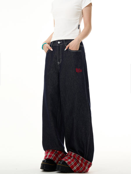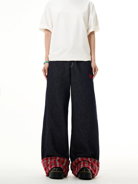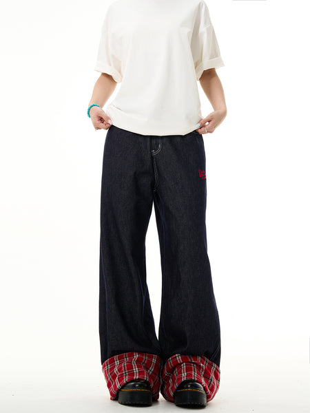 FLYOFF | Vintage Plaid Cuffed Denim Wide-Legged...