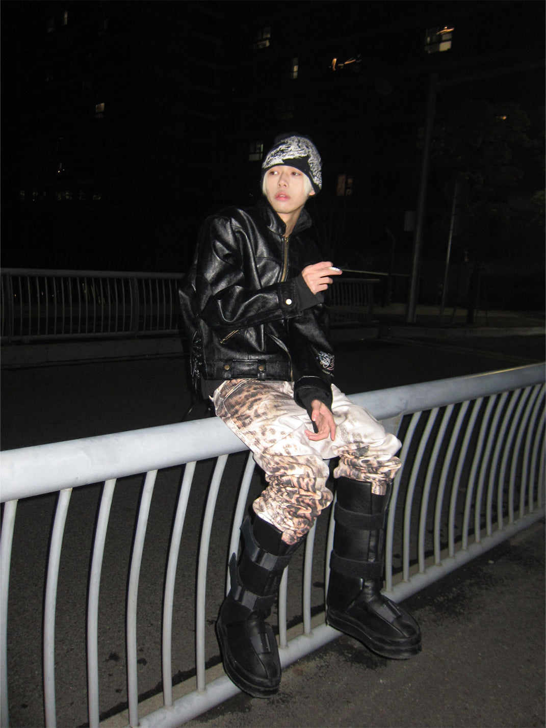 Crafted from premium heavyweight split leather, this jacket mimics the texture of distressed cowhide. Featuring front and back prints inspired by the "Dragon & Tiger" and "Riot" themes from the 25ss "Riot" collection, it is one of the key pieces from the 25ss Drop1 mainline. The prints are created using imported "Kangli" digital inkjet technology, achieving a groundbreaking "embroidery-like" effect on the custom ≥1.3mm rough leather surface.