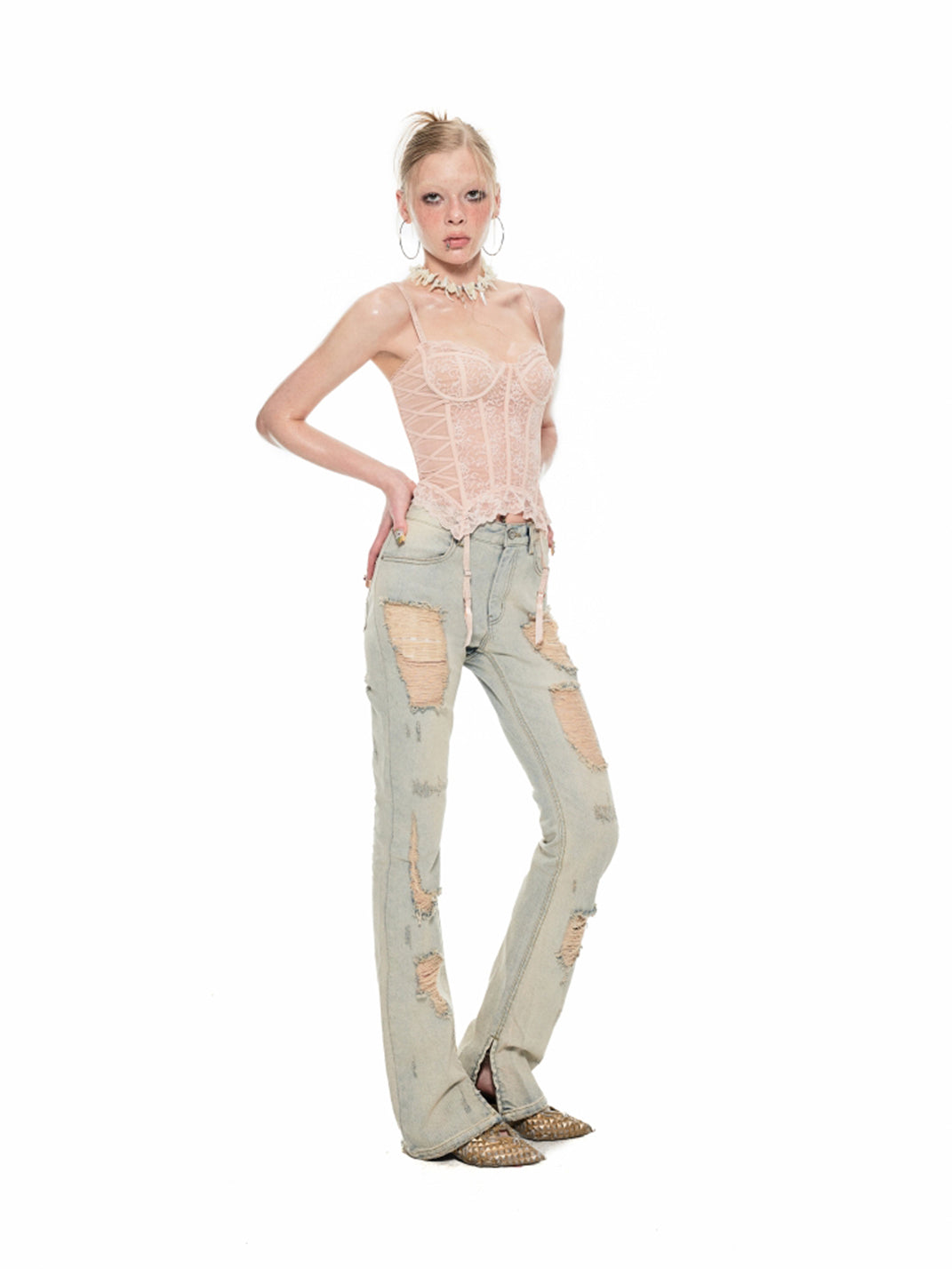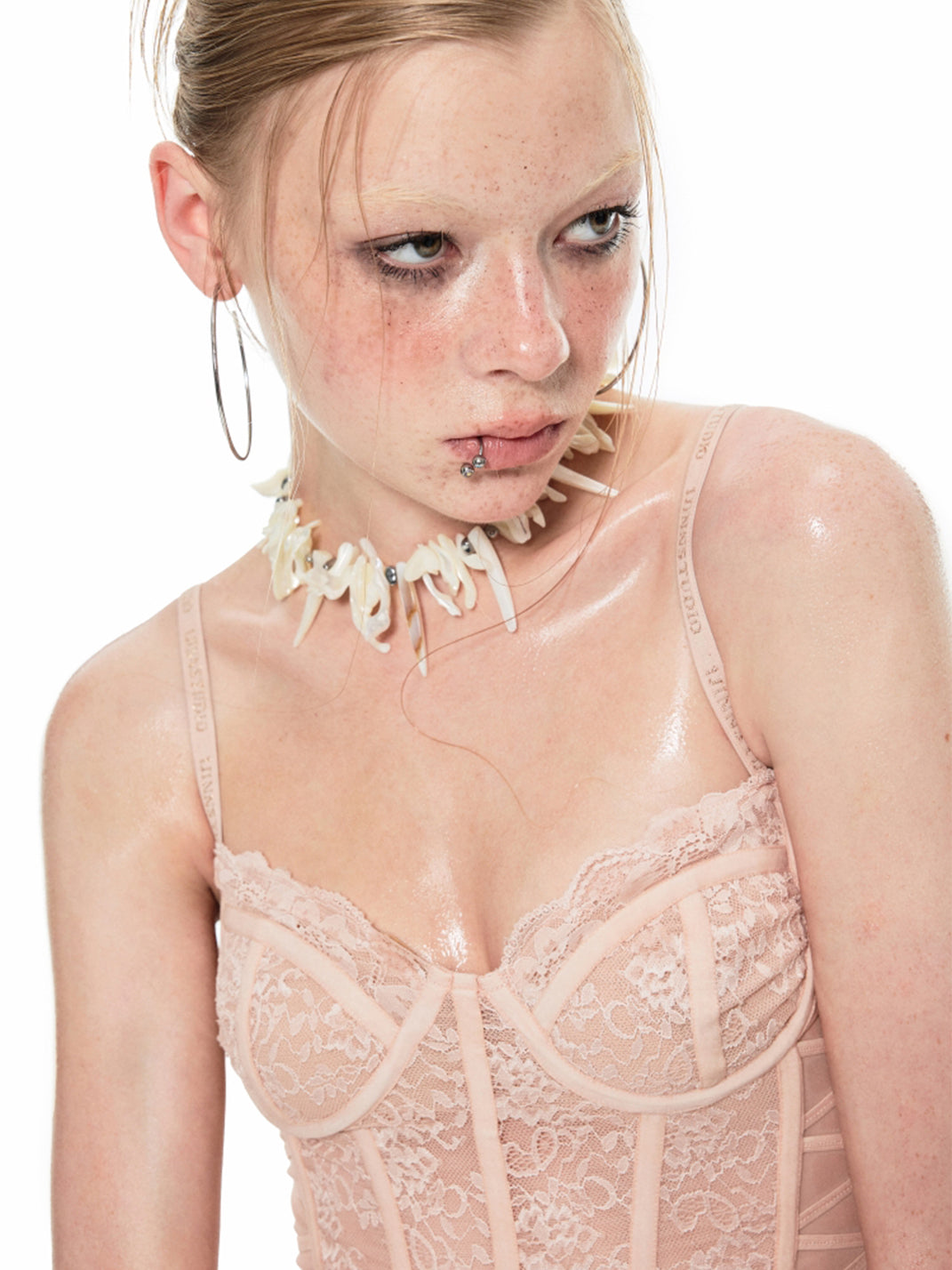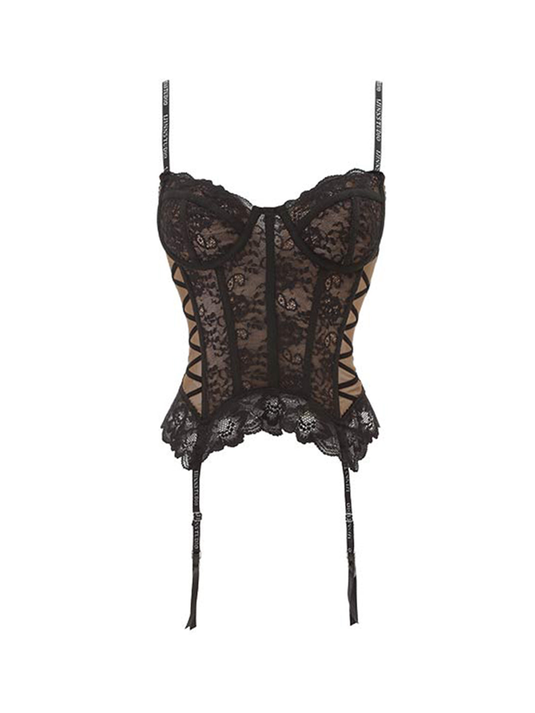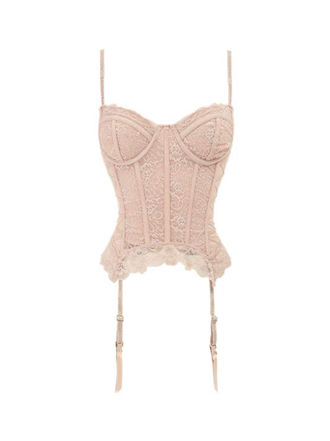 Crafted from premium stretch lace featuring delicate, openwork floral patterns, the bustier exudes an inherently romantic charm.