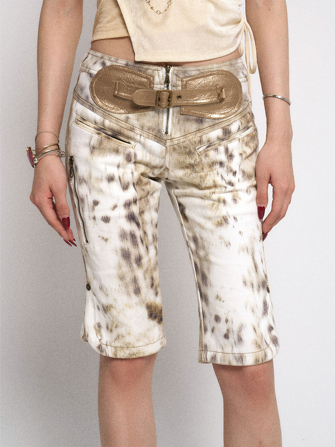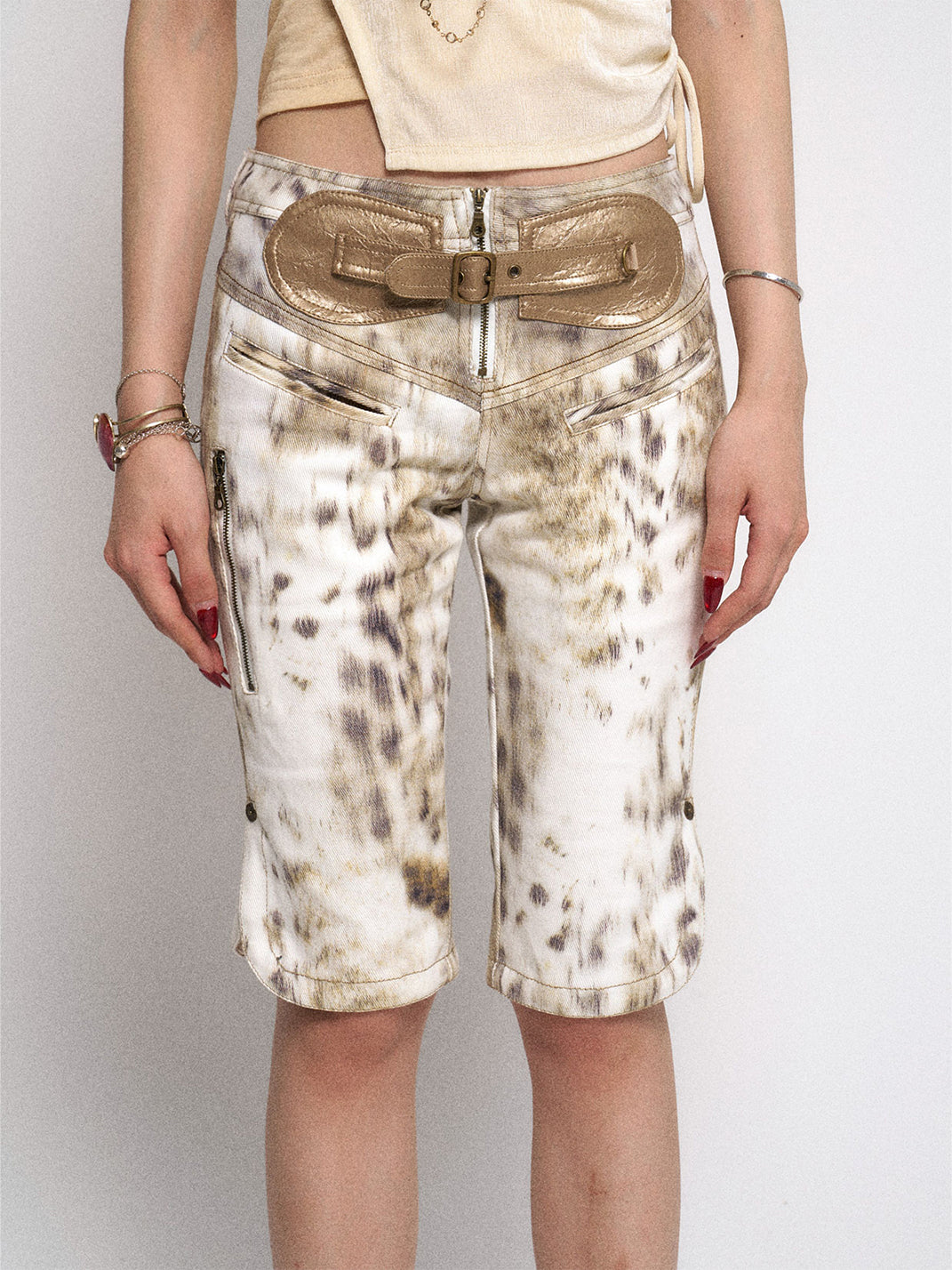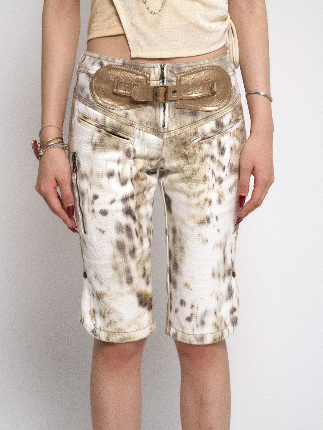 Flowers birds Market | Ombre Leopard Denim PU Belted Slim Shorts Skip to content