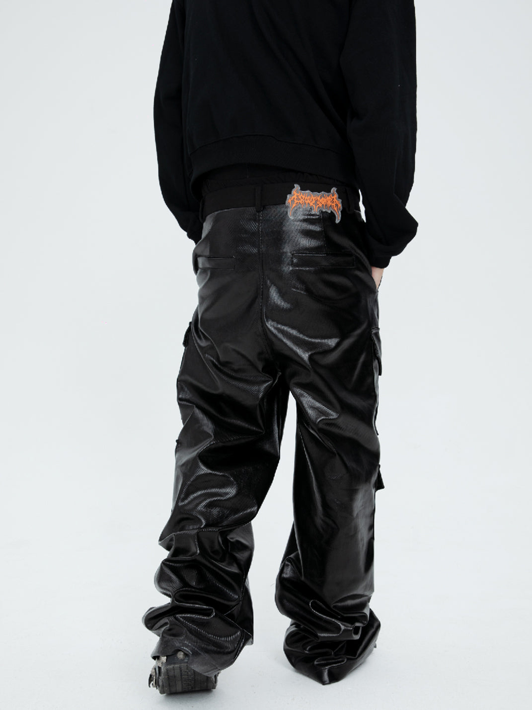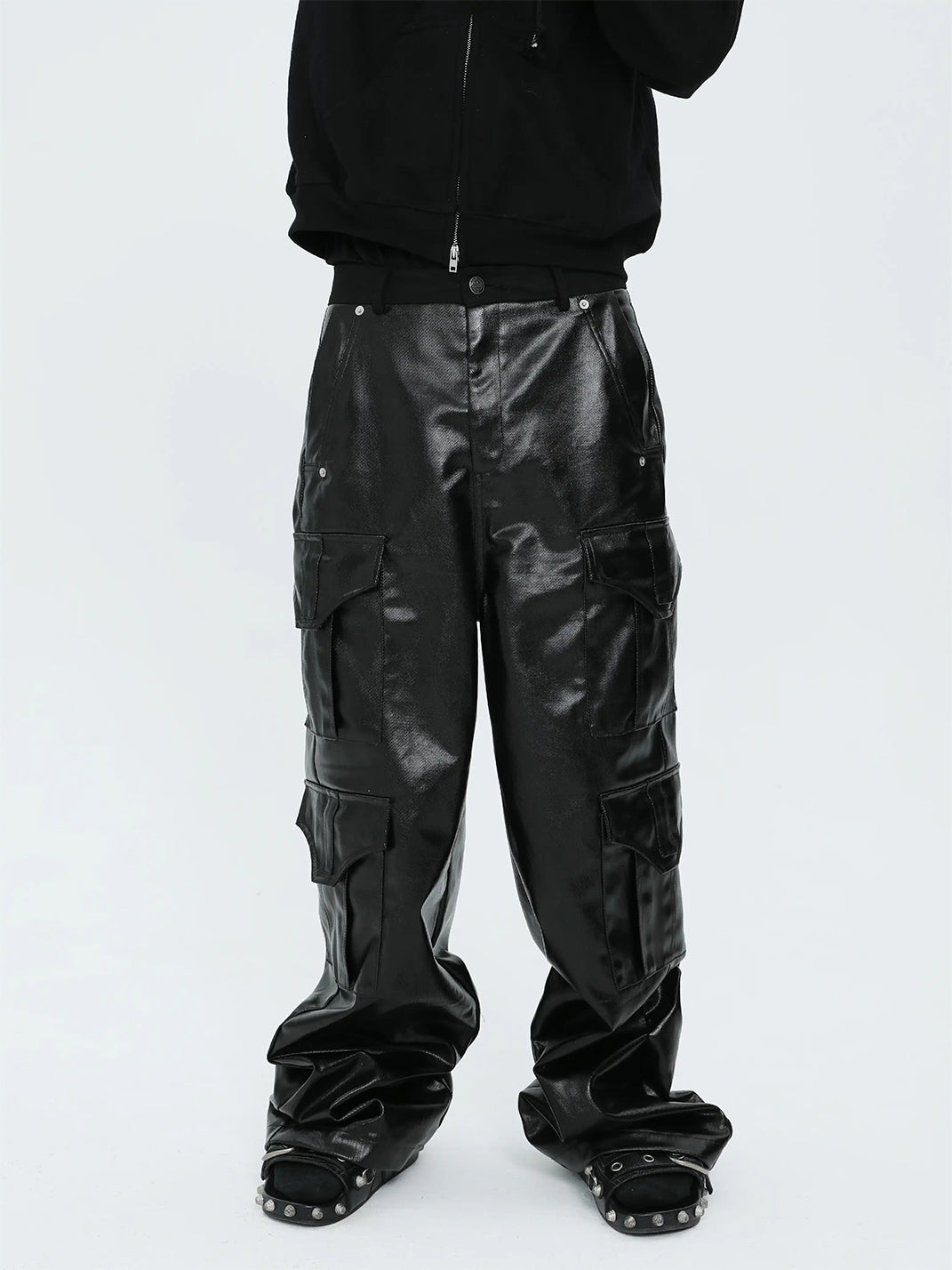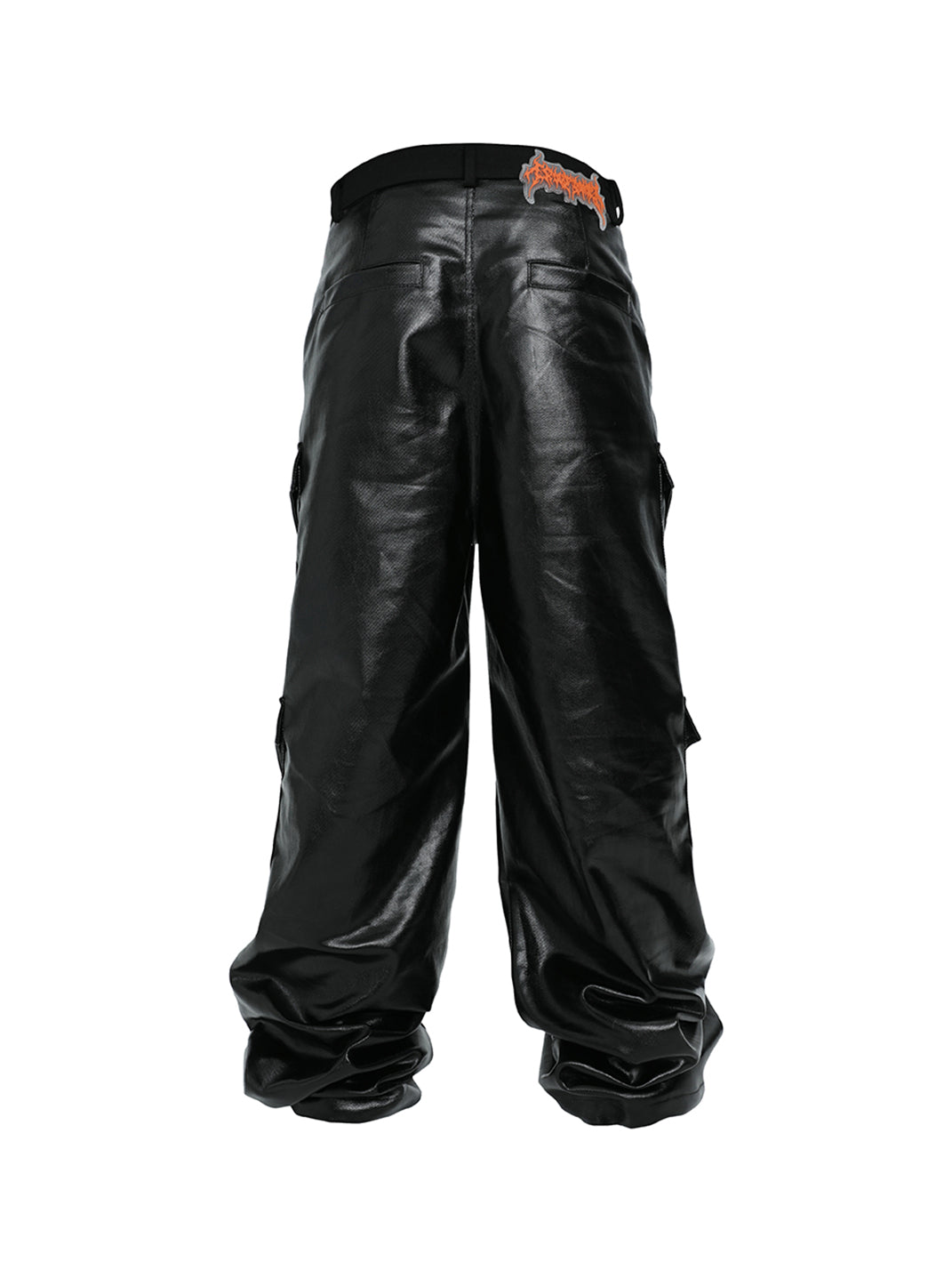 Featuring a sleek glossy coating, these pants combine modern style with functional design. Hidden snap closures maintain a clean, streamlined front, while a custom leather-and-rubber brand patch adds a distinctive finishing touch. Tailored in the signature GMKCRAGO fit, they offer a contemporary silhouette with a subtle utilitarian edge.