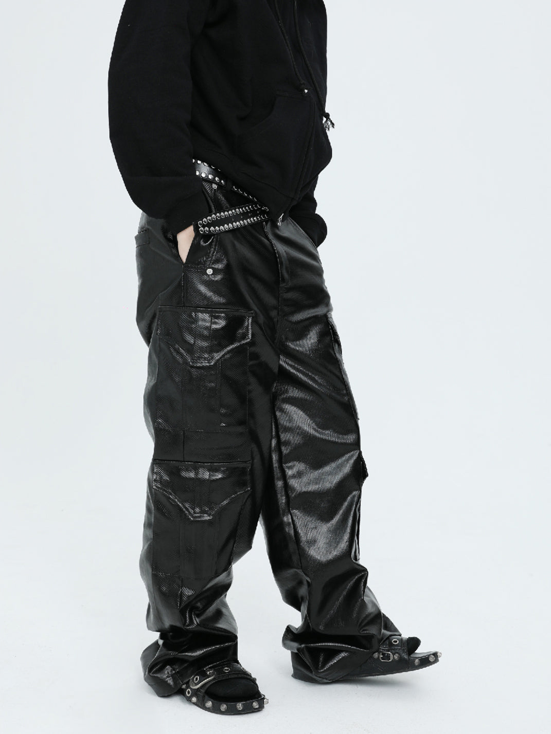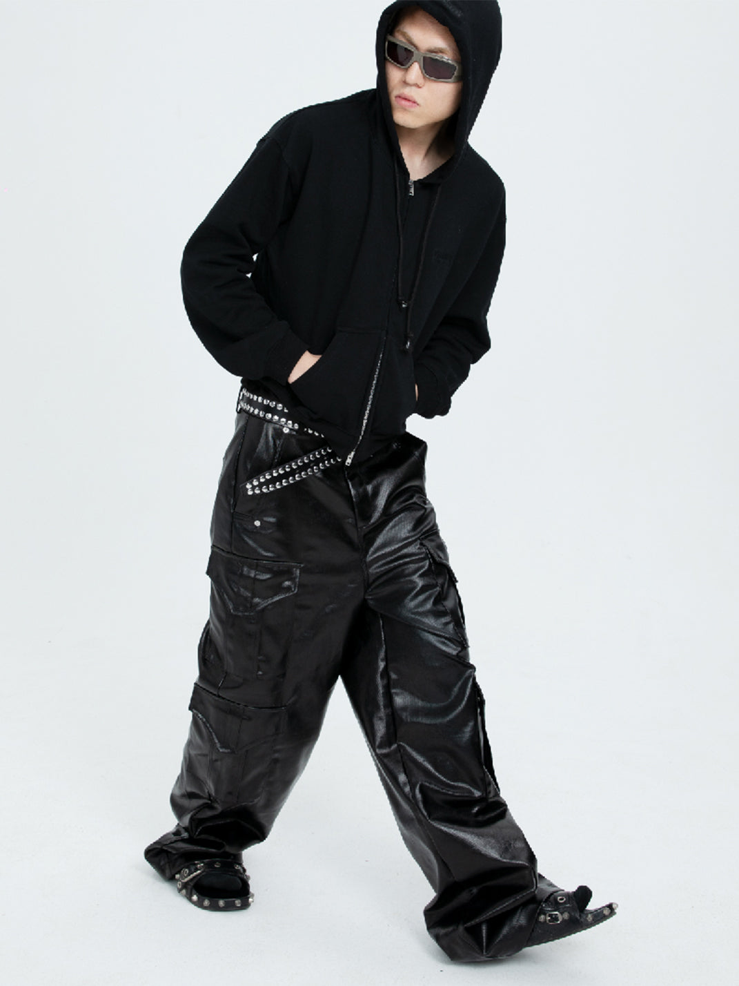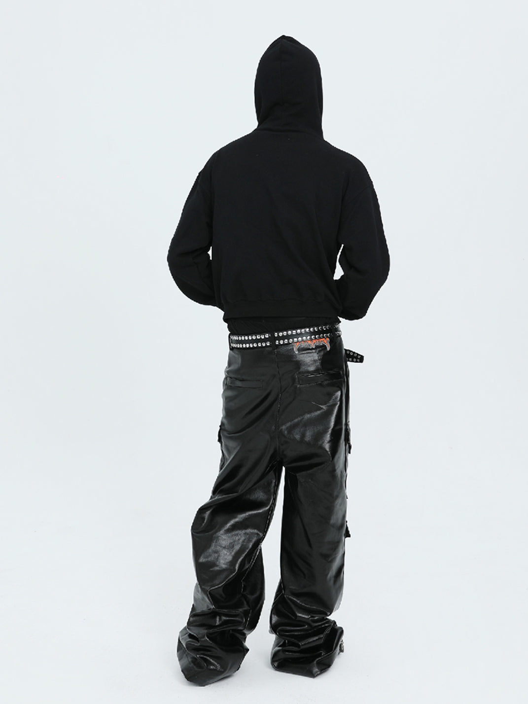 Featuring a sleek glossy coating, these pants combine modern style with functional design. Hidden snap closures maintain a clean, streamlined front, while a custom leather-and-rubber brand patch adds a distinctive finishing touch. Tailored in the signature GMKCRAGO fit, they offer a contemporary silhouette with a subtle utilitarian edge.
