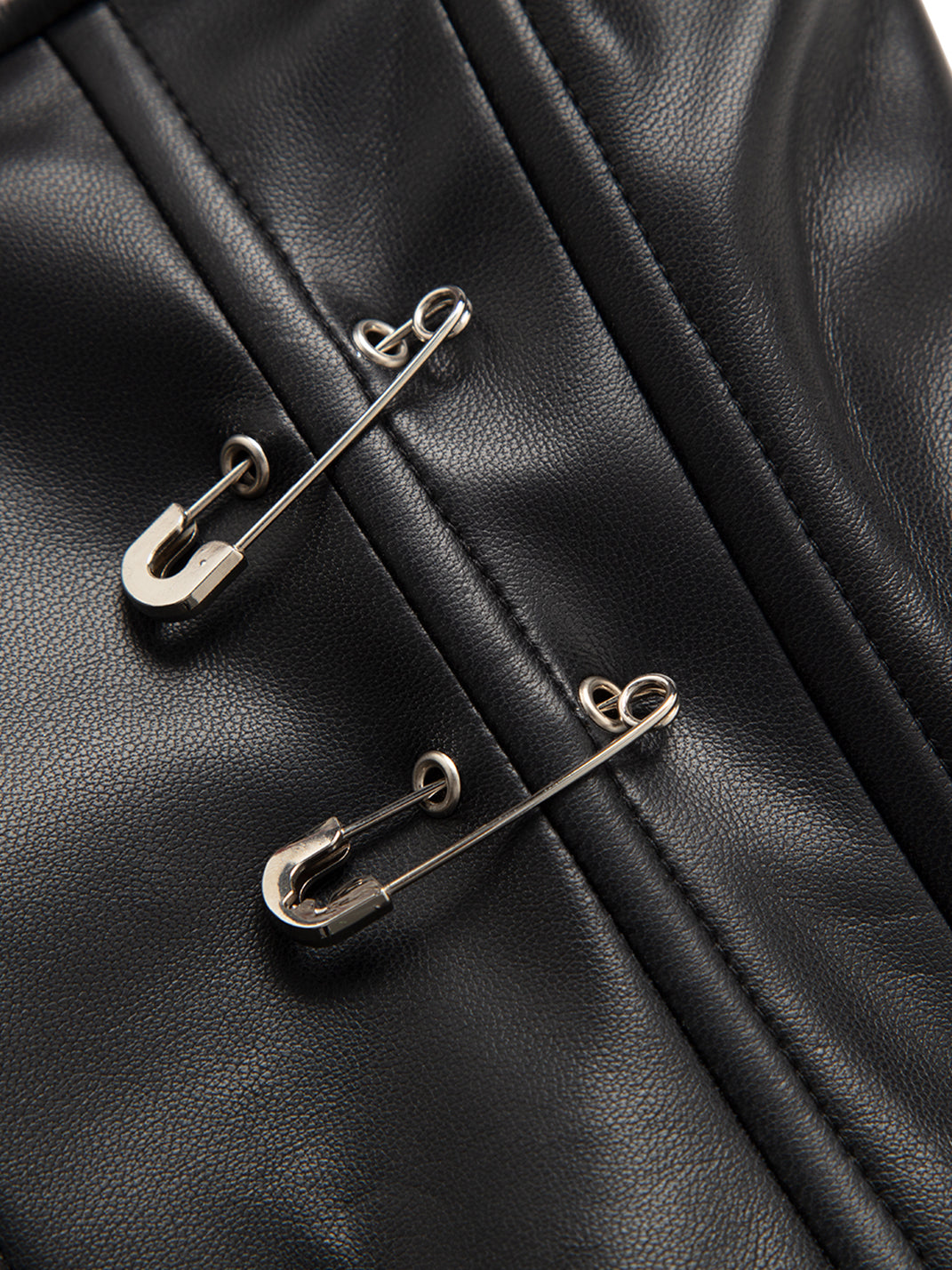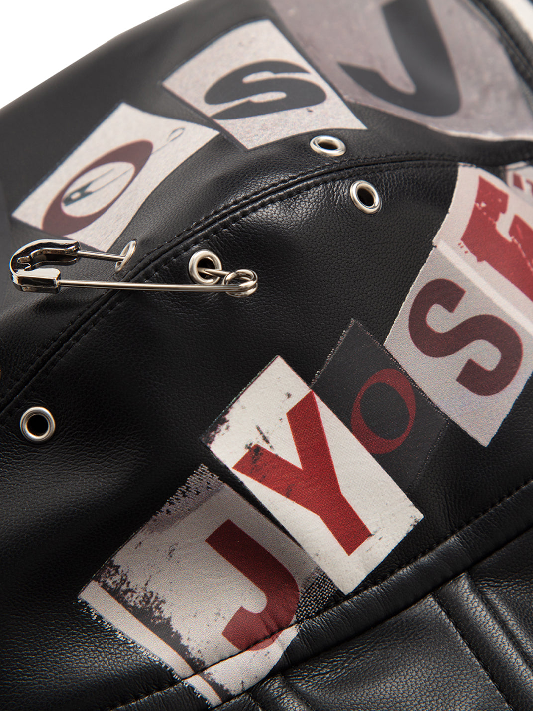 Front and back panels are decorated with striking red-and-black contrast prints, while grommet and safety-pin details lend a bold, edgy finish.