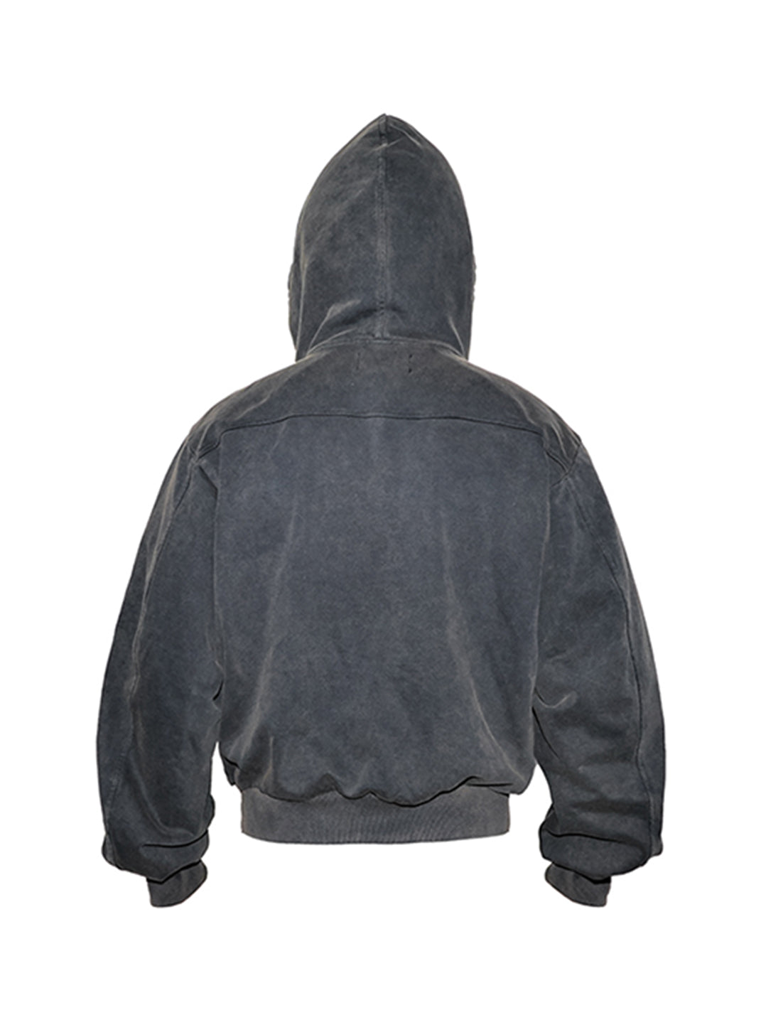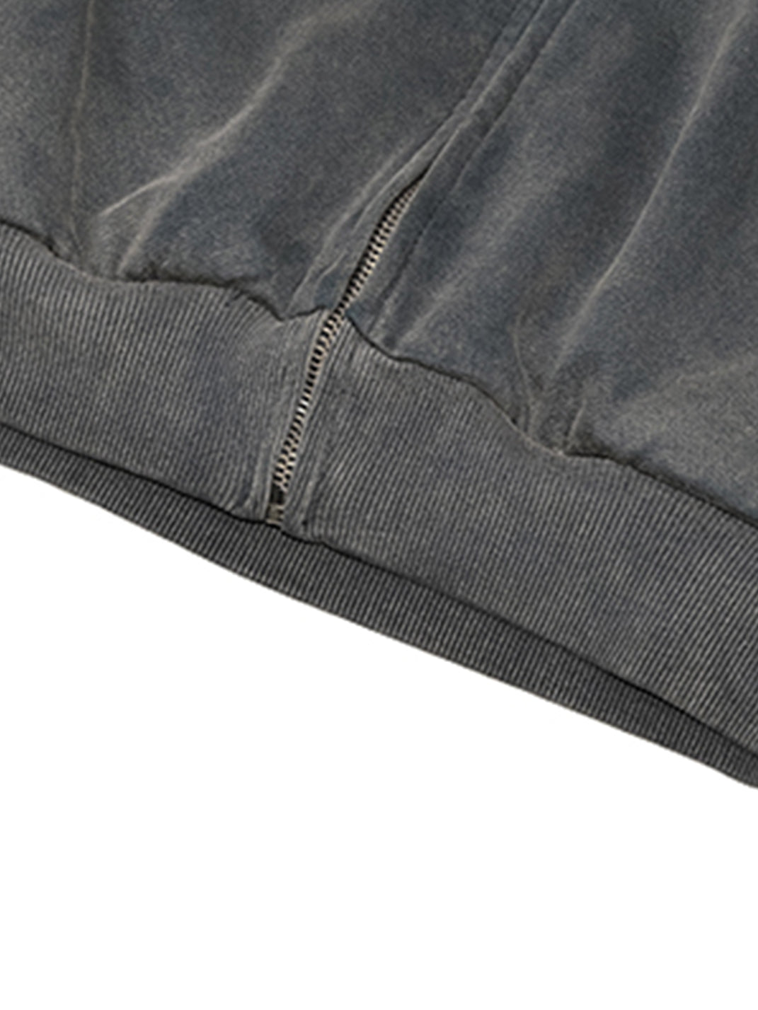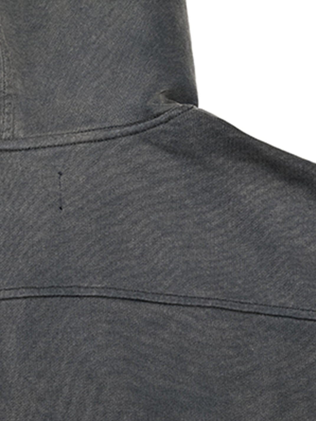 A washed blue base reveals a subtle warm-toned, brushed texture that feels luxuriously soft to the touch. The combination of high-resolution digital direct printing and a dense, chest-spanning embroidery adds exceptional depth and dimension. Designed in a classic boxy cropped sweatshirt silhouette, this piece offers generous ease of movement while naturally enhancing overall body proportions for a refined yet relaxed look.