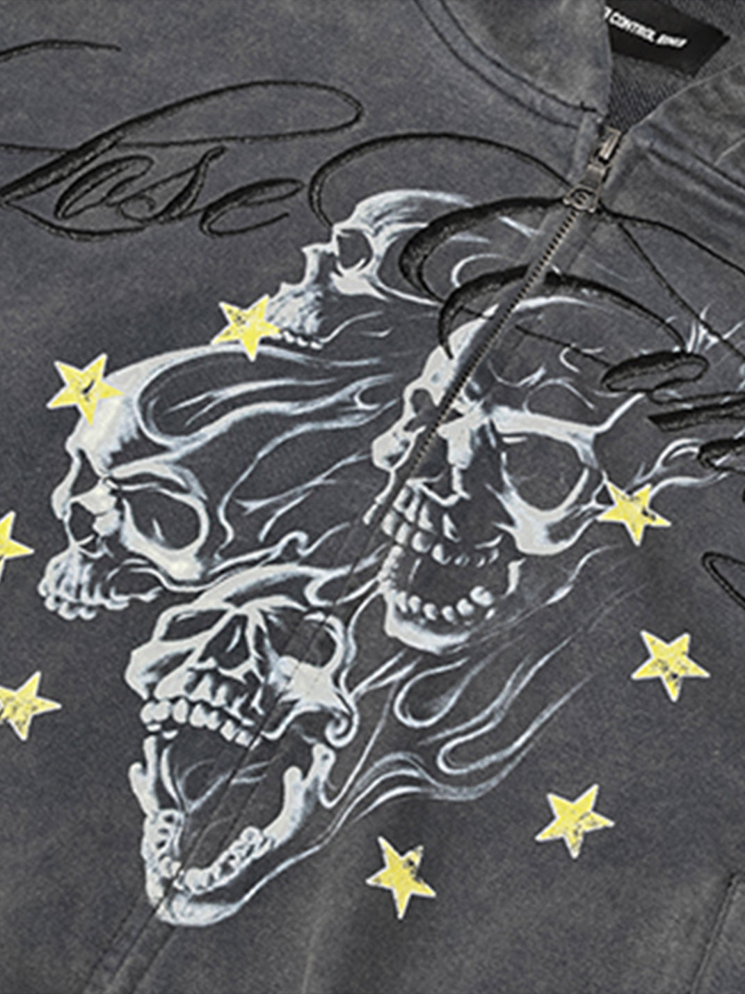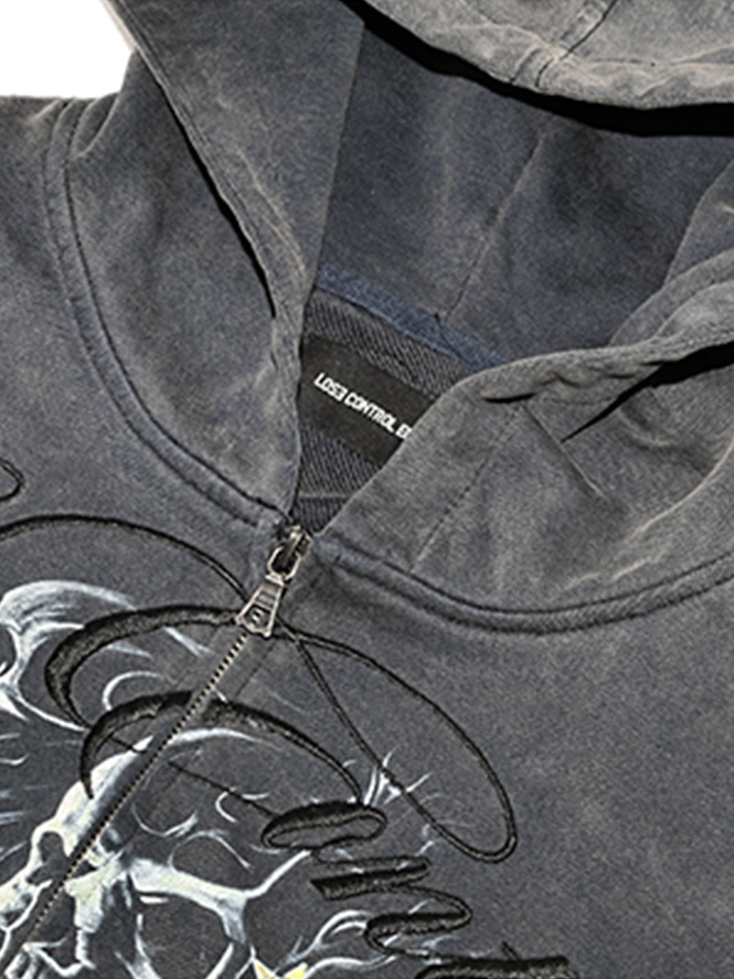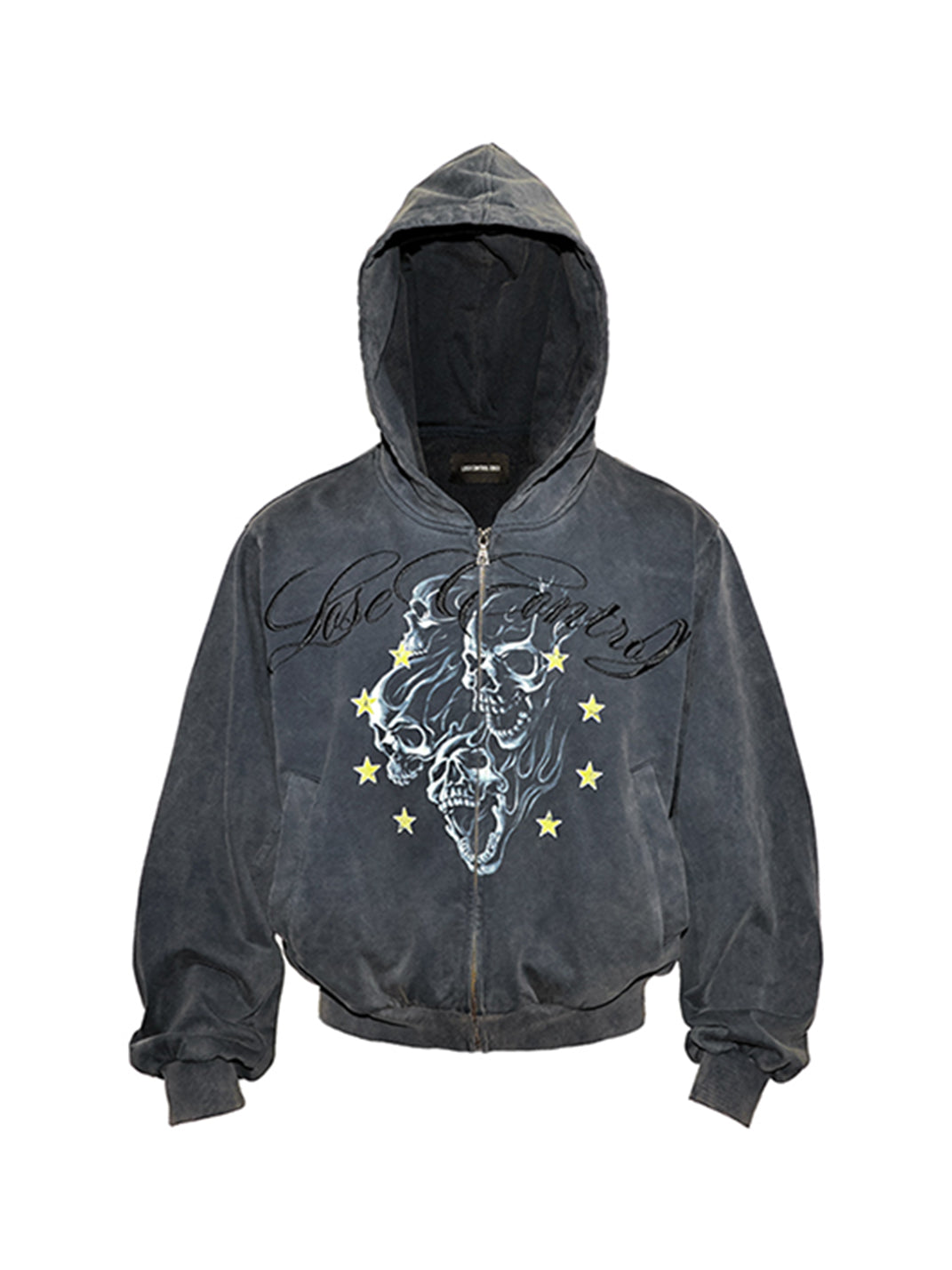 A washed blue base reveals a subtle warm-toned, brushed texture that feels luxuriously soft to the touch. The combination of high-resolution digital direct printing and a dense, chest-spanning embroidery adds exceptional depth and dimension. Designed in a classic boxy cropped sweatshirt silhouette, this piece offers generous ease of movement while naturally enhancing overall body proportions for a refined yet relaxed look.