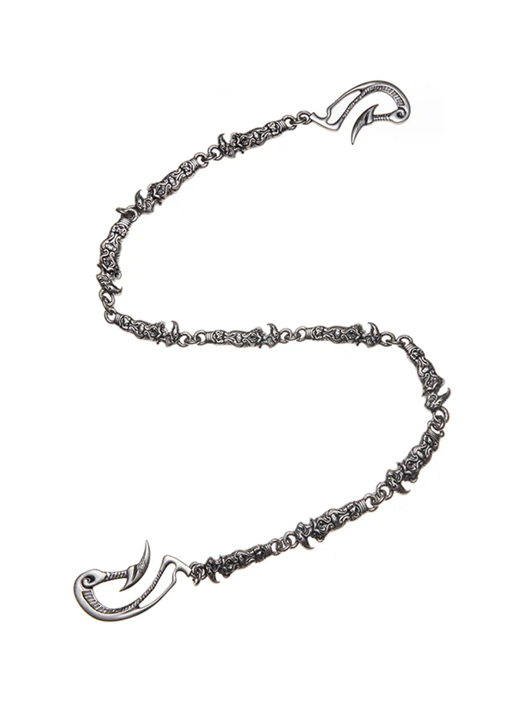 This signature pant chain features an intricately sculpted eagle claw hook, both independently 3D-modeled and precision-milled on imported machinery. Crafted from custom copper–zinc alloy, the design seamlessly fuses “bone claw,” “vulture,” and “totem” motifs into a single detailed form. Every contour and groove is finely articulated, including the claw slots, allowing versatile pairing with other chains and accessories. Each piece carries exclusive brand engravings for authenticity and collectible value.