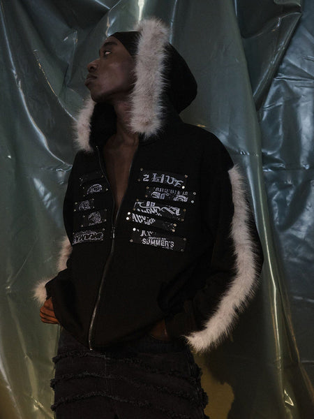 Recover Zone | Faux Fur Trim Graphic Zip-Up Hoodie