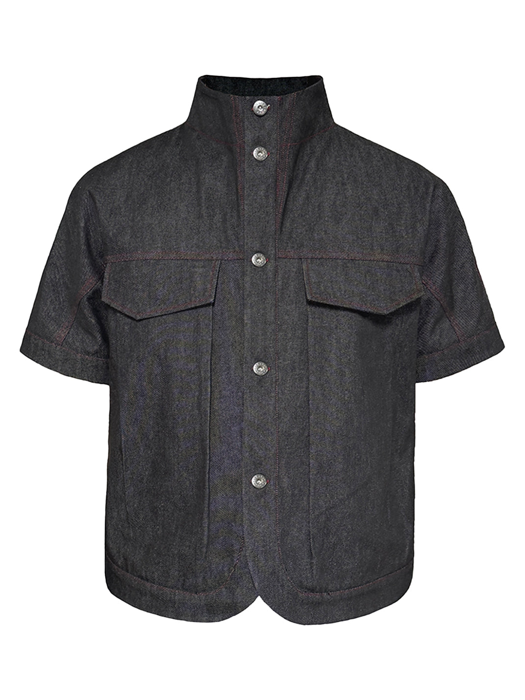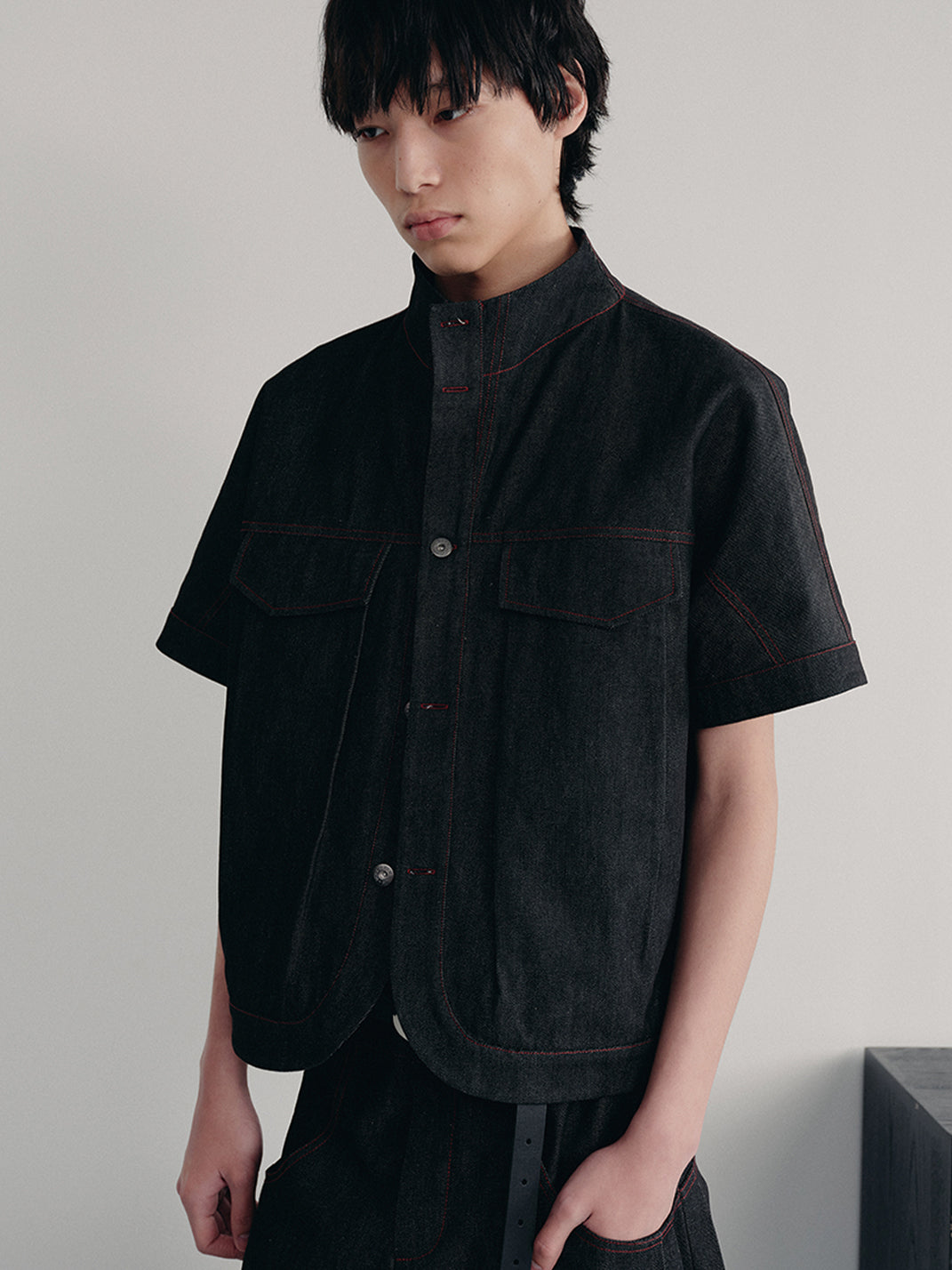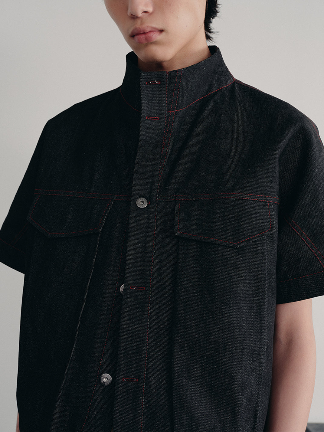 JCAESAR STUDIO | Boxy Fit Curved Hem Stand Collar Denim Shirt Skip to content