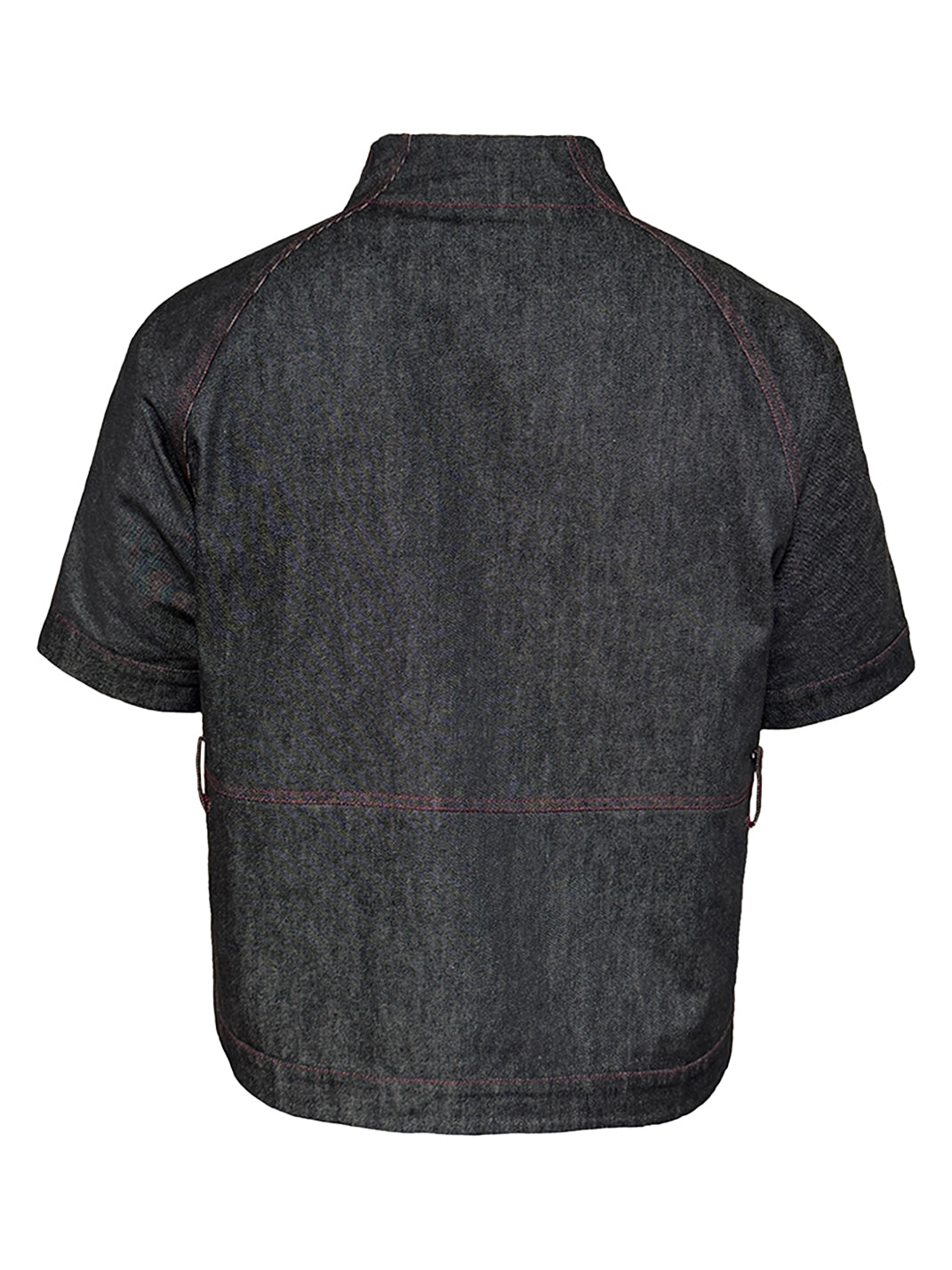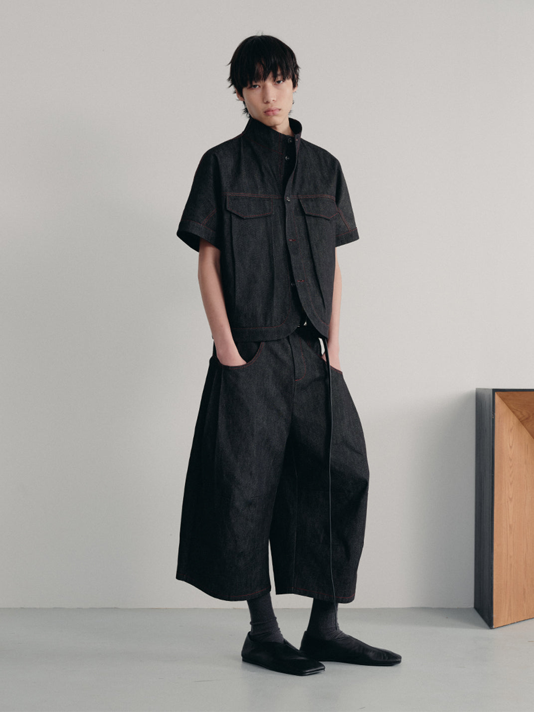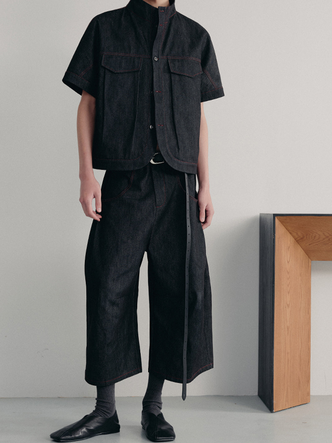JCAESAR STUDIO | Boxy Fit Curved Hem Stand Collar Denim Shirt Skip to content