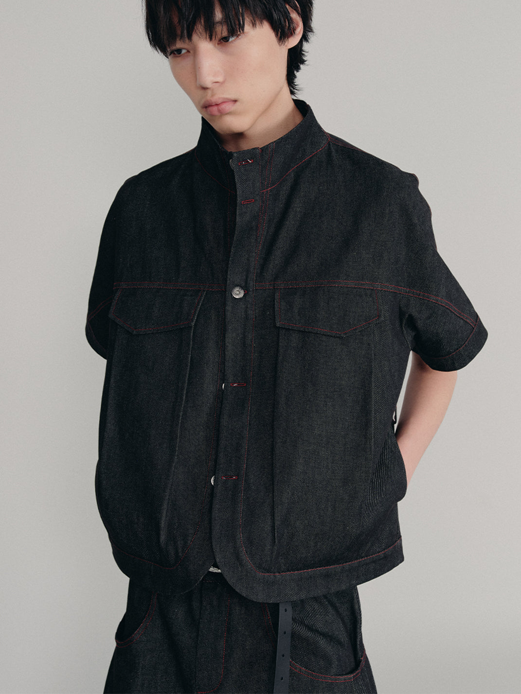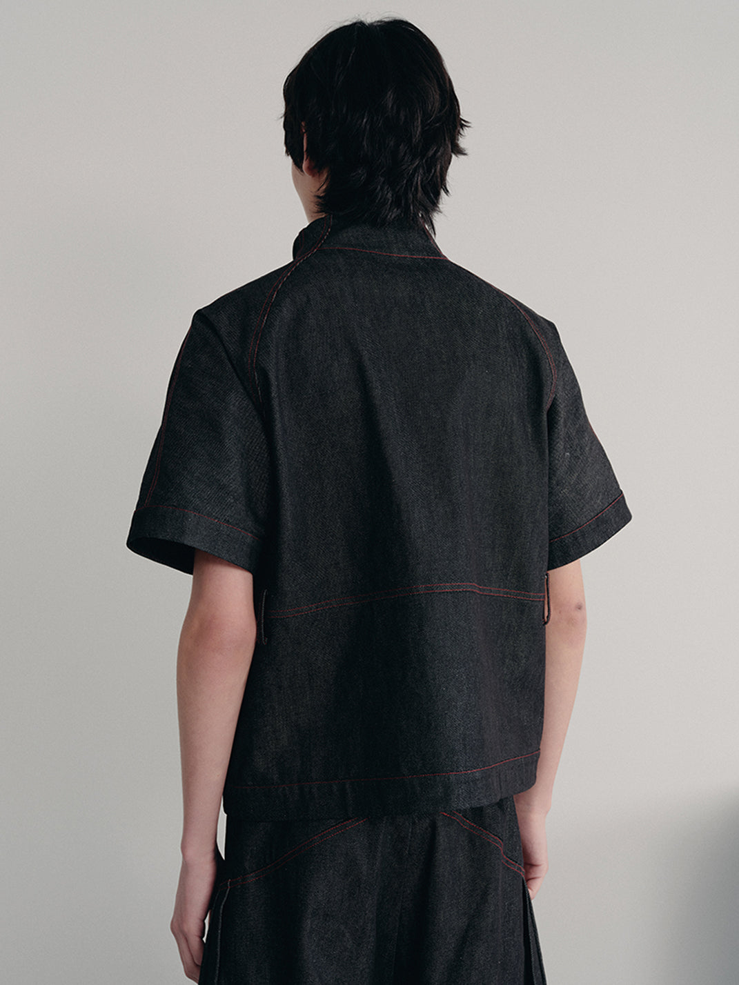 JCAESAR STUDIO | Boxy Fit Curved Hem Stand Collar Denim Shirt