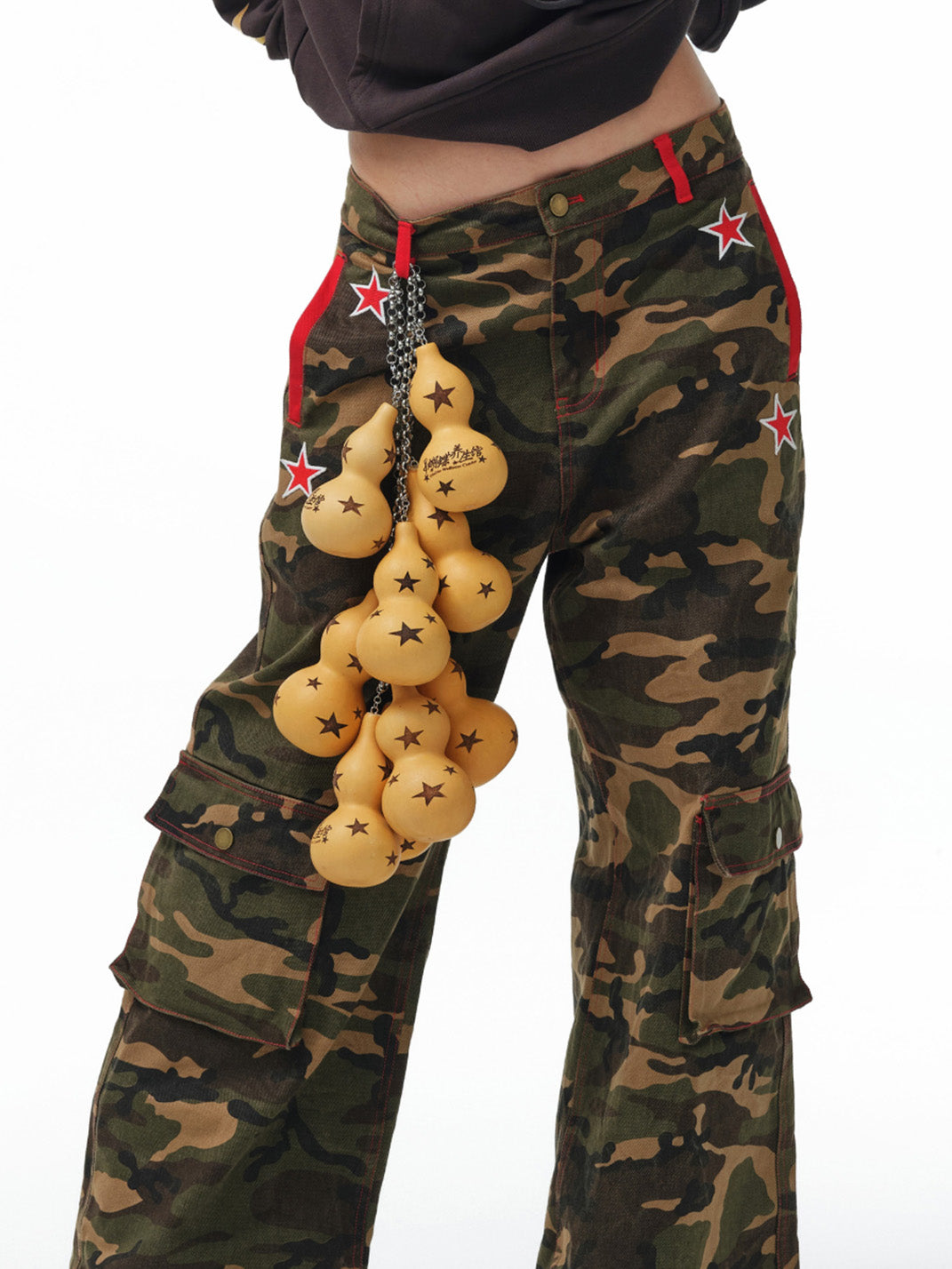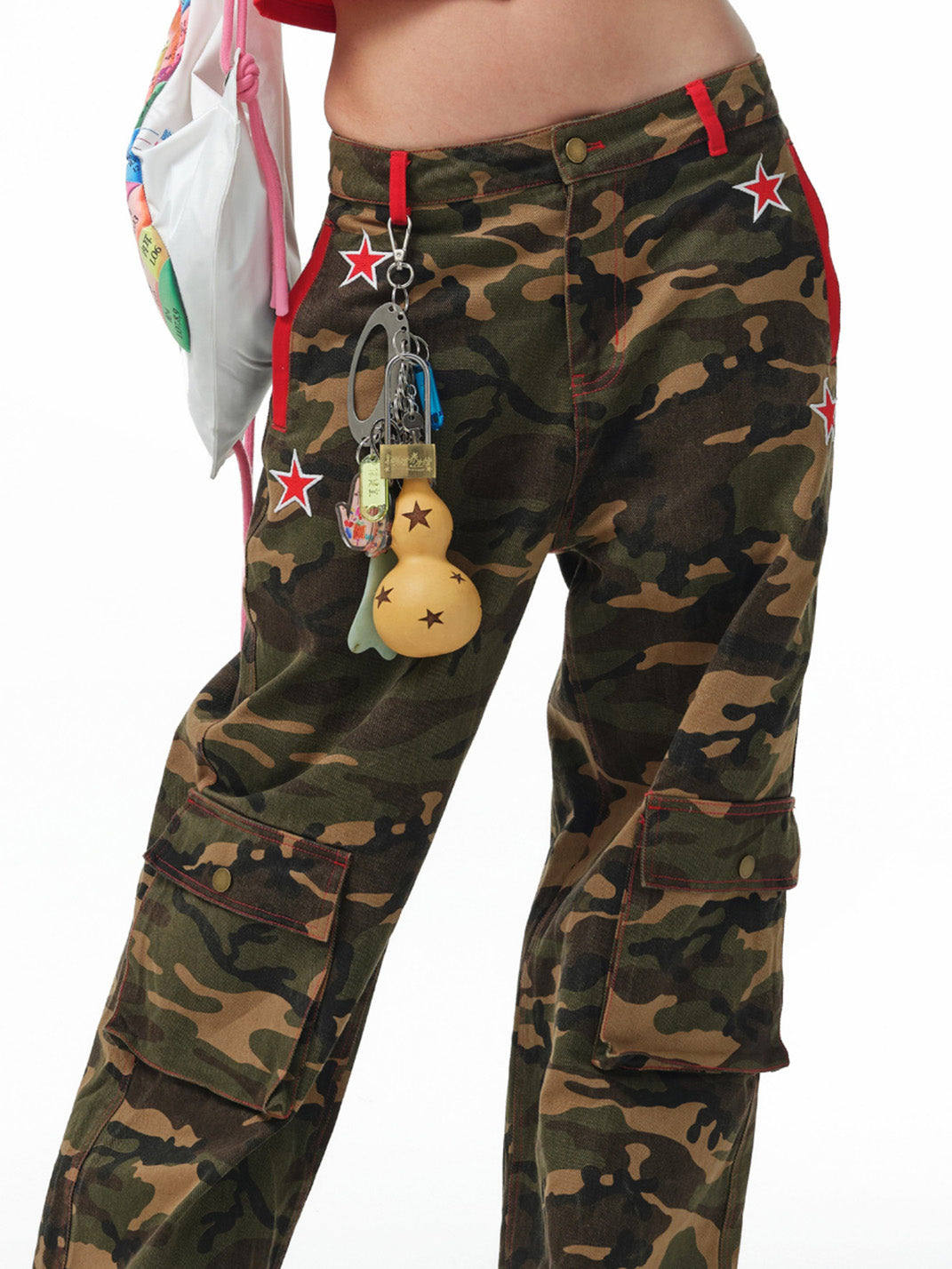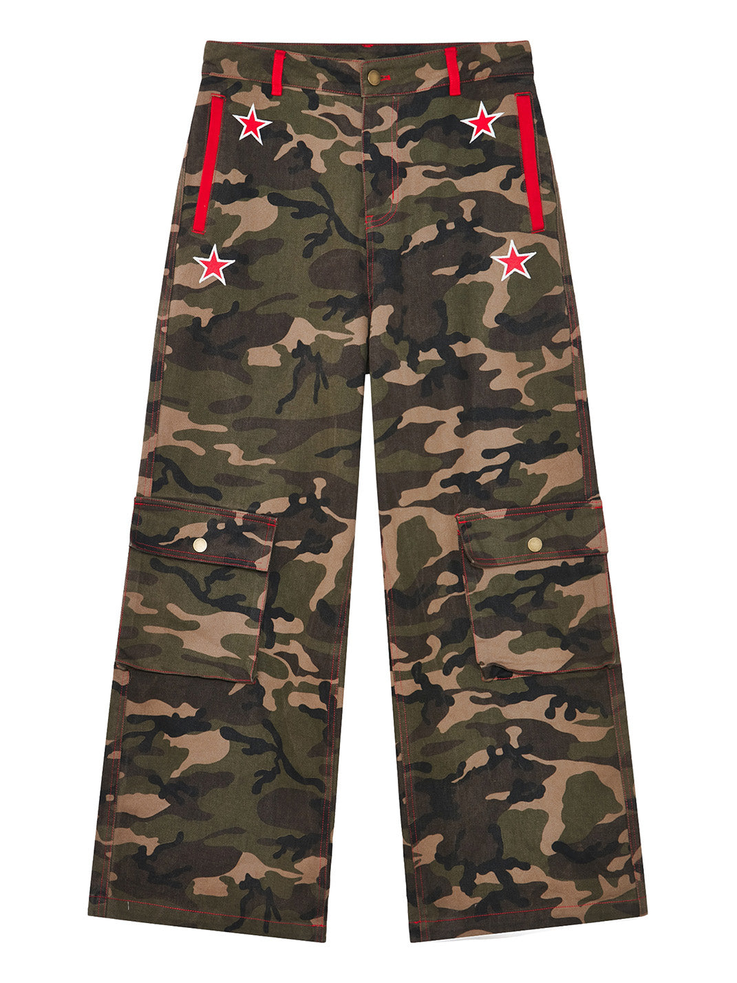 Made from heavy-weight pure cotton camo denim, perfect for all seasons; features star embroidery and double-stitch detailing at the seams for extra style points.