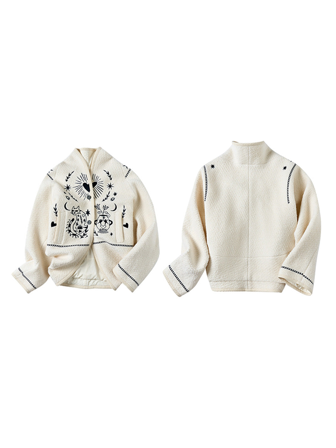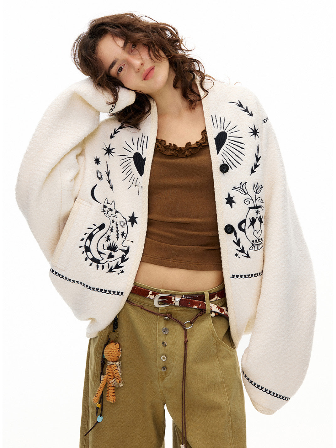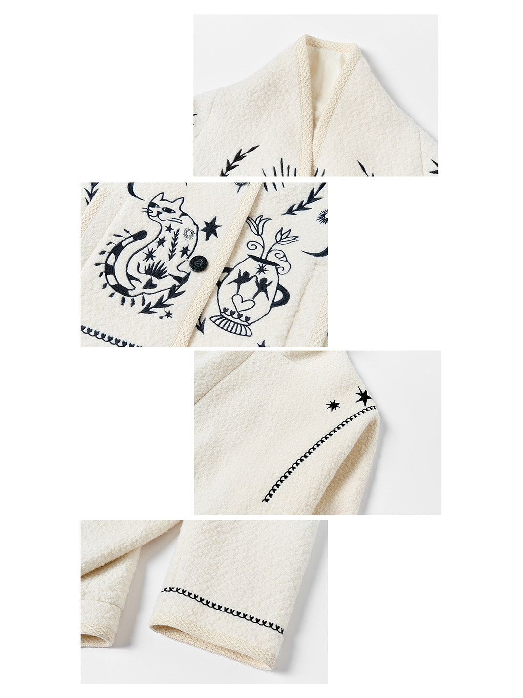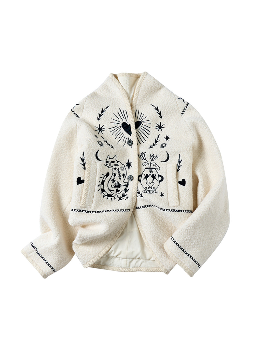This jacket features a short silhouette, ending at the waistline, with loose batwing sleeves and a tapered hem, creating a natural contrast between volume and definition. Instead of a traditional lapel, it boasts a widened, straight neckline. The overall structure is simple, yet the large neckline and sleeve design create a striking visual impact. The design utilizes heavy black embroidery. The left pocket features a playful cat motif, while the right side combines vase, floral, and heart elements. The chest is adorned with radiating sun rays, moon, and star symbols, representing mystery and energy. Symmetrical geometric embroidery at the cuffs and hem creates a border-like design, adding an artistic touch. The fabric is a thick boucle wool blend with a warm, velvety feel, ensuring both warmth and a soft touch. The natural elasticity and fluffiness of the wool create a more structured and full silhouette while providing a comfortable wearing experience. With off-white as the base color, the black embroidery creates a striking visual contrast, giving the pattern a stronger visual impact.