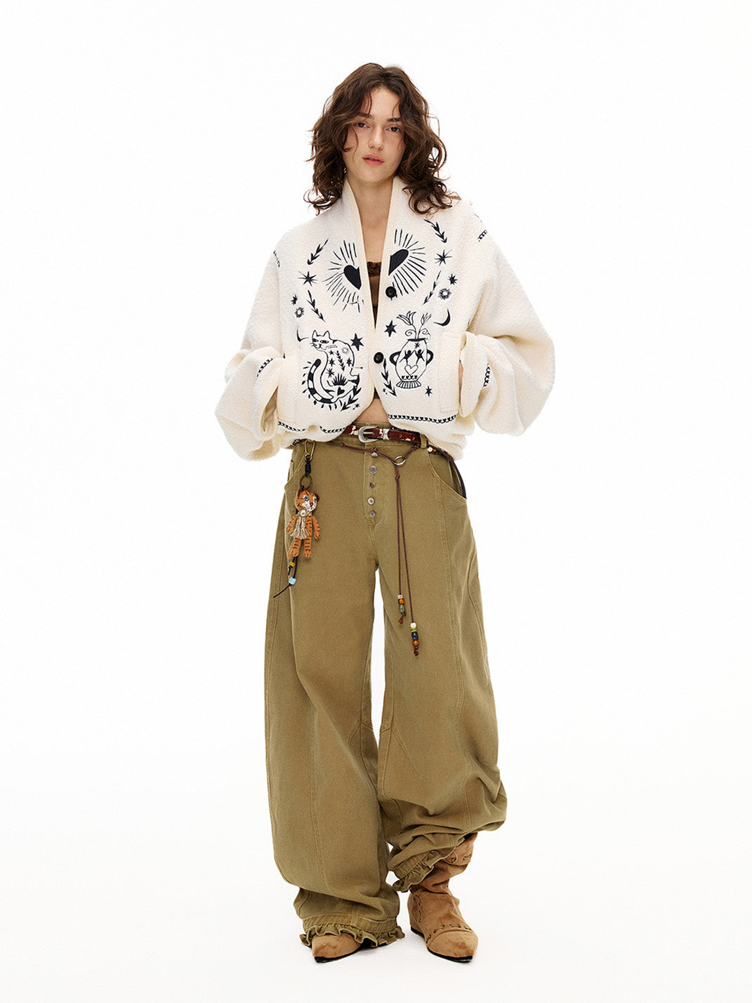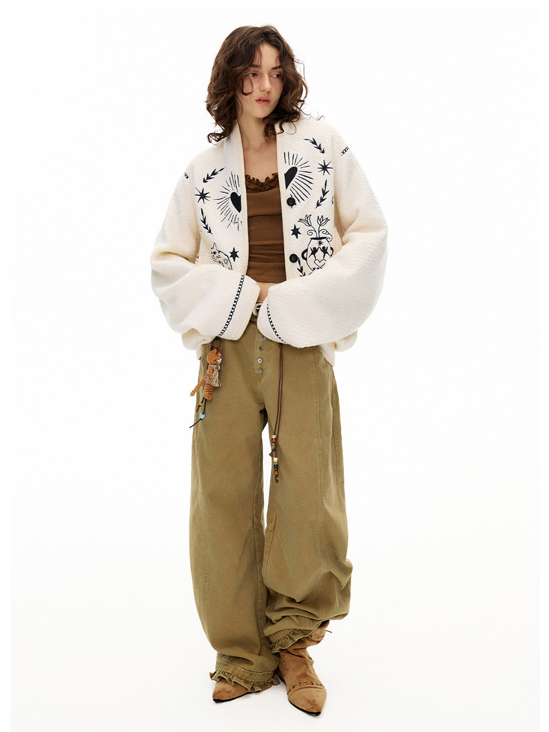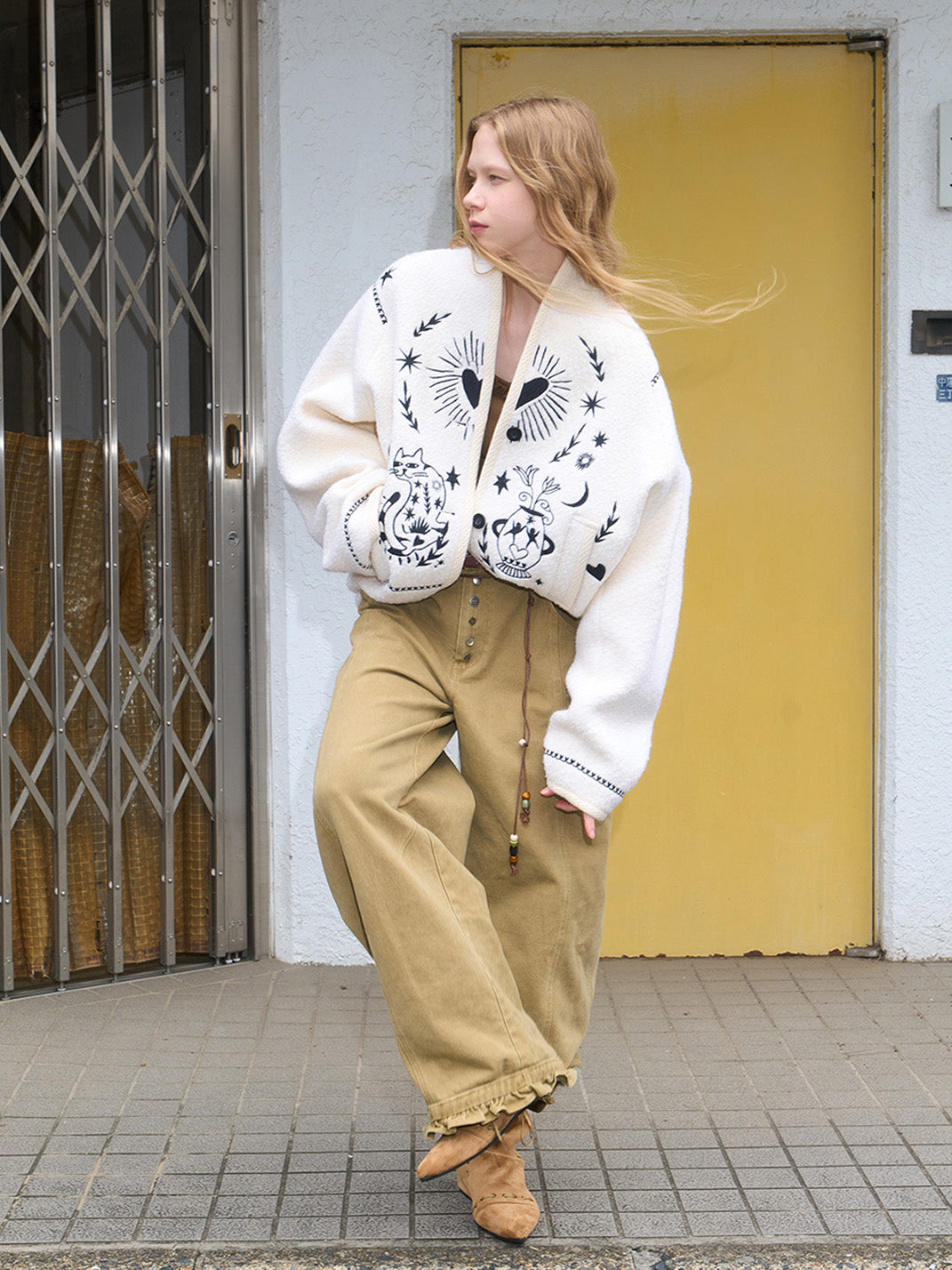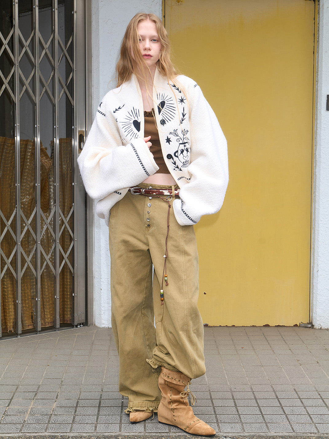 This jacket features a short silhouette, ending at the waistline, with loose batwing sleeves and a tapered hem, creating a natural contrast between volume and definition. Instead of a traditional lapel, it boasts a widened, straight neckline. The overall structure is simple, yet the large neckline and sleeve design create a striking visual impact. The design utilizes heavy black embroidery. The left pocket features a playful cat motif, while the right side combines vase, floral, and heart elements. The chest is adorned with radiating sun rays, moon, and star symbols, representing mystery and energy. Symmetrical geometric embroidery at the cuffs and hem creates a border-like design, adding an artistic touch. The fabric is a thick boucle wool blend with a warm, velvety feel, ensuring both warmth and a soft touch. The natural elasticity and fluffiness of the wool create a more structured and full silhouette while providing a comfortable wearing experience. With off-white as the base color, the black embroidery creates a striking visual contrast, giving the pattern a stronger visual impact.