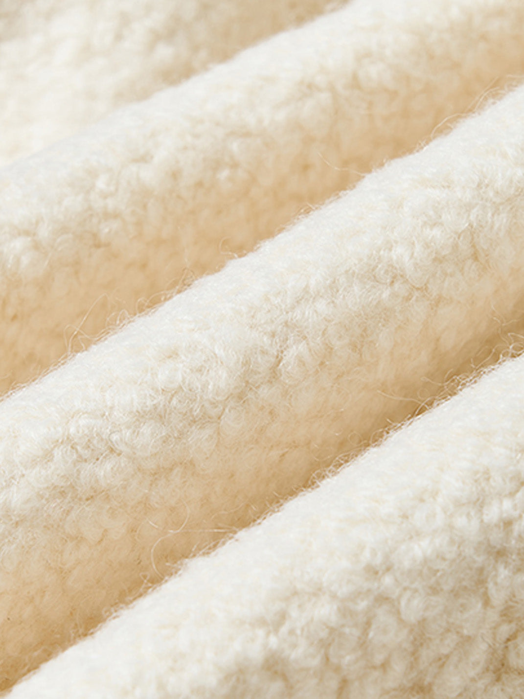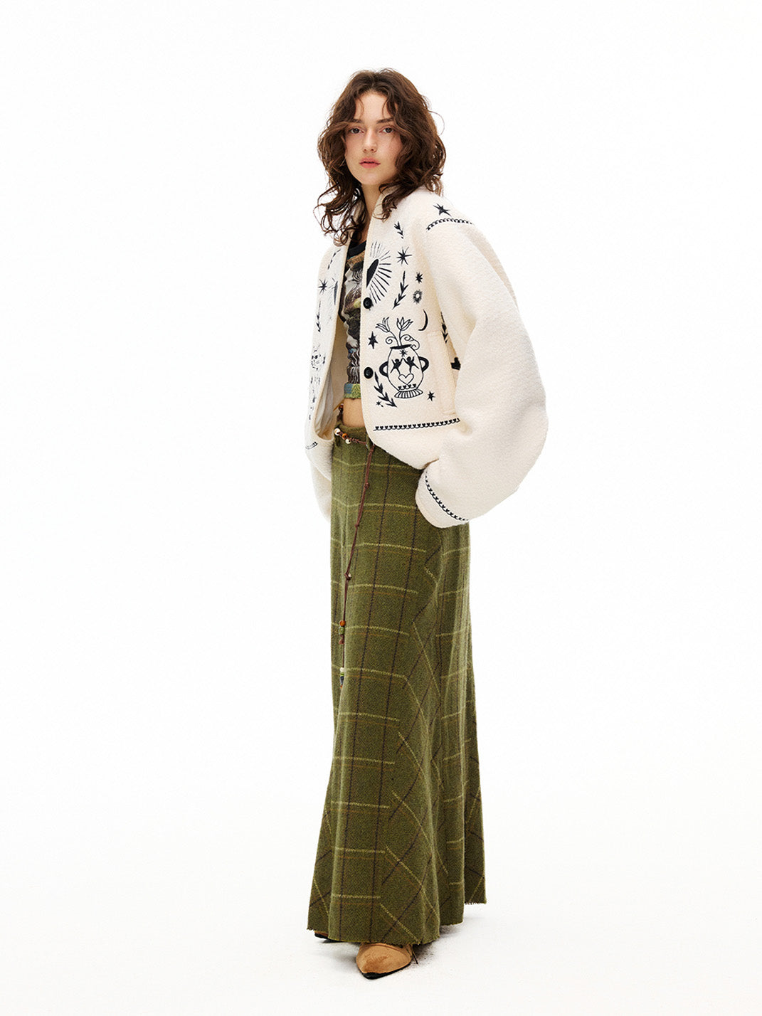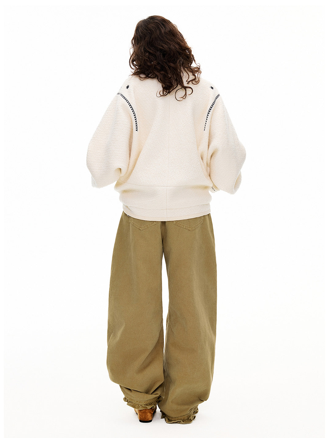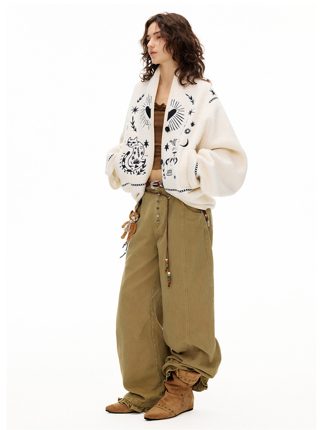This jacket features a short silhouette, ending at the waistline, with loose batwing sleeves and a tapered hem, creating a natural contrast between volume and definition. Instead of a traditional lapel, it boasts a widened, straight neckline. The overall structure is simple, yet the large neckline and sleeve design create a striking visual impact. The design utilizes heavy black embroidery. The left pocket features a playful cat motif, while the right side combines vase, floral, and heart elements. The chest is adorned with radiating sun rays, moon, and star symbols, representing mystery and energy. Symmetrical geometric embroidery at the cuffs and hem creates a border-like design, adding an artistic touch. The fabric is a thick boucle wool blend with a warm, velvety feel, ensuring both warmth and a soft touch. The natural elasticity and fluffiness of the wool create a more structured and full silhouette while providing a comfortable wearing experience. With off-white as the base color, the black embroidery creates a striking visual contrast, giving the pattern a stronger visual impact.